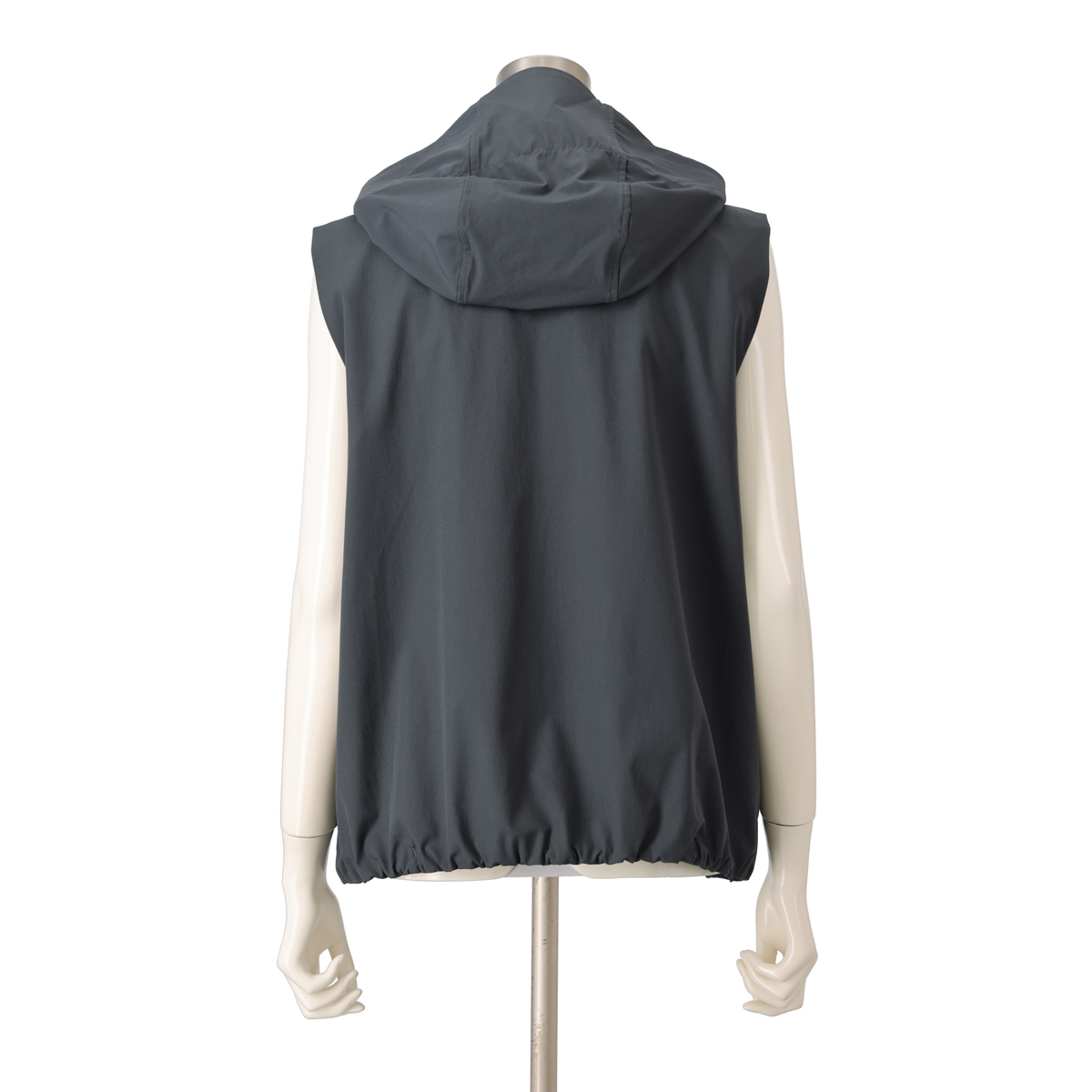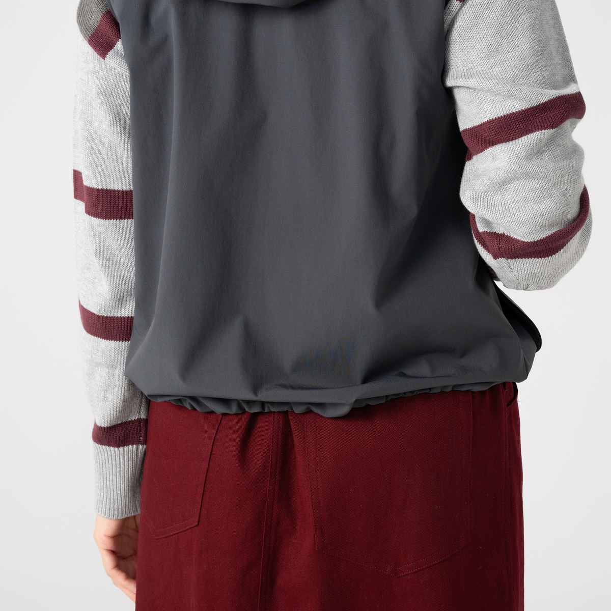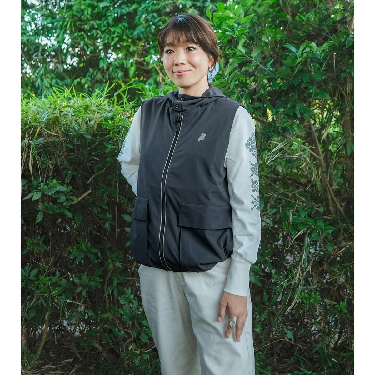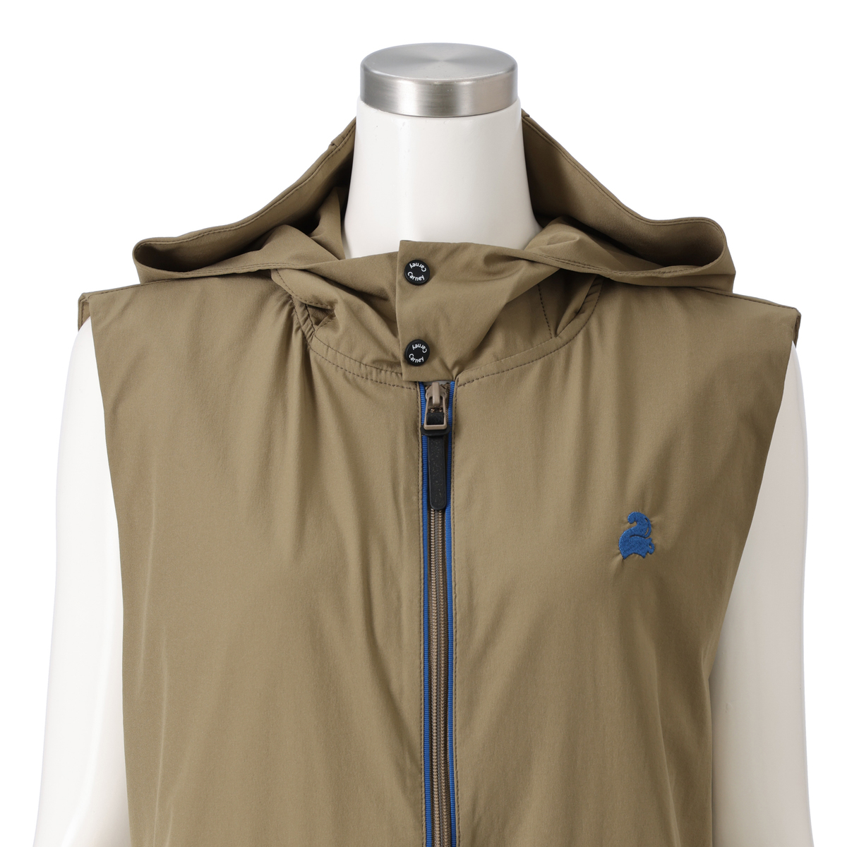 ベストのように羽織れるマウンテンパーカー。長い残暑の季節に合わせて、敢えて袖を無くしたスリーブレスのデザイン。幅広のひさしを付けたフードや、腰には上からも脇からも物を入れることができるポケットを備えています