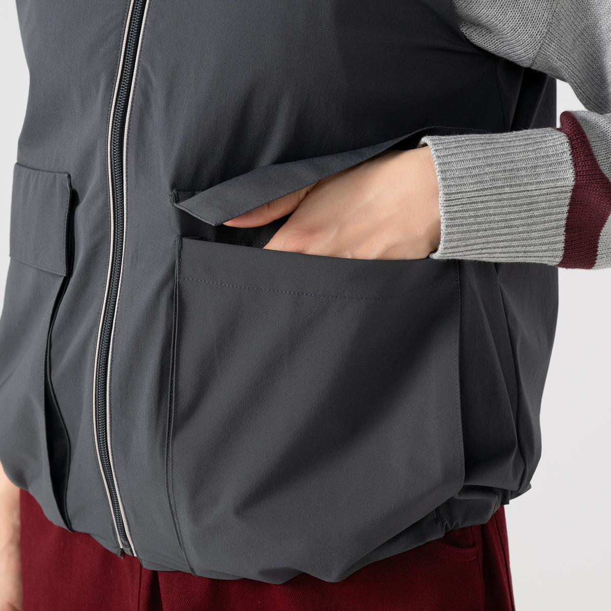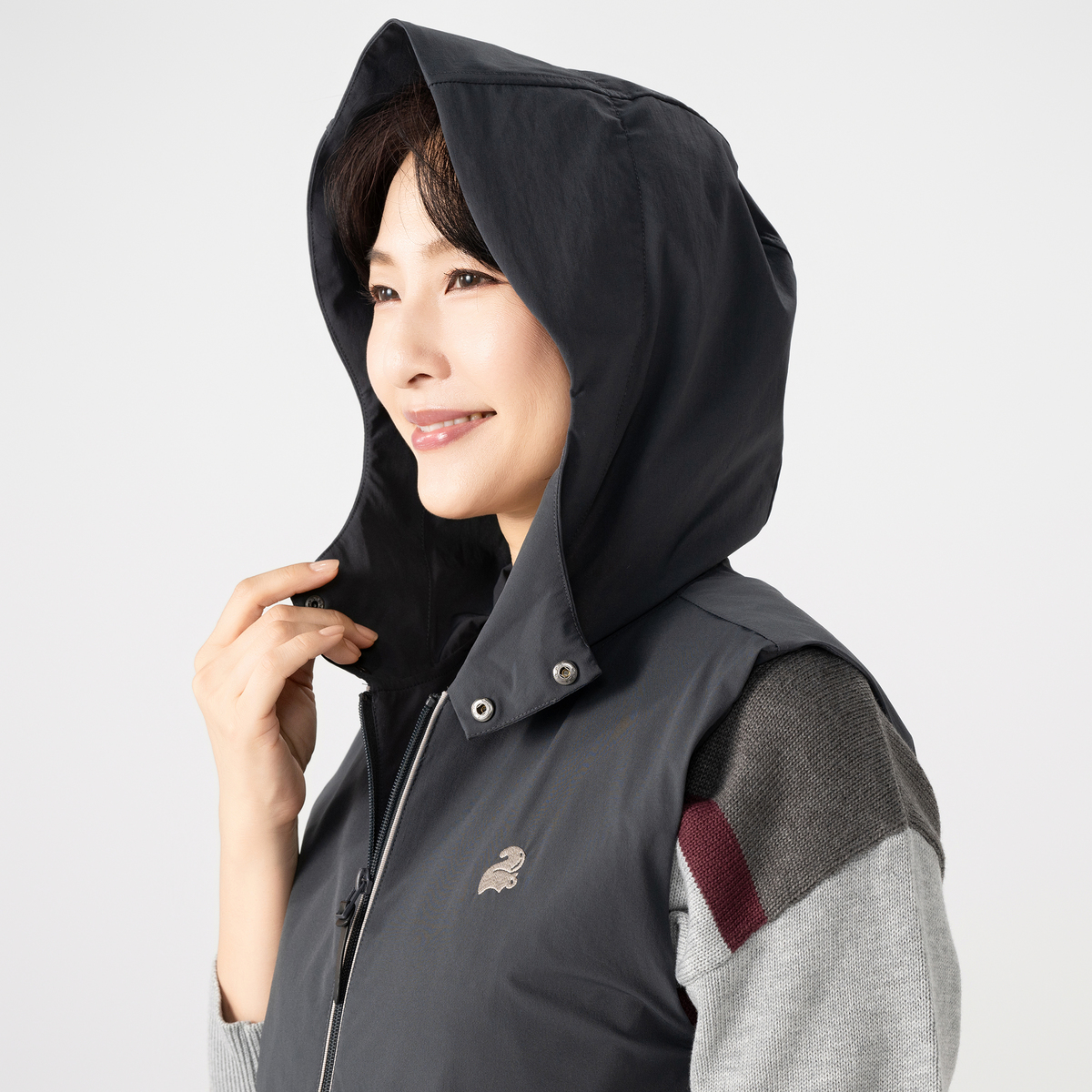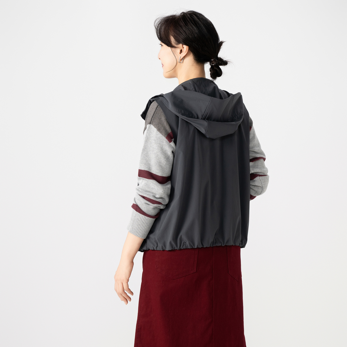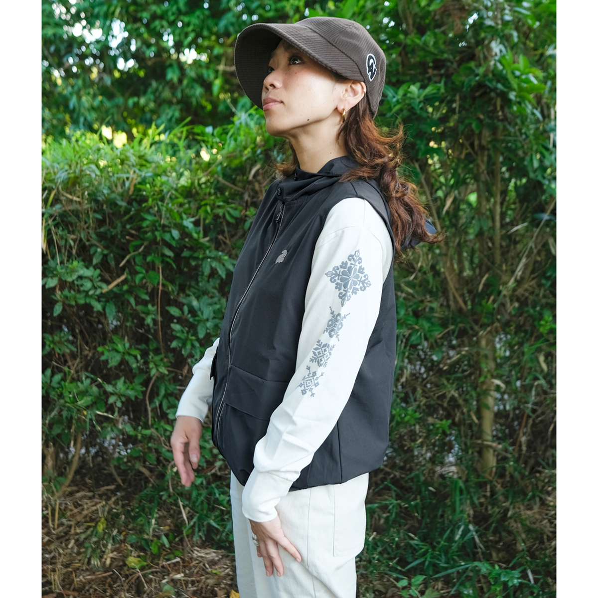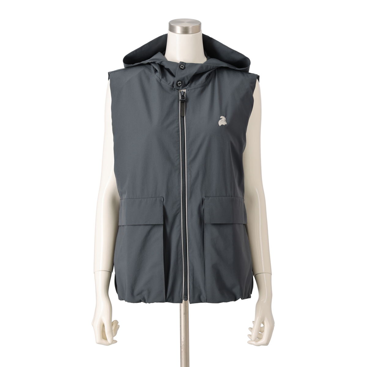 ベストのように羽織れるマウンテンパーカー。長い残暑の季節に合わせて、敢えて袖を無くしたスリーブレスのデザイン。幅広のひさしを付けたフードや、腰には上からも脇からも物を入れることができるポケットを備えています