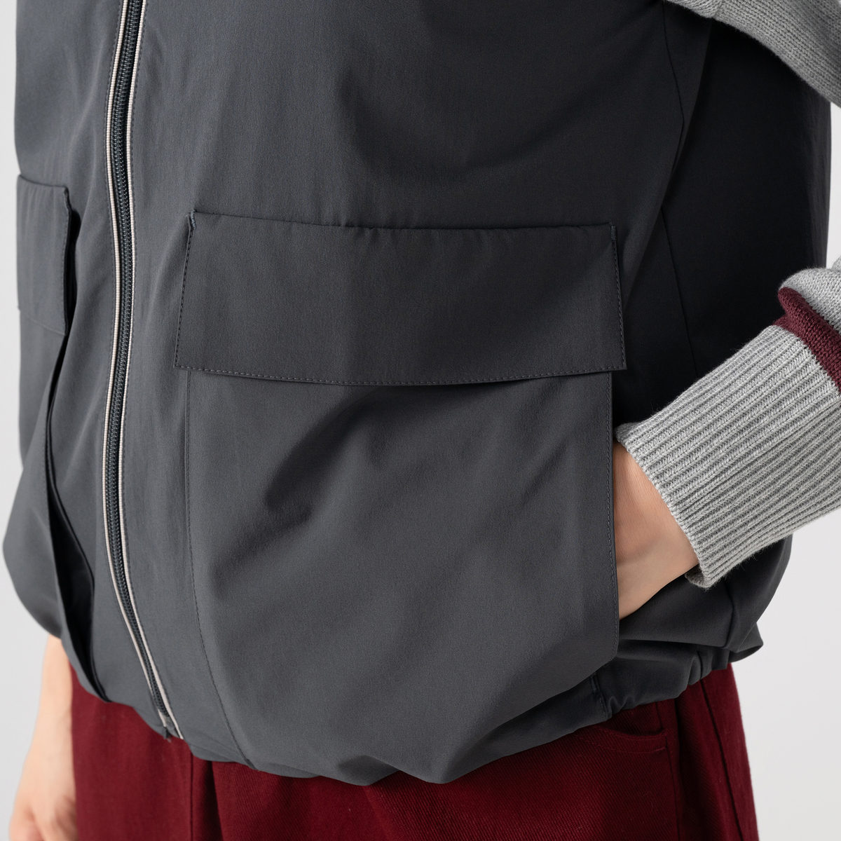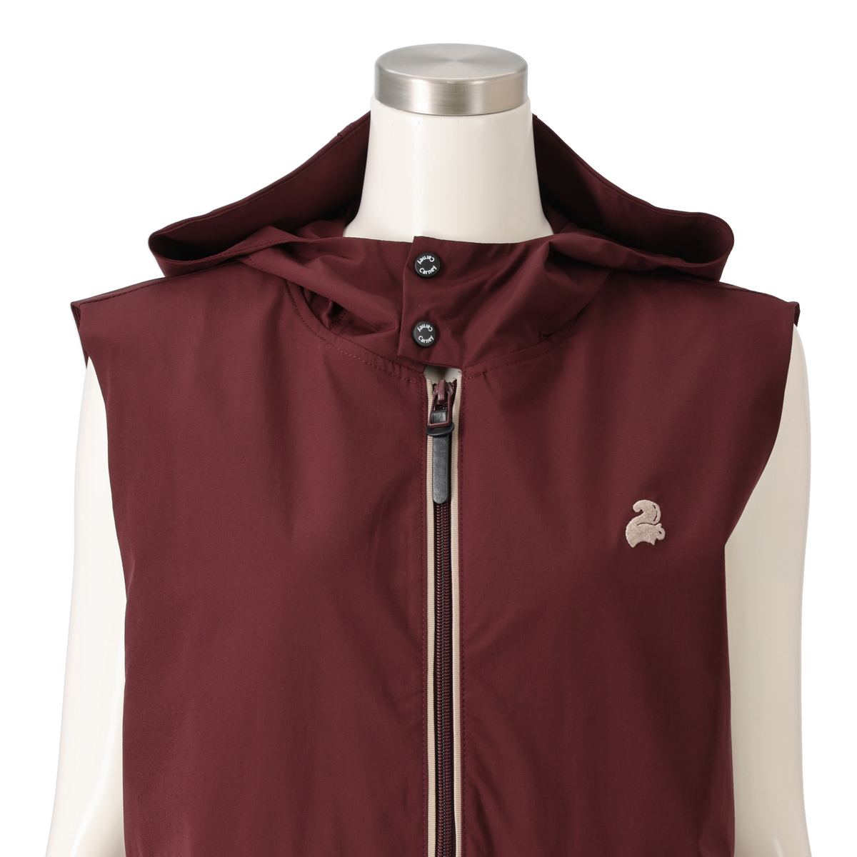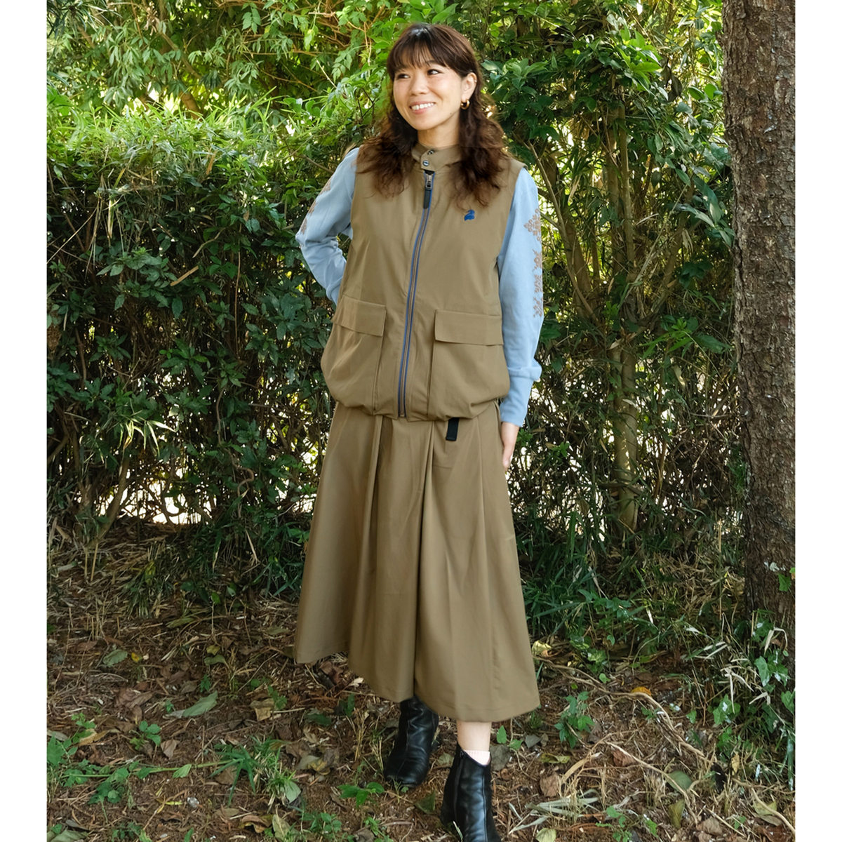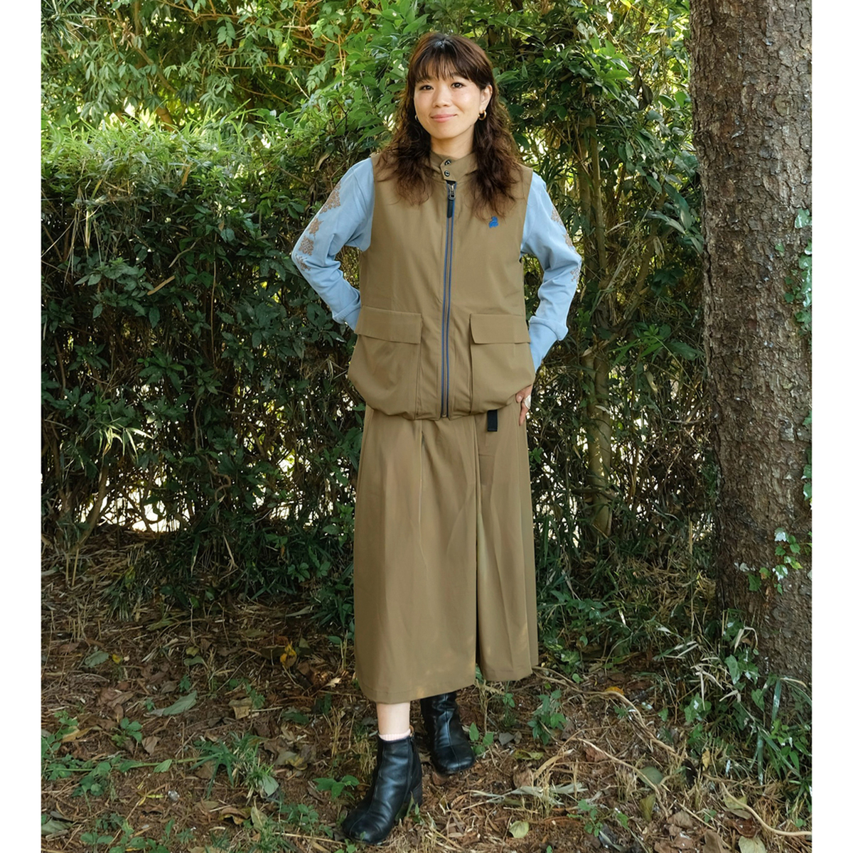 ベストのように羽織れるマウンテンパーカー。長い残暑の季節に合わせて、敢えて袖を無くしたスリーブレスのデザイン。幅広のひさしを付けたフードや、腰には上からも脇からも物を入れることができるポケットを備えています