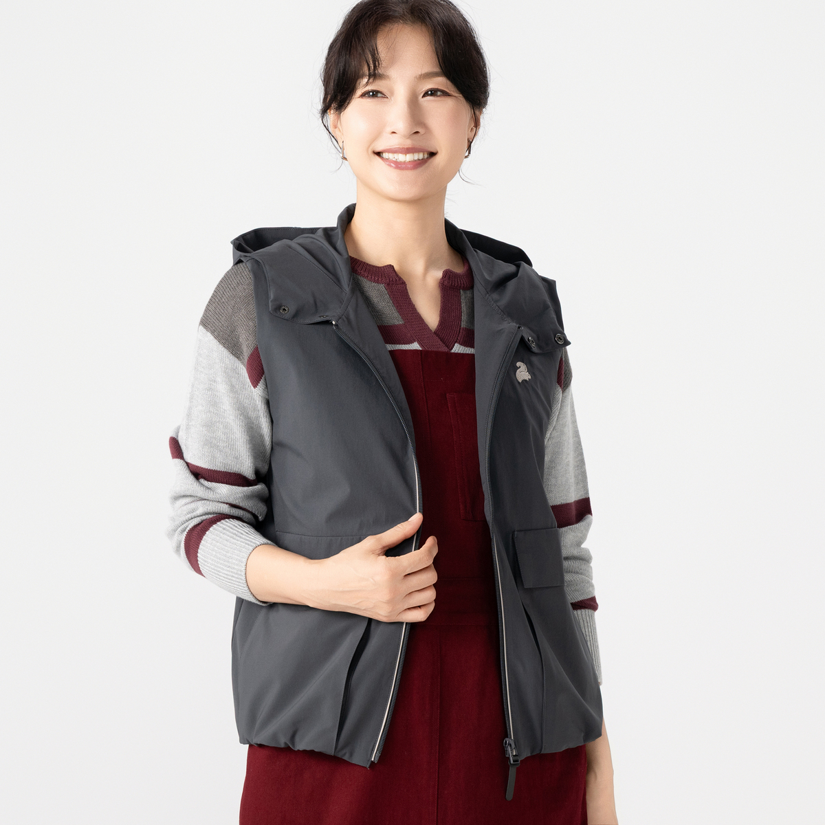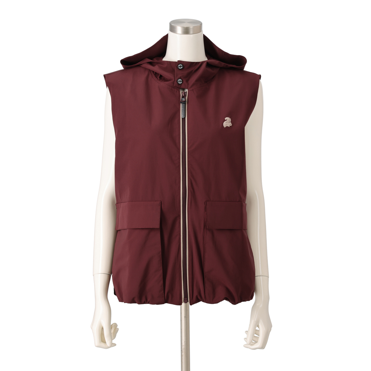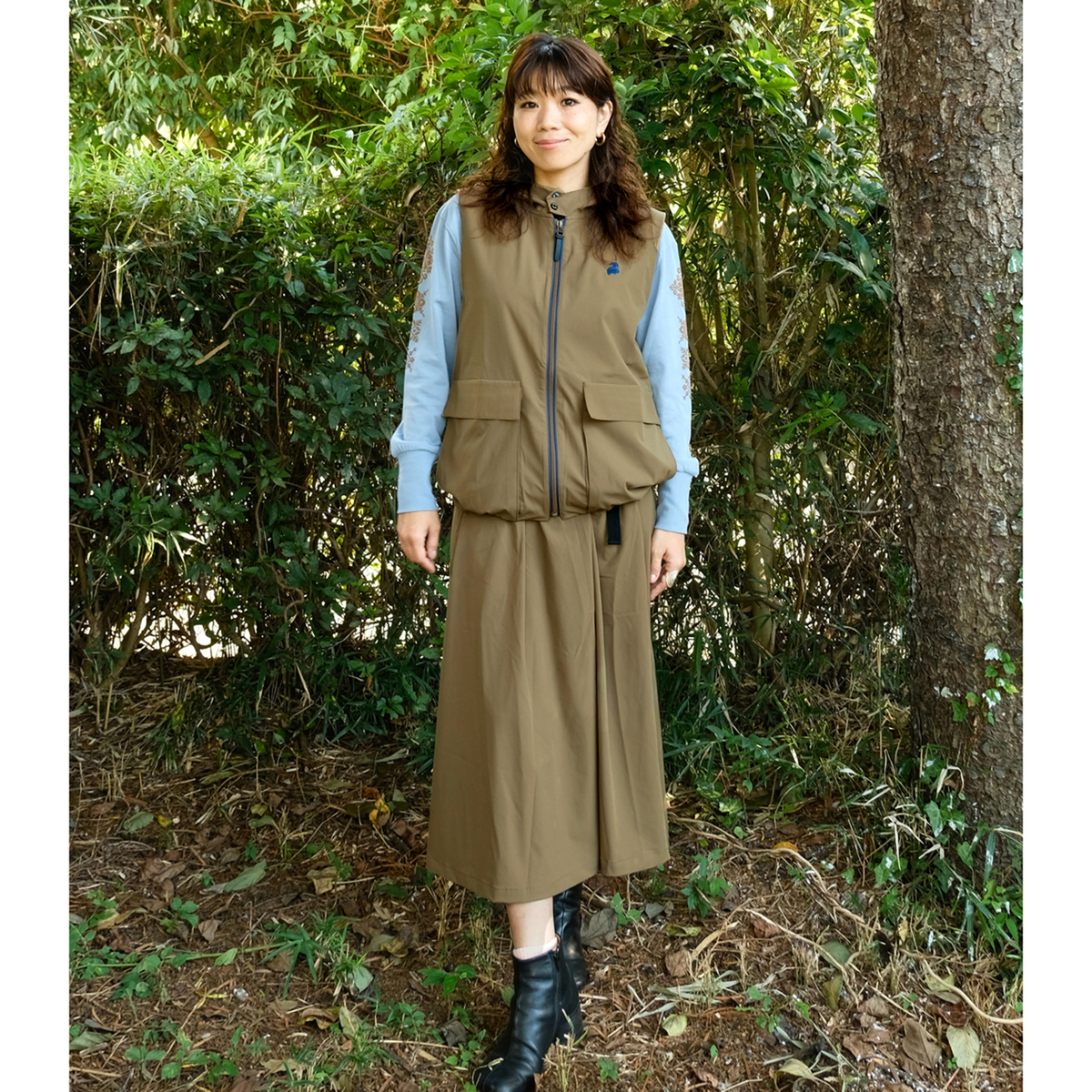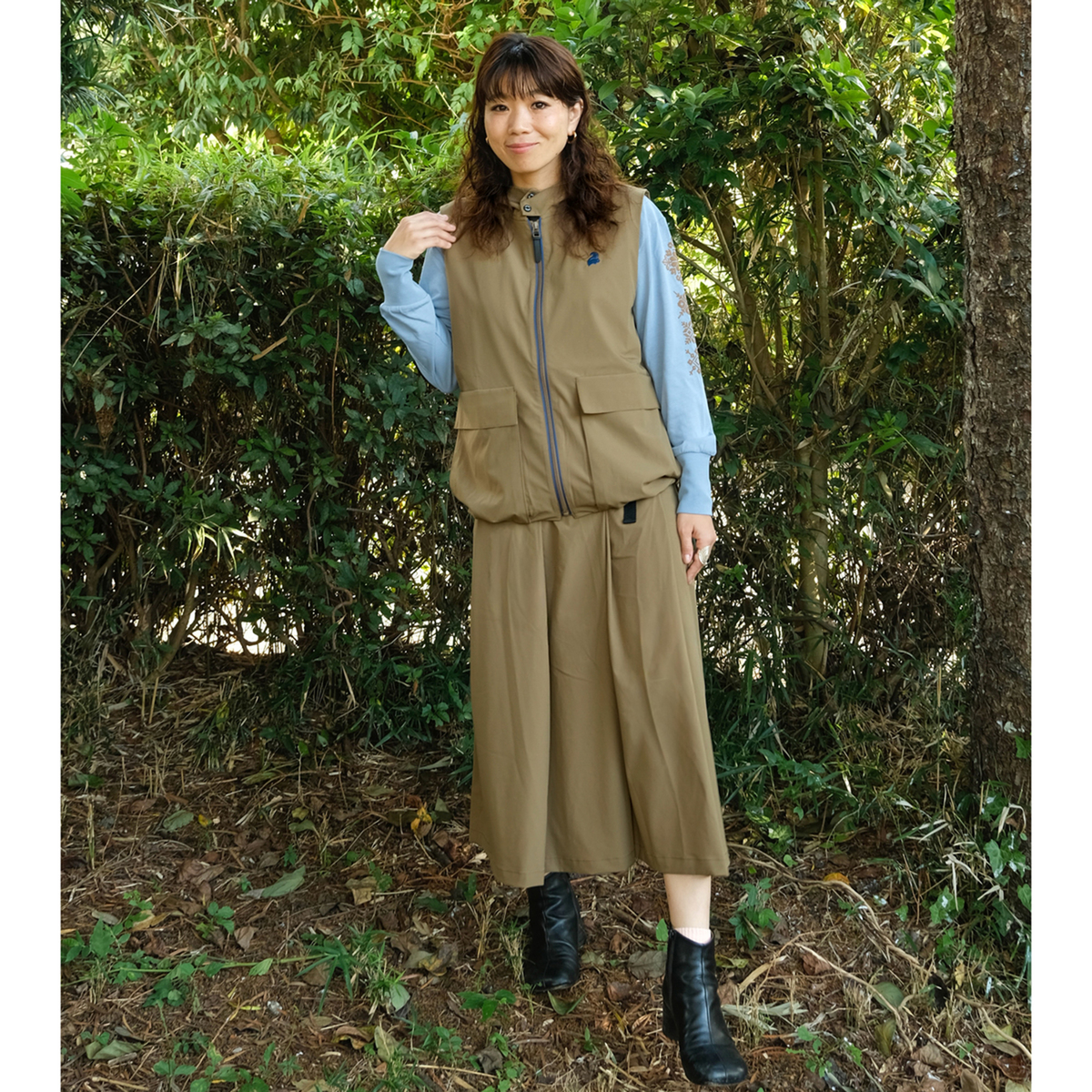 ベストのように羽織れるマウンテンパーカー。長い残暑の季節に合わせて、敢えて袖を無くしたスリーブレスのデザイン。幅広のひさしを付けたフードや、腰には上からも脇からも物を入れることができるポケットを備えています