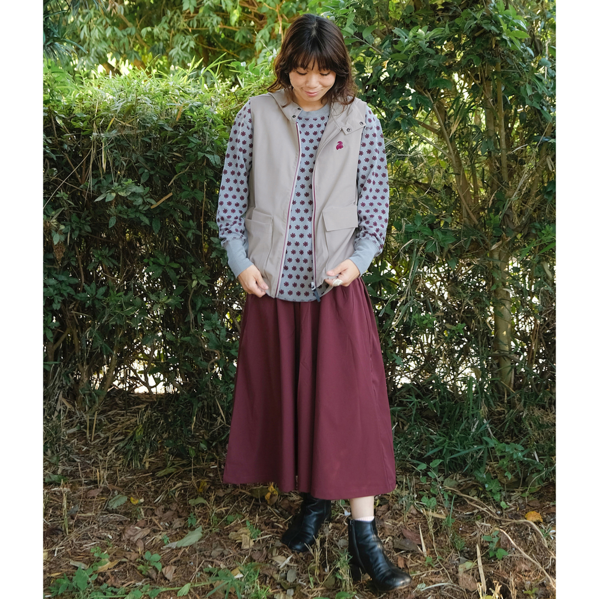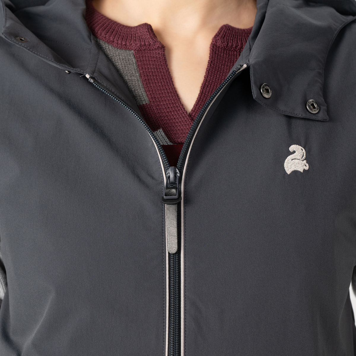 裾は丸ゴムが出ないスッキリ仕様。前中心はコイルファスナー開きで、ムシの両側にはグログランを利用した配色パイピングをあしらい、左胸にはリスの刺繍、襟にはロゴ入りドットボタンなど、随所に個性が光るデザインです