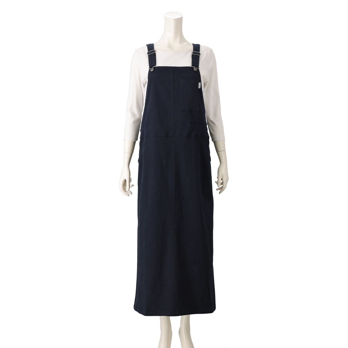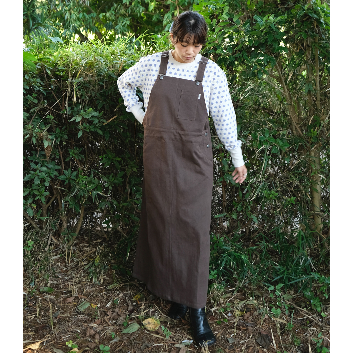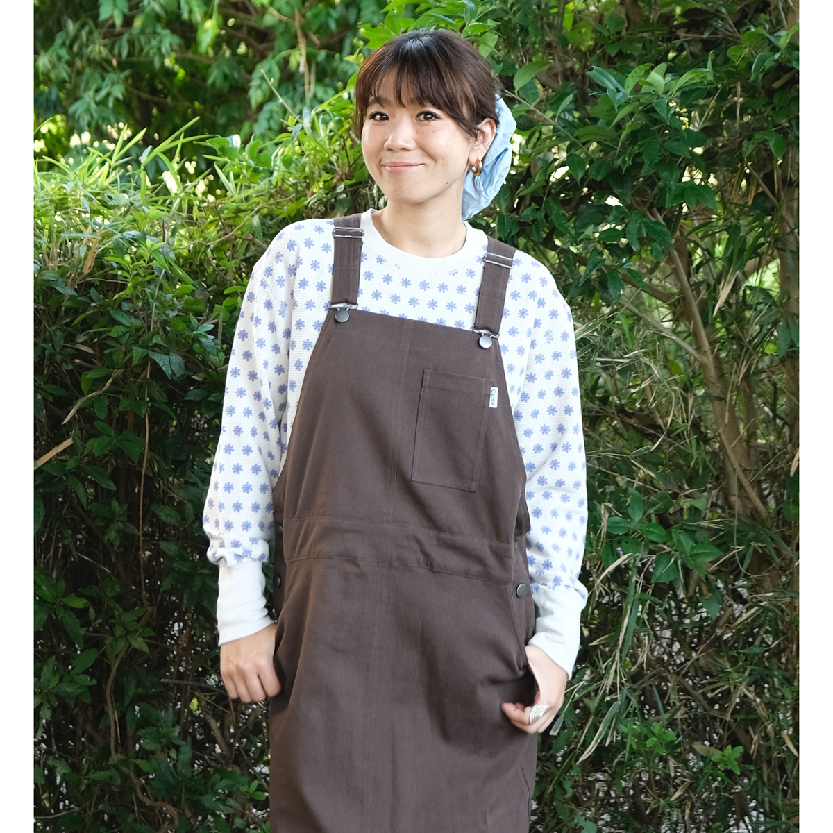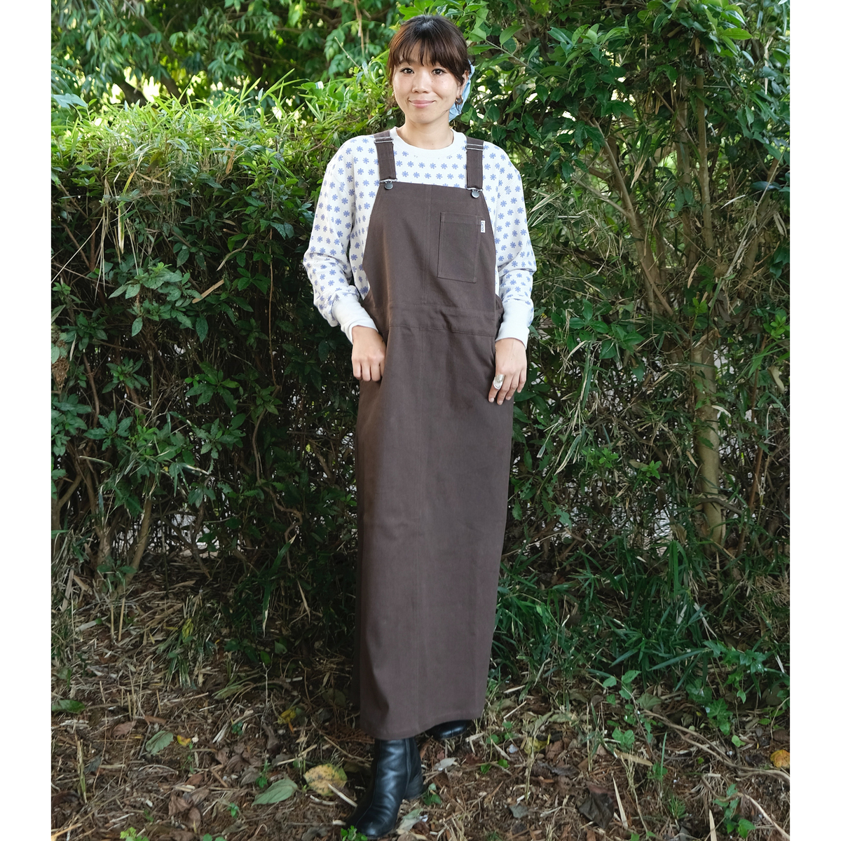オーバーオールのカジュアル感はそのままに、Aラインのロングスカートに仕立てました。フロントは胸当てとポケット付きに。後ろはVカットの衿ぐりで裾までつながり、大きなバックポケットでヒップ周りをカバーします