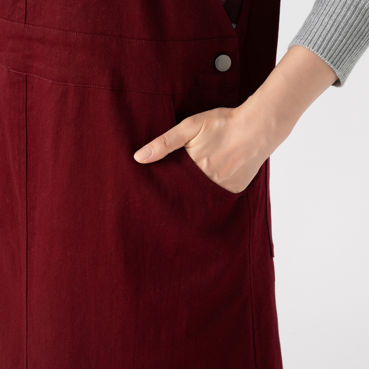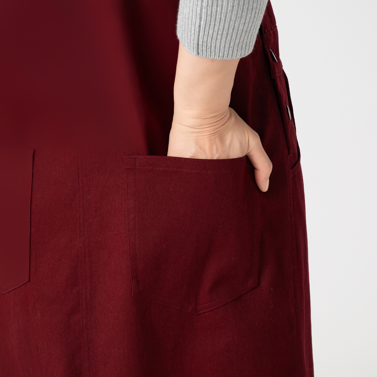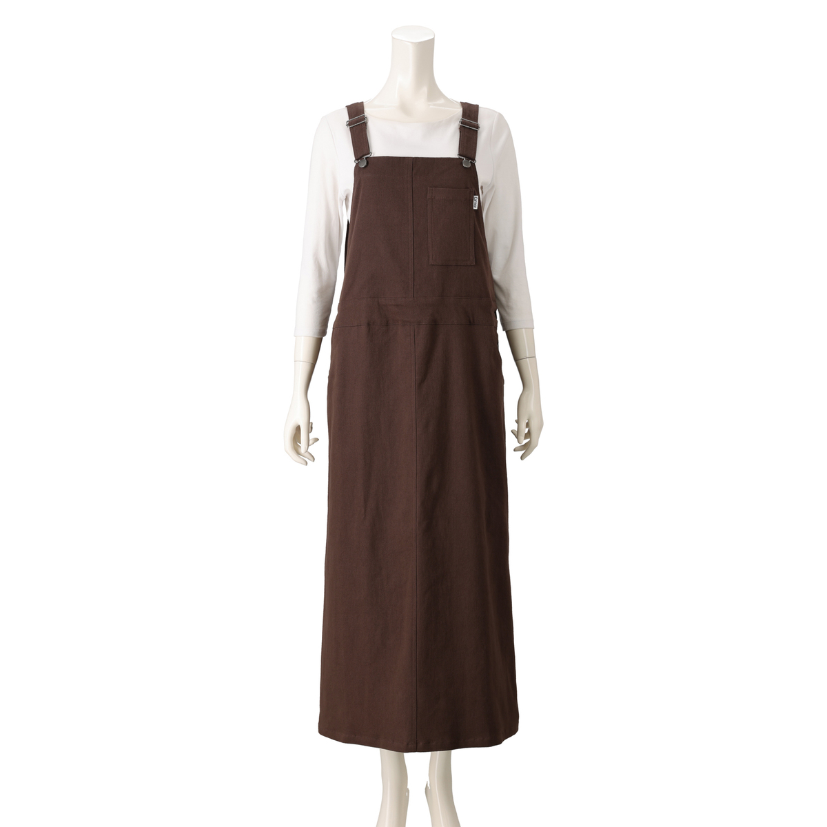 オーバーオールのカジュアル感はそのままに、Aラインのロングスカートに仕立てました。フロントは胸当てとポケット付きに。後ろはVカットの衿ぐりで裾までつながり、大きなバックポケットでヒップ周りをカバーします