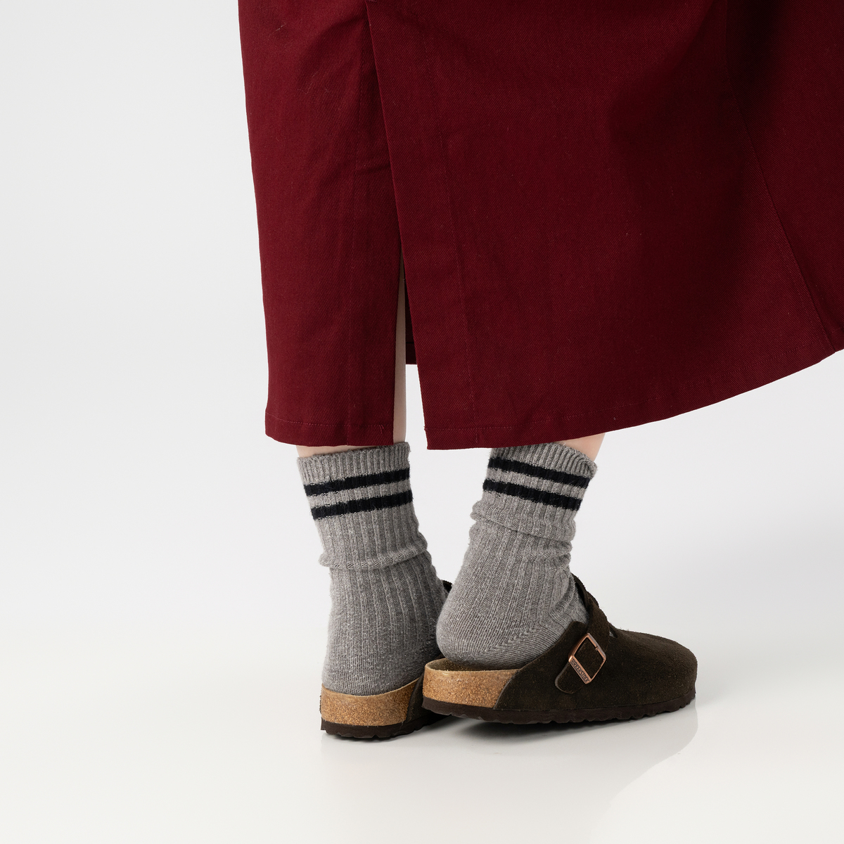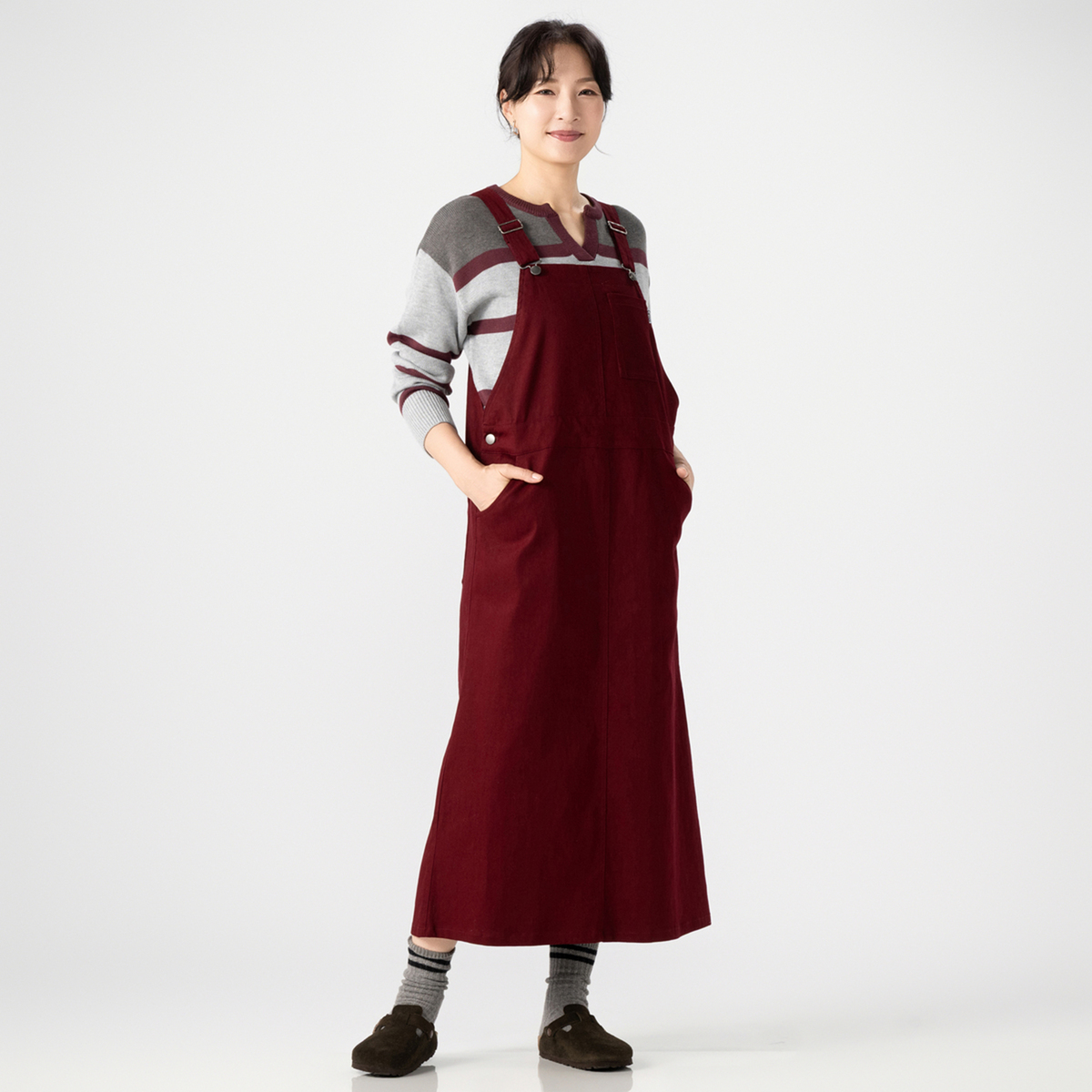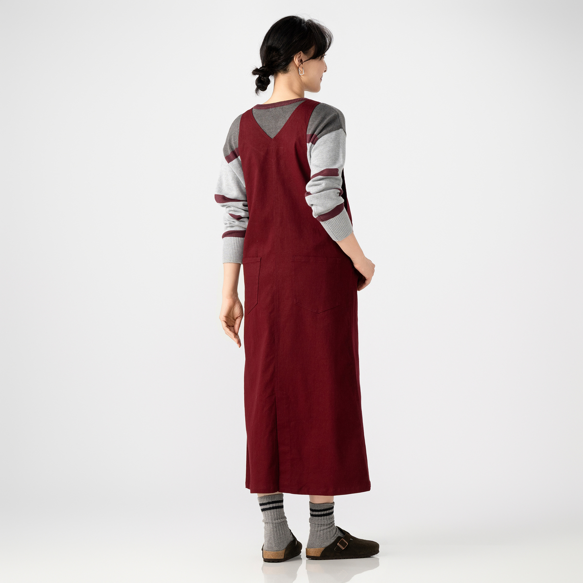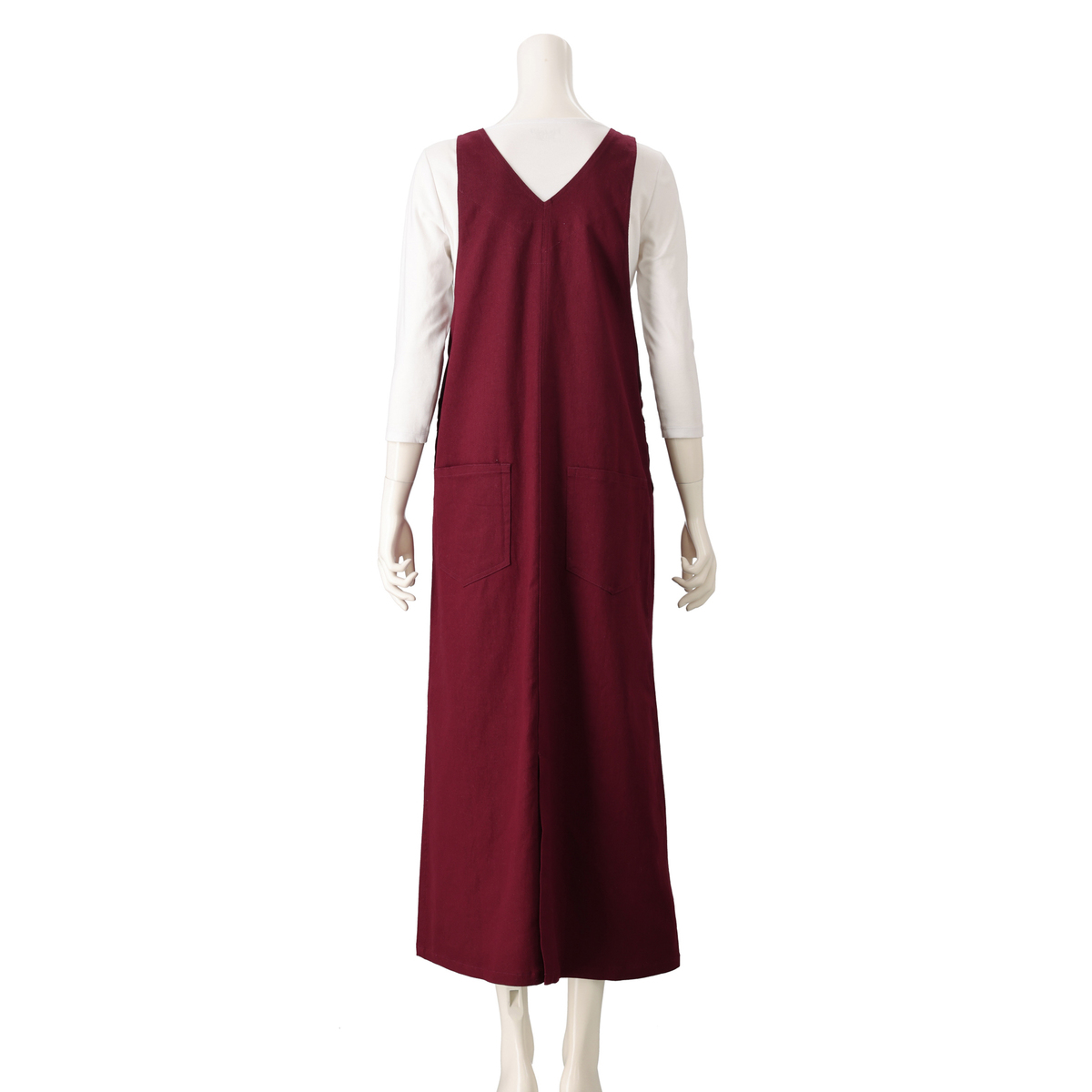 オーバーオールのカジュアル感はそのままに、Aラインのロングスカートに仕立てました。フロントは胸当てとポケット付きに。後ろはVカットの衿ぐりで裾までつながり、大きなバックポケットでヒップ周りをカバーします