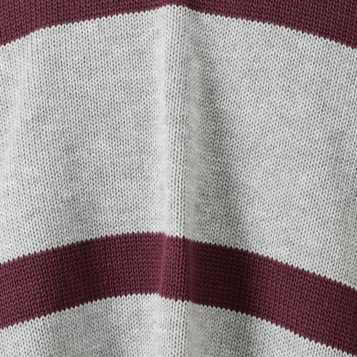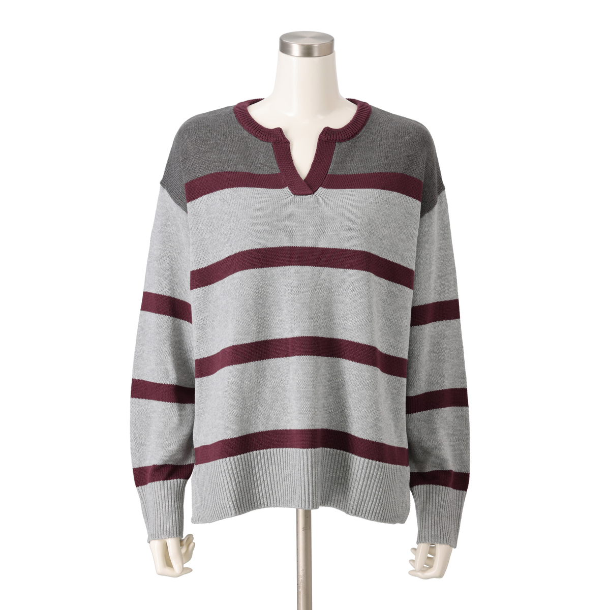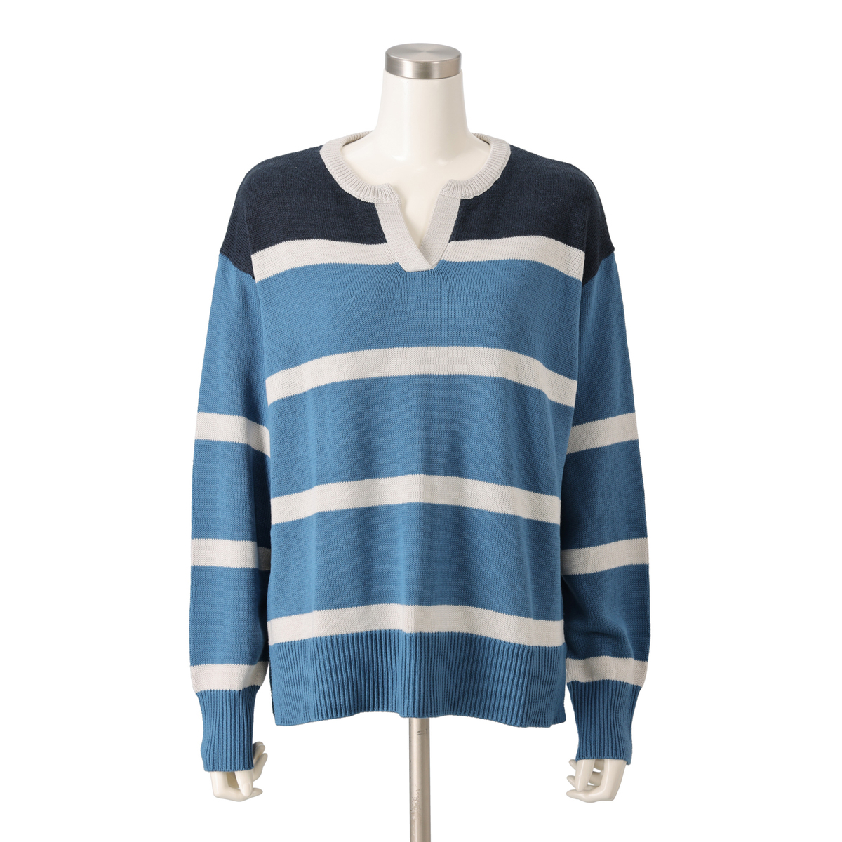ラガーシャツのような大きなピッチのボーダー柄で、肩の部分は身頃と同色系の濃色に。間に入った細いボーダーは、キーネックのポイントでもある前立てと衿と同色にした配色がポイントです