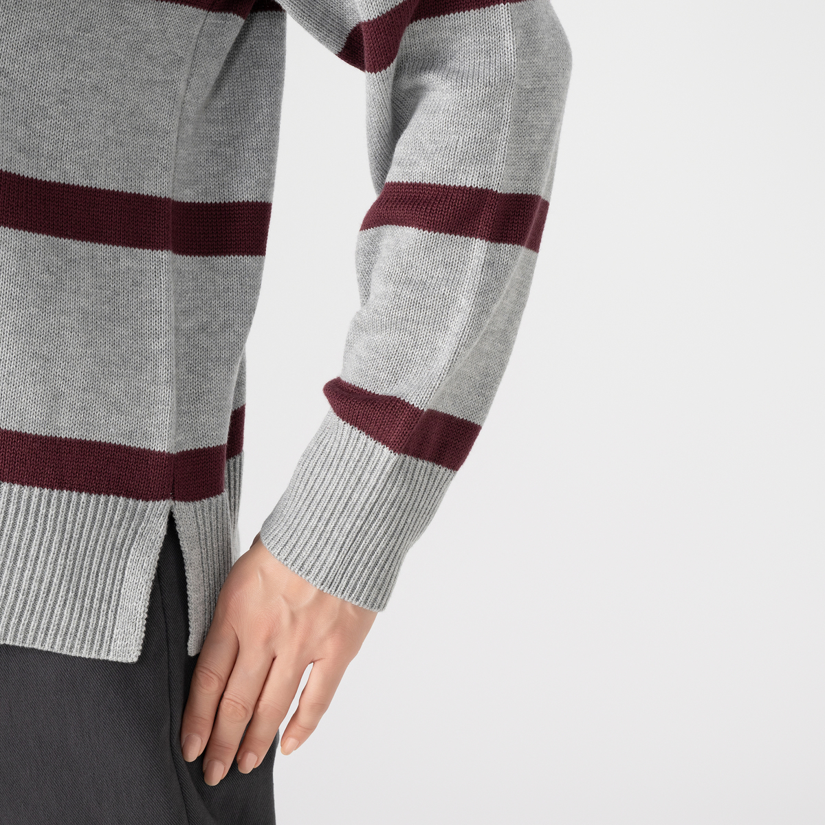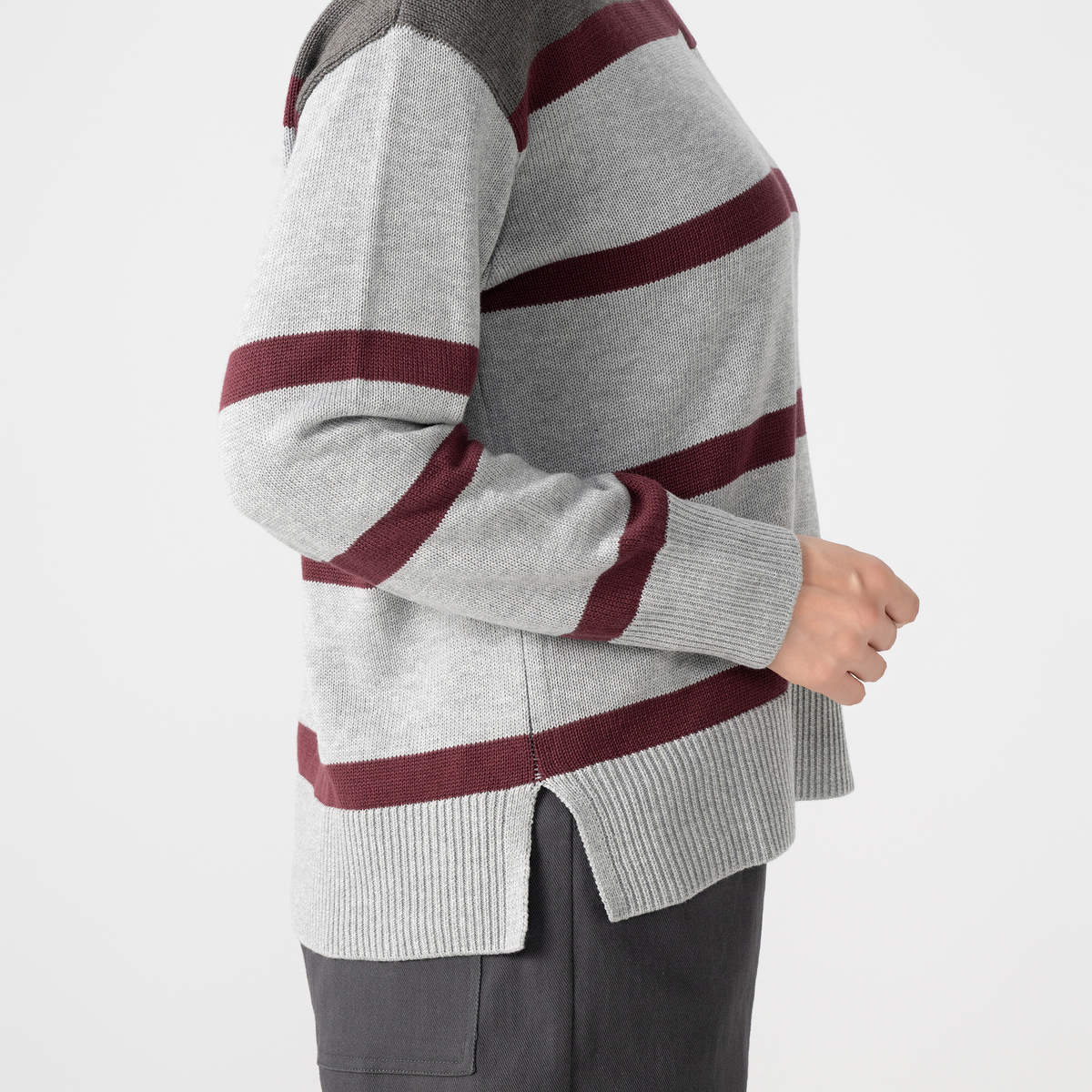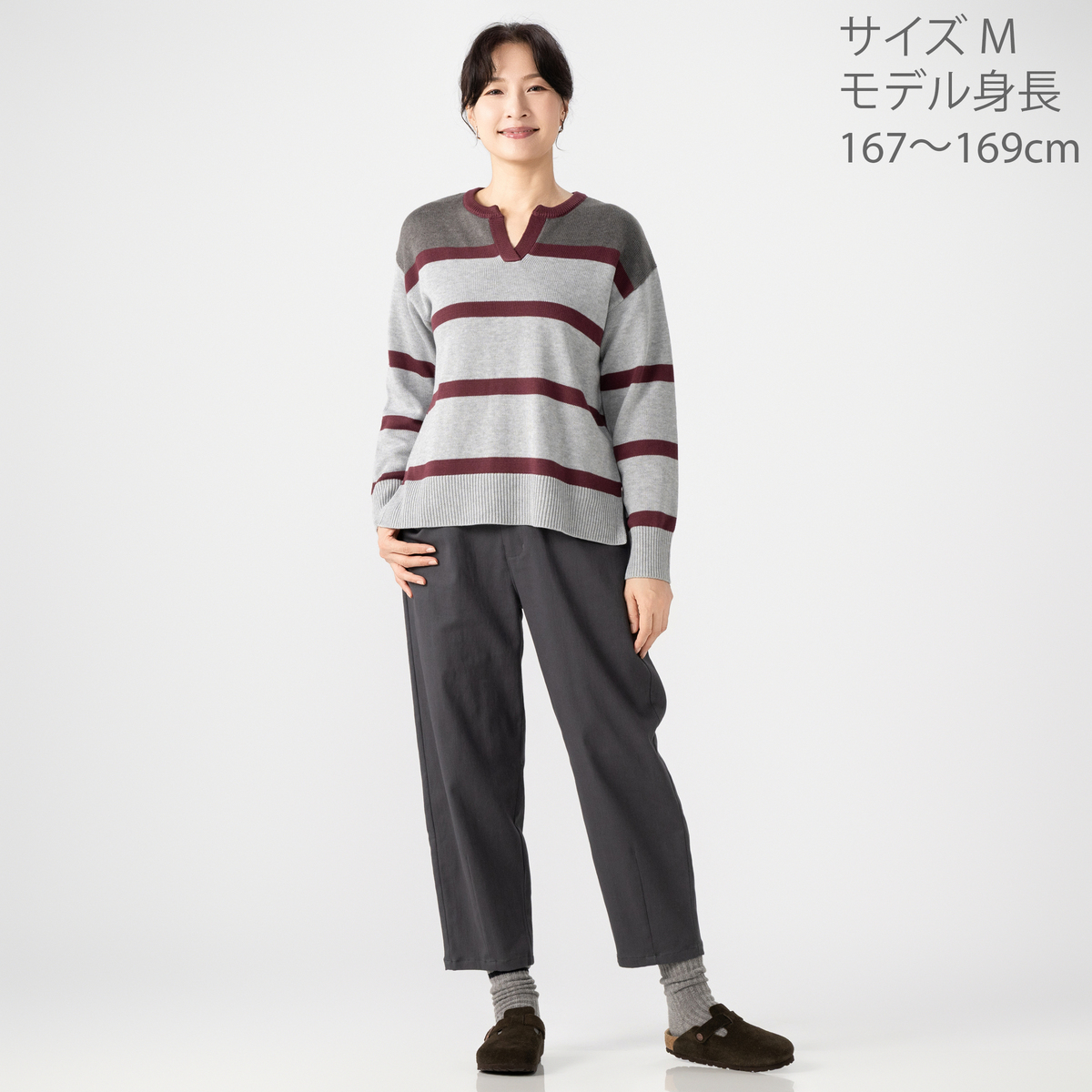 ラガーシャツのような大きなピッチのボーダー柄で、肩の部分は身頃と同色系の濃色に。間に入った細いボーダーは、キーネックのポイントでもある前立てと衿と同色にした配色がポイントです