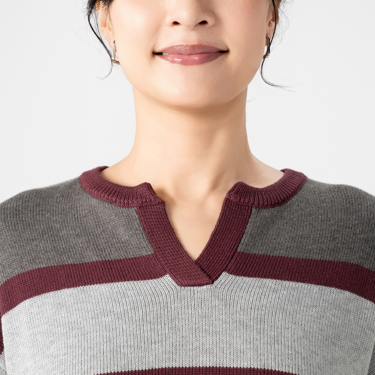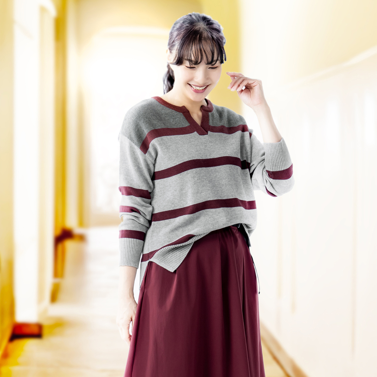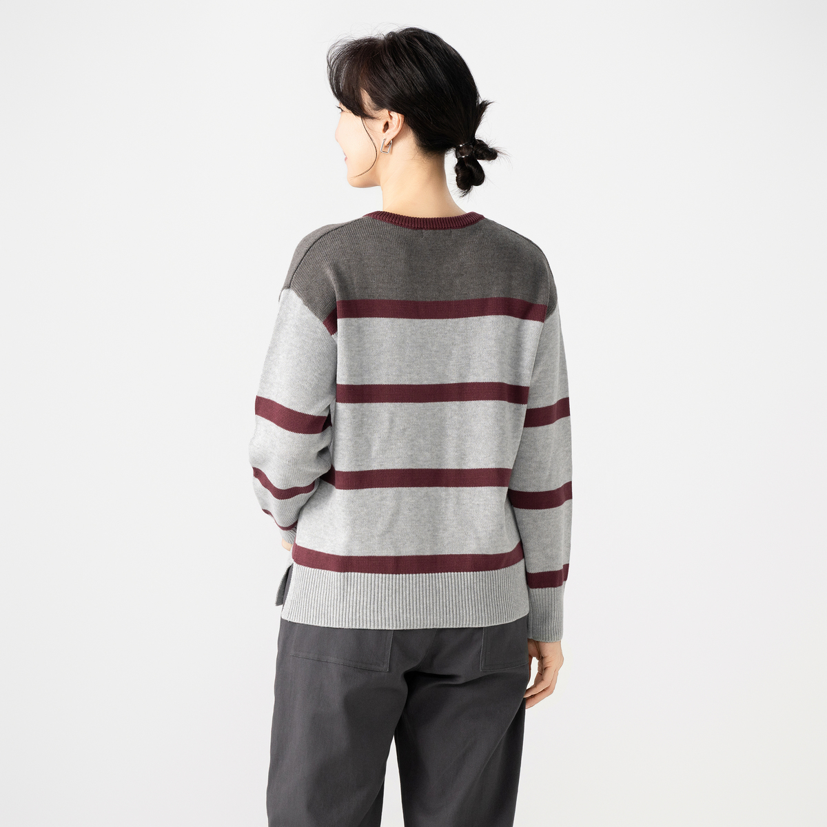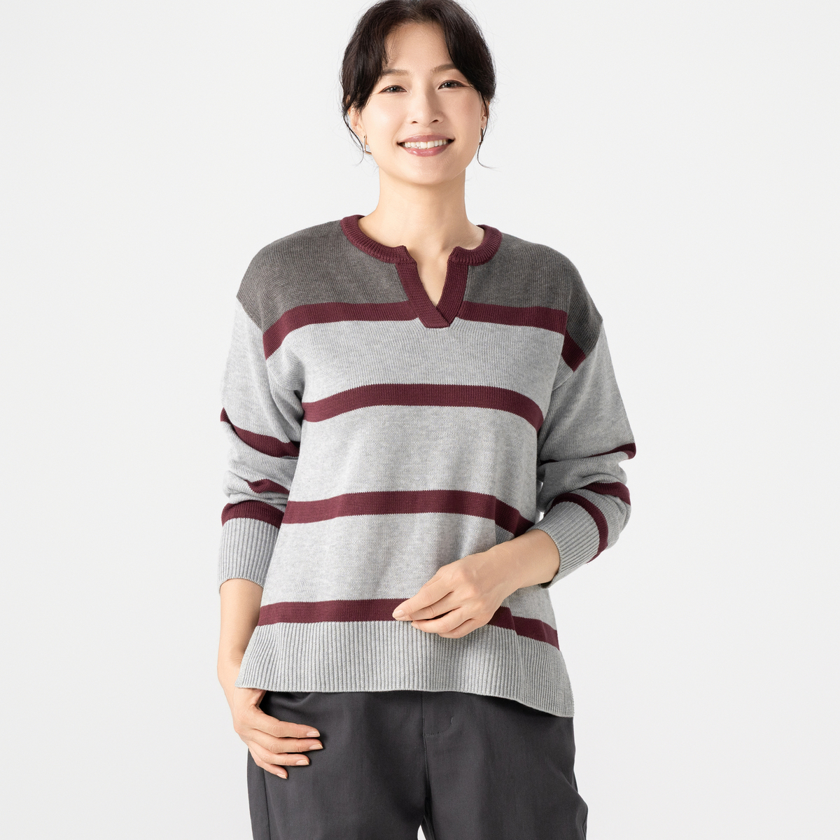 コットンとアクリルの糸を使用した、さらっとしたタッチで肌触りの良いニットです。フロントは適度な開きでボタンのないキーネック。あえての衿なしラガーニットは、カジュアルでありつつ大人のエレガンスを感じる一着です