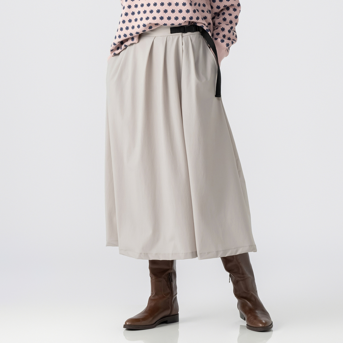 フロントの大きく畳んだタックでラップスカートのように見えるキュロットパンツ。斜めに流れるランダムに取ったタックや前後の脇側にもタックを入れ、ふんわりとした分量感でスカート派の方にも穿きやすいアイテムです