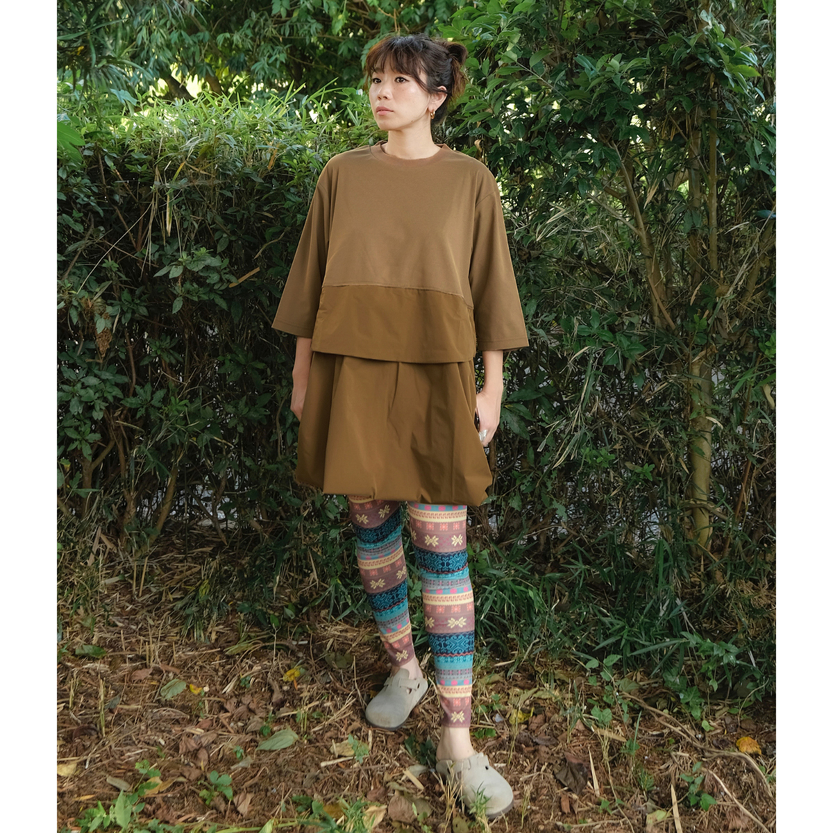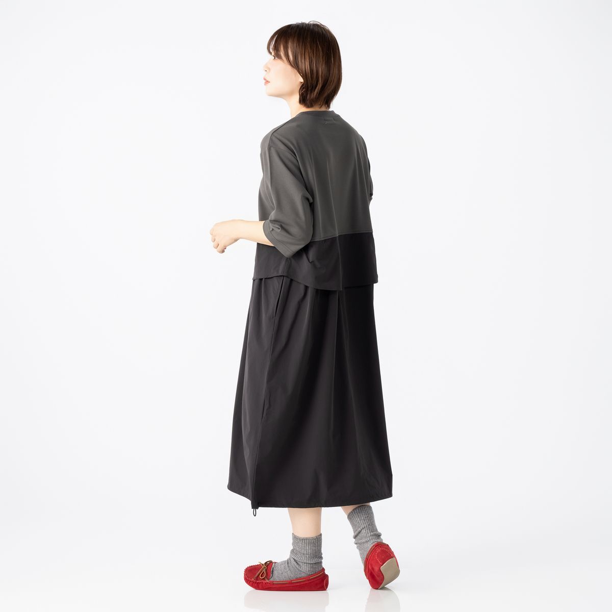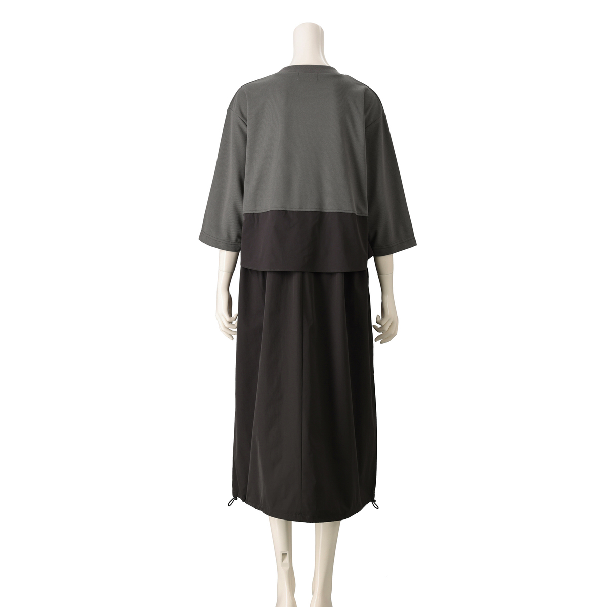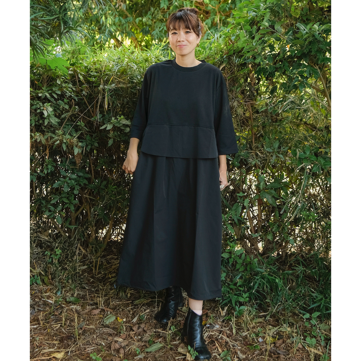 異素材の組合せが印象的なワンピースです。身頃と袖には動きやすいカットソー、スカート部分には少し張り感のあるポリエステルタフタを使用。ペプラム風の裾とスカート部分が重なり、立体的なシルエットを作ります
