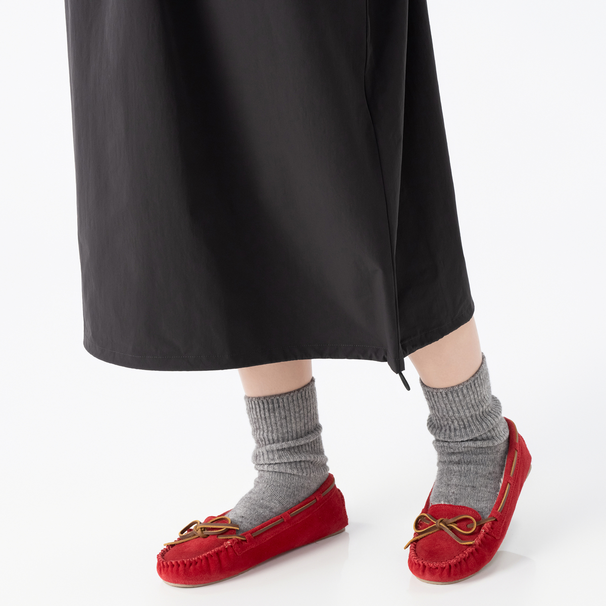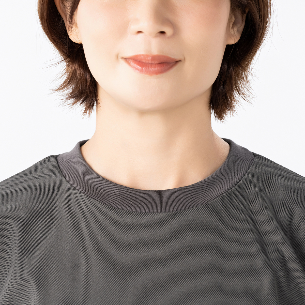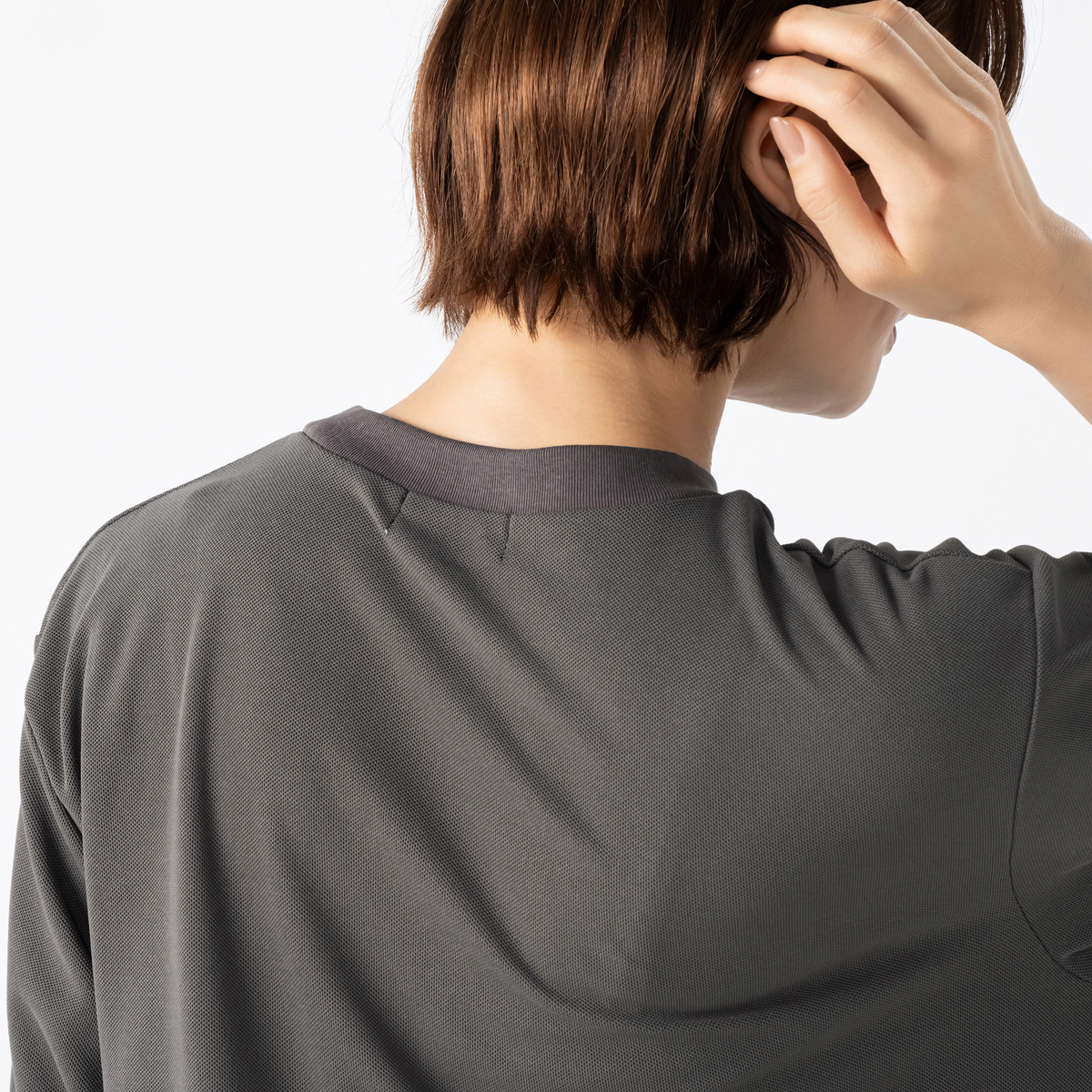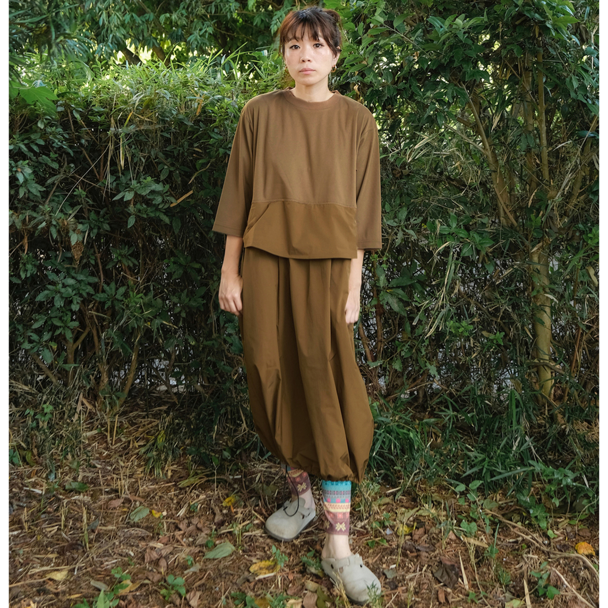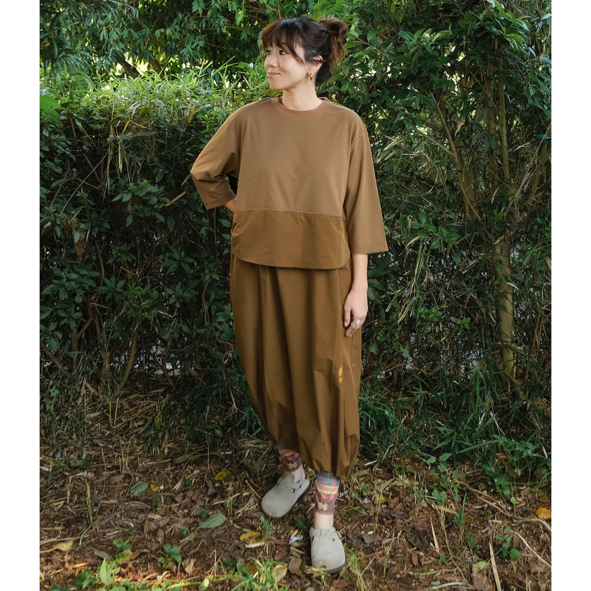 ドロップショルダーと広めの七分袖でリラックス感を演出し、ウエストはゆったり着用可能です。丸ゴムアジャスターを使って裾のシルエットを変えればコクーンシルエットにも。脇にはスラッシュポケット付きで普段使いにも便利です