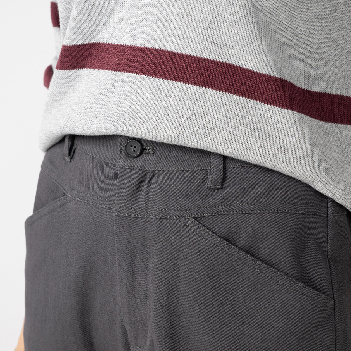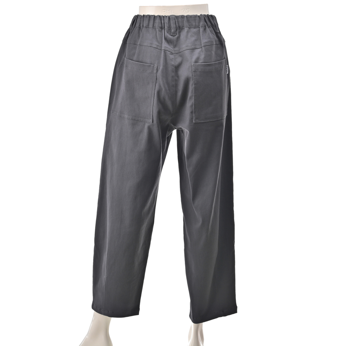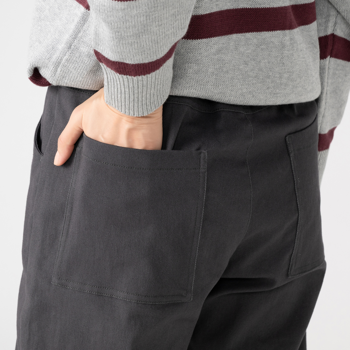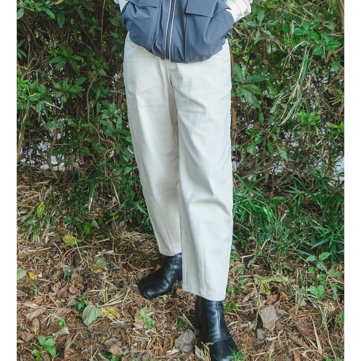 キックバックの良いコットンポリウレタン混のストレッチ素材を採用し、逆綾組織の斜め織りがカジュアル感がありつつ、光沢を感じる上品な生地感。前ウエストはスッキリとベルトで、後ろウエストはゴムで穿きやすく仕上げています