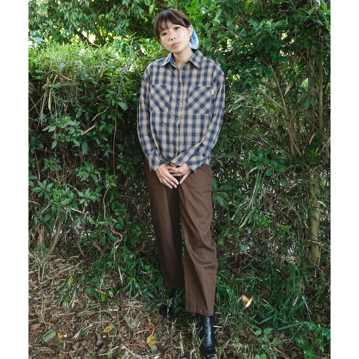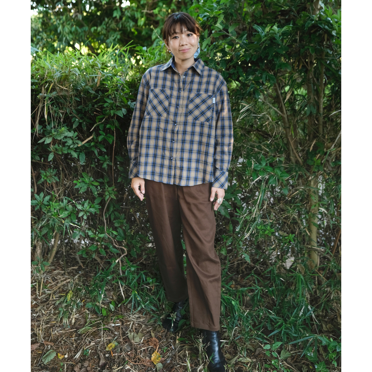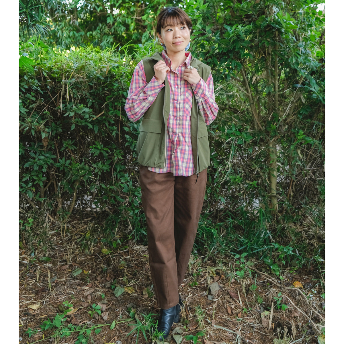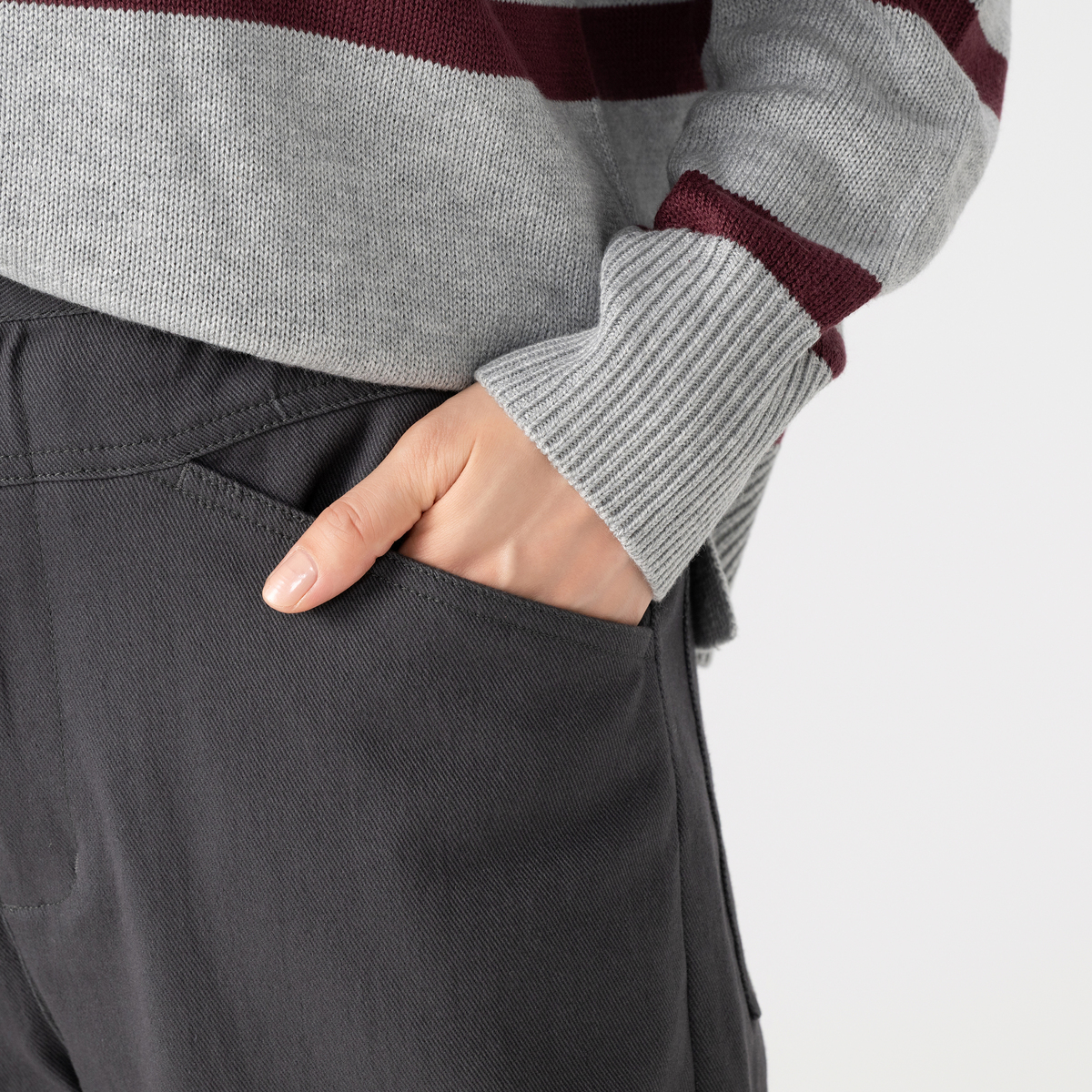 キックバックの良いコットンポリウレタン混のストレッチ素材を採用し、逆綾組織の斜め織りがカジュアル感がありつつ、光沢を感じる上品な生地感。前ウエストはスッキリとベルトで、後ろウエストはゴムで穿きやすく仕上げています