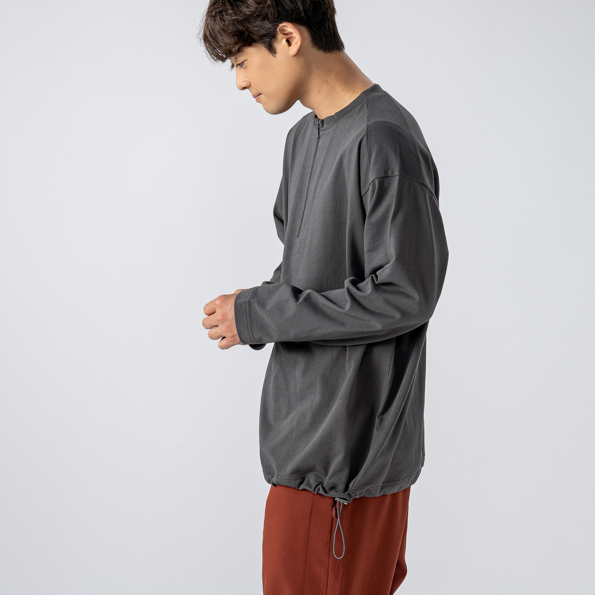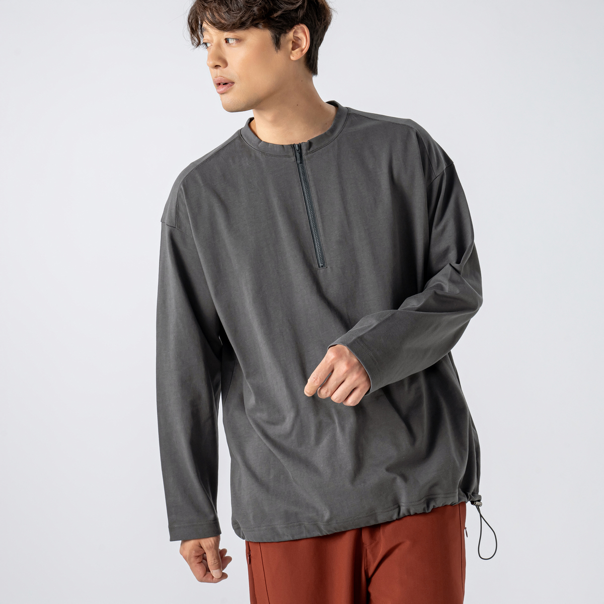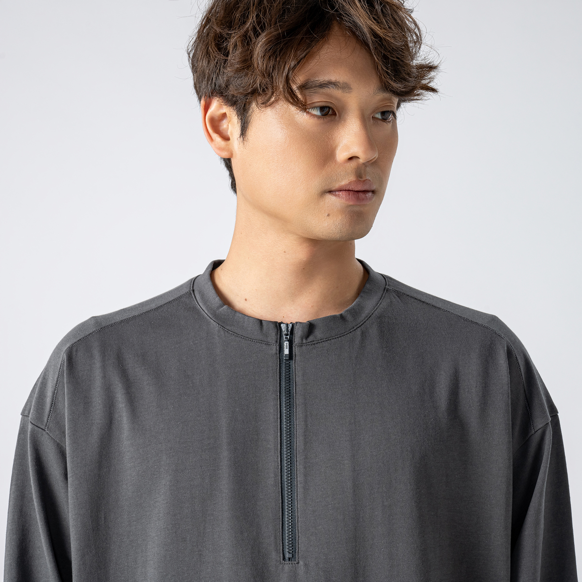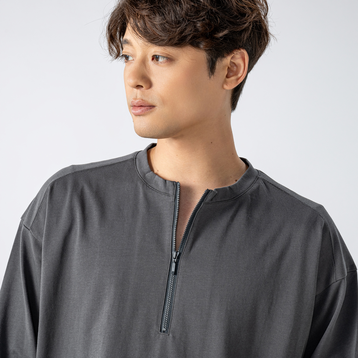 フロントファスナーが印象的な長袖Tシャツ。ヘンリーネックにファスナーをプラスすることで、トレンド感とスポーティーさがあります