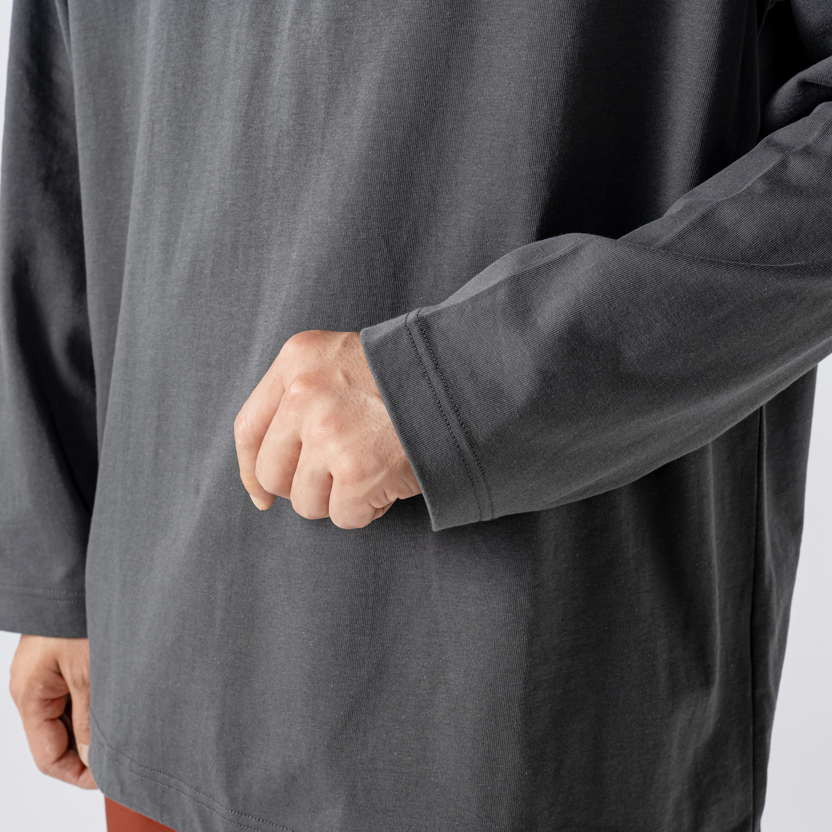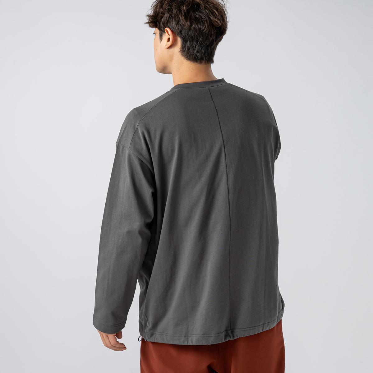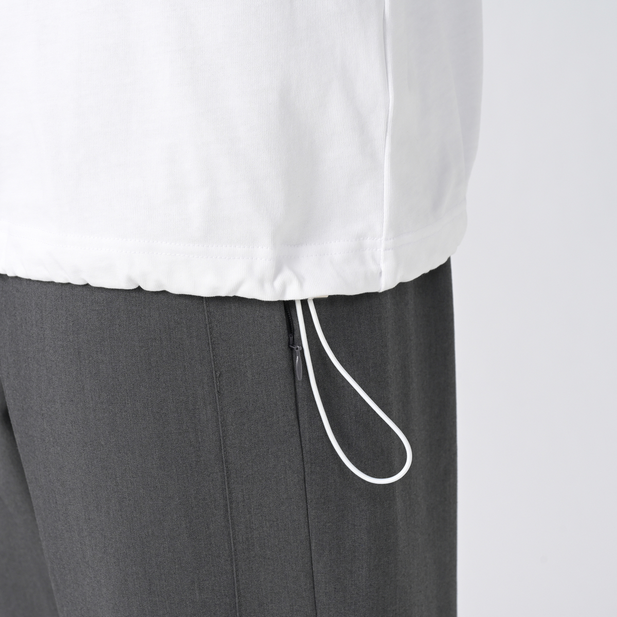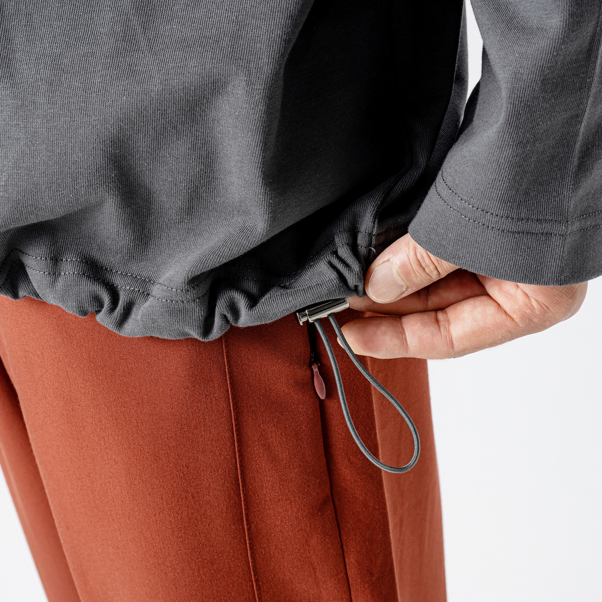 オリジナルのハイグレード天竺素材を使用。裾に通した紐でスタイルのアレンジも。シンプルながらもディテールにこだわった一枚です