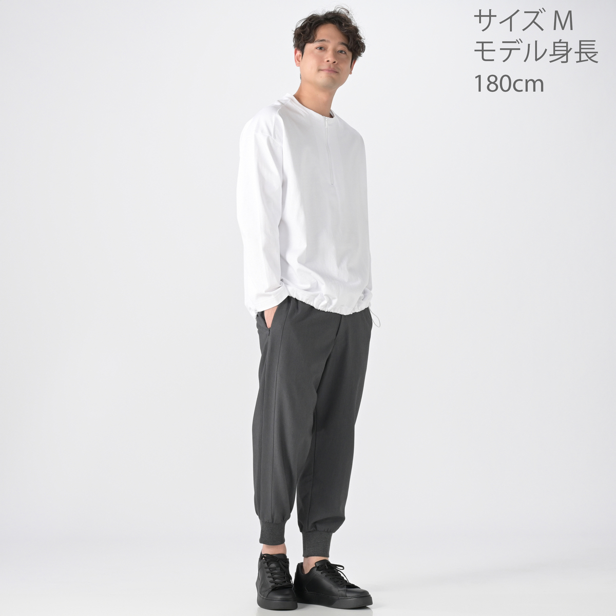 ゆったりしてます。Sサイズでも良かったかな。裾を絞って着るとオシャレ。前開きのファスナーもいい感じです。