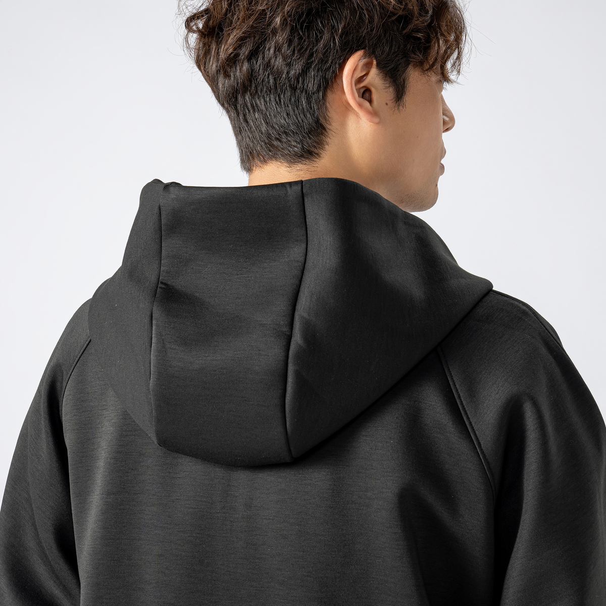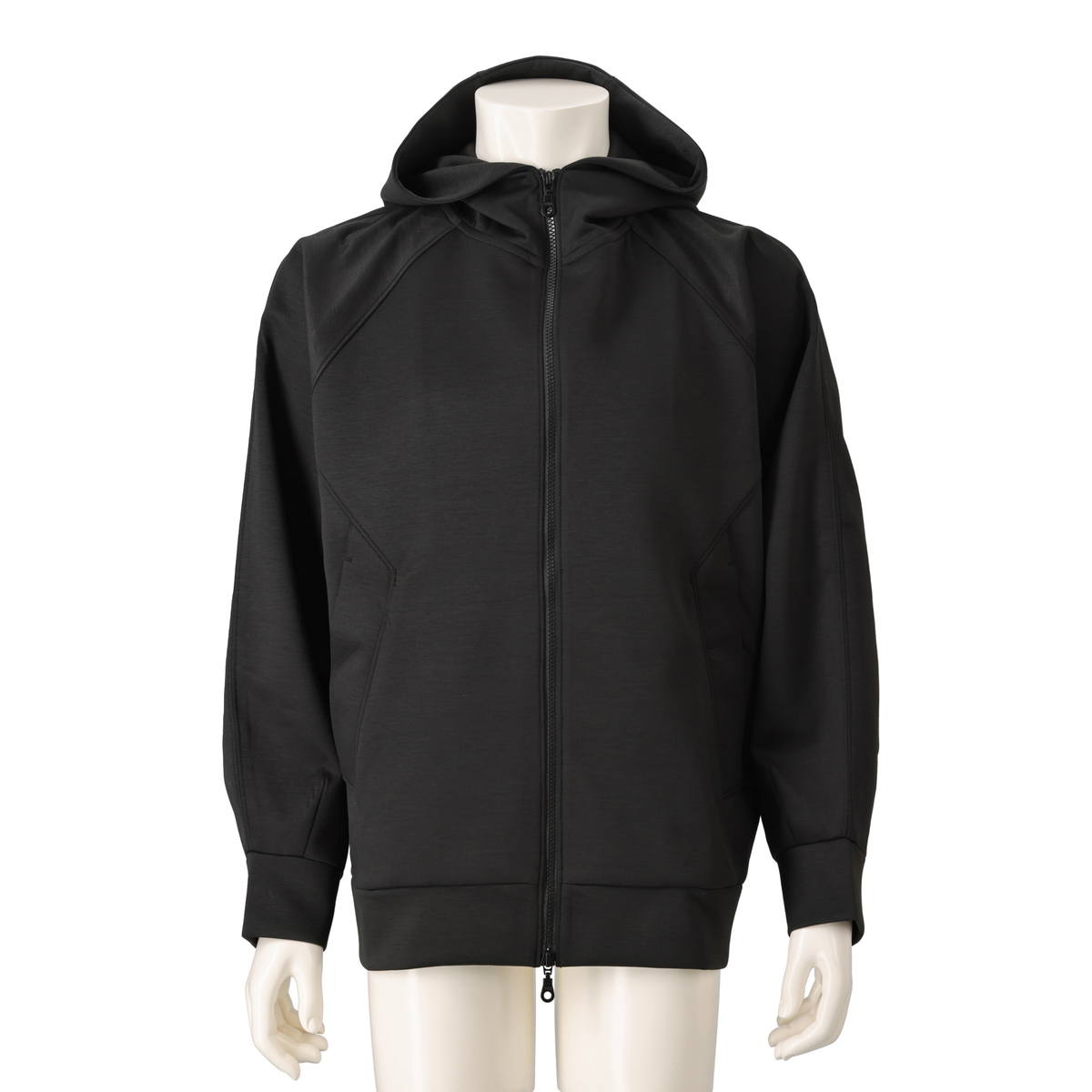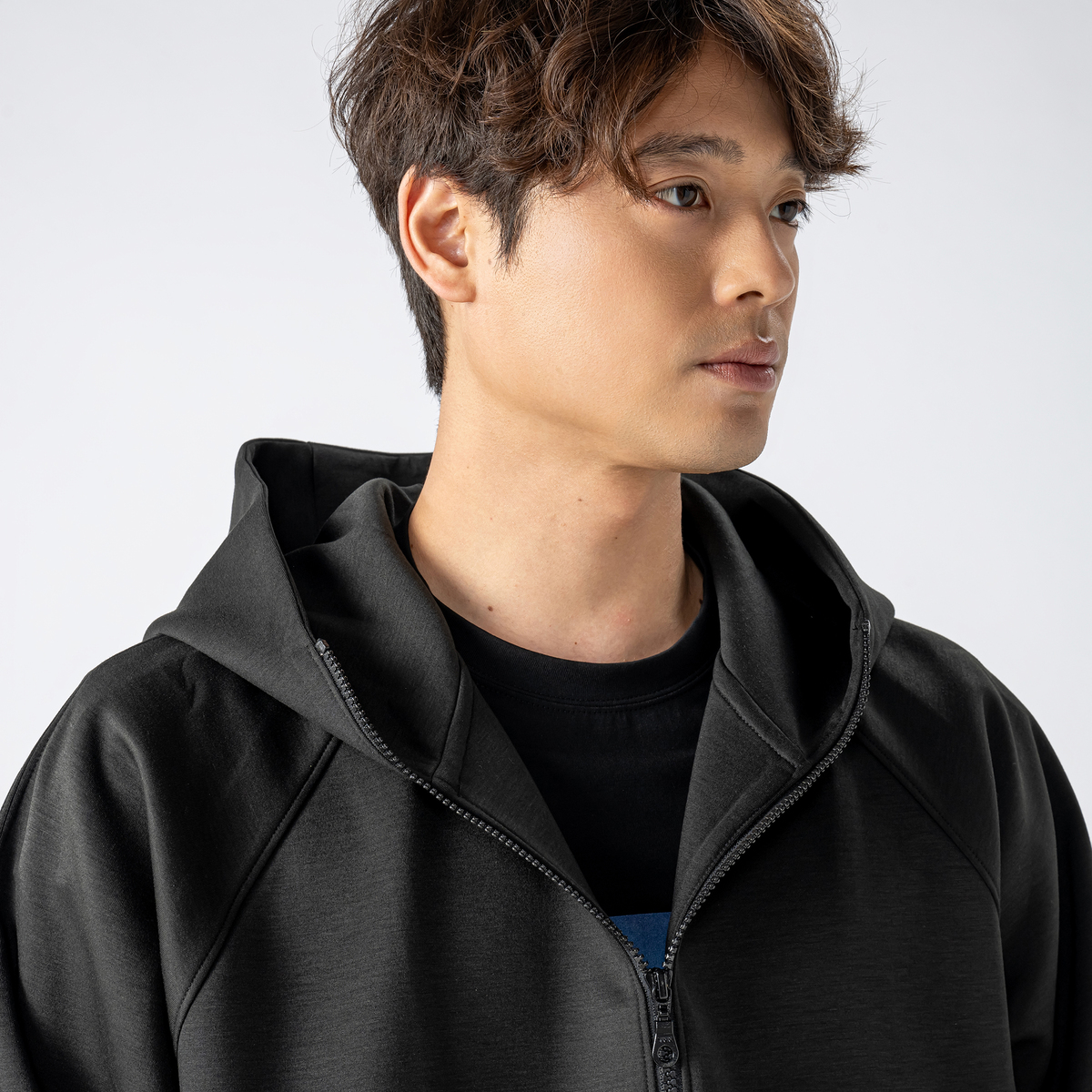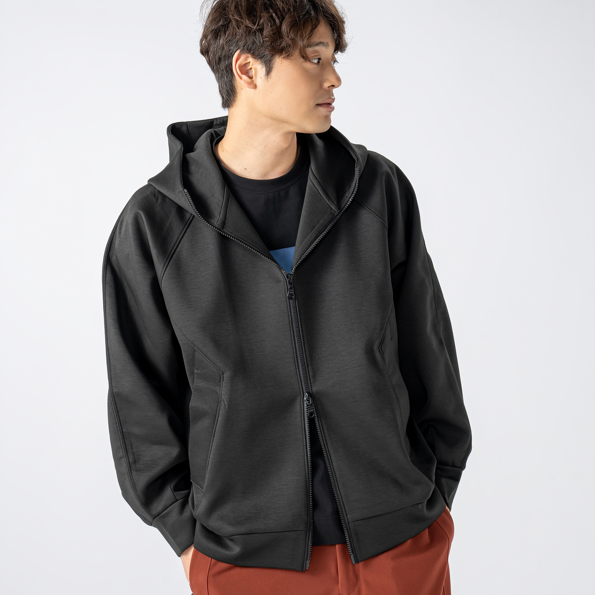 オリジナルダンボールニットで仕立てたパーカー。細かいディティールにこだわった切り替えデザインが、日常の装いをさりげなく格上げします