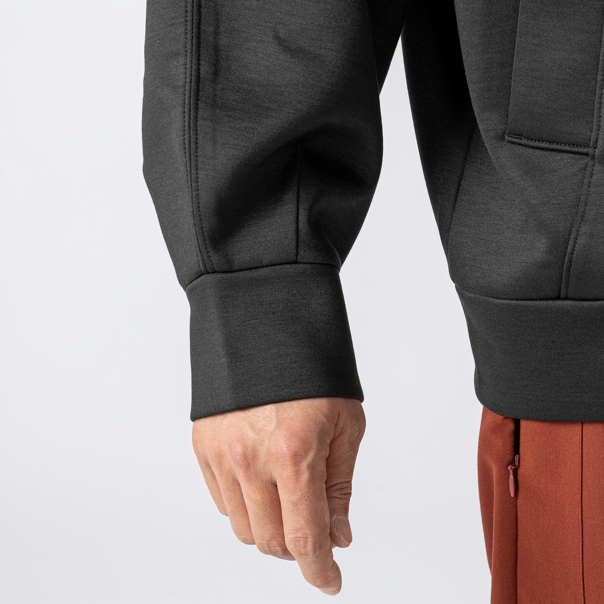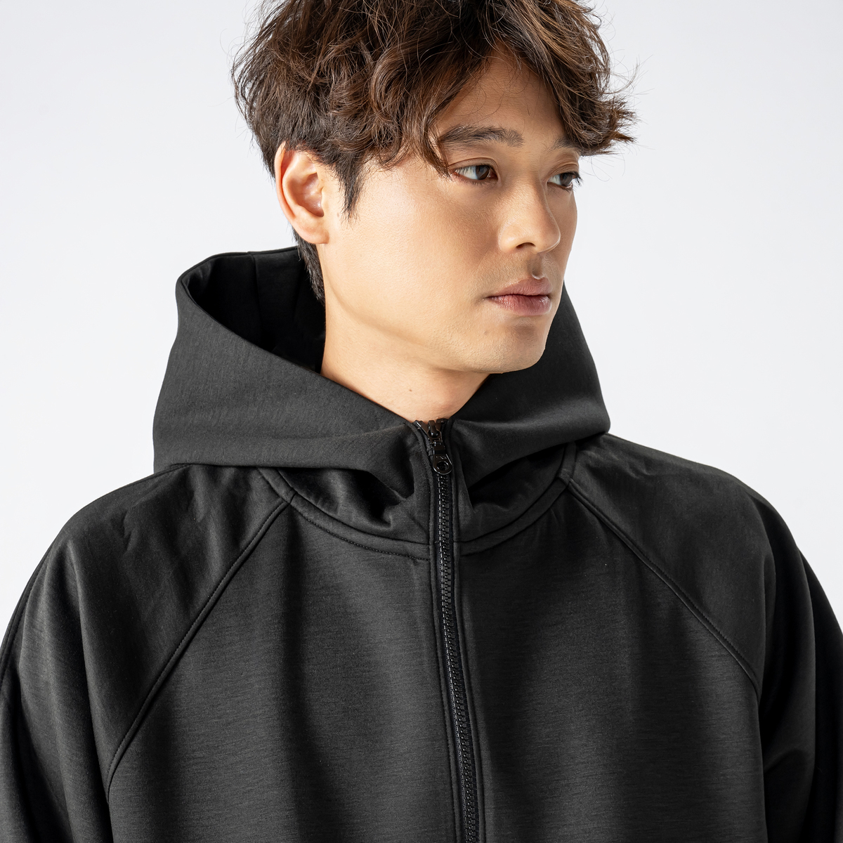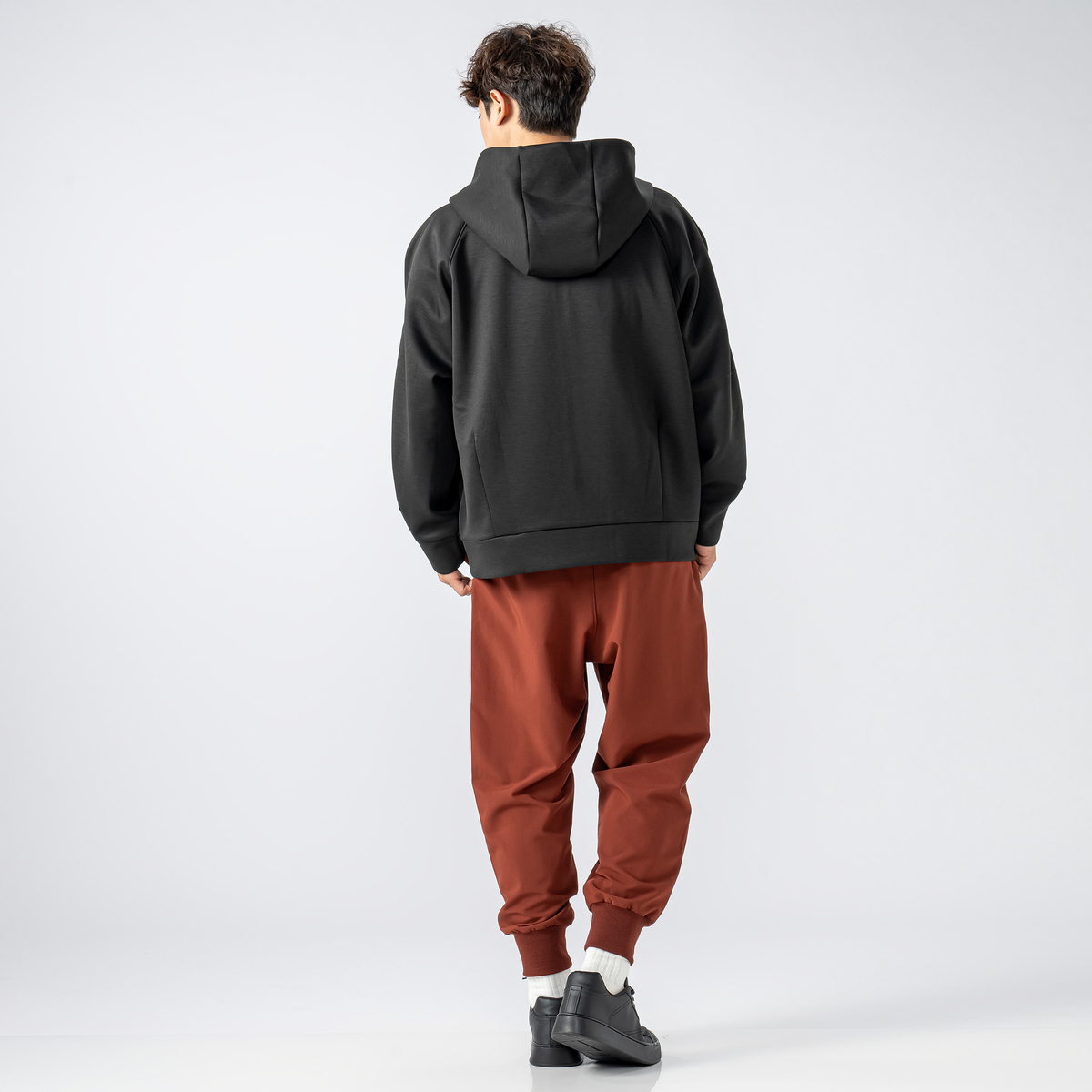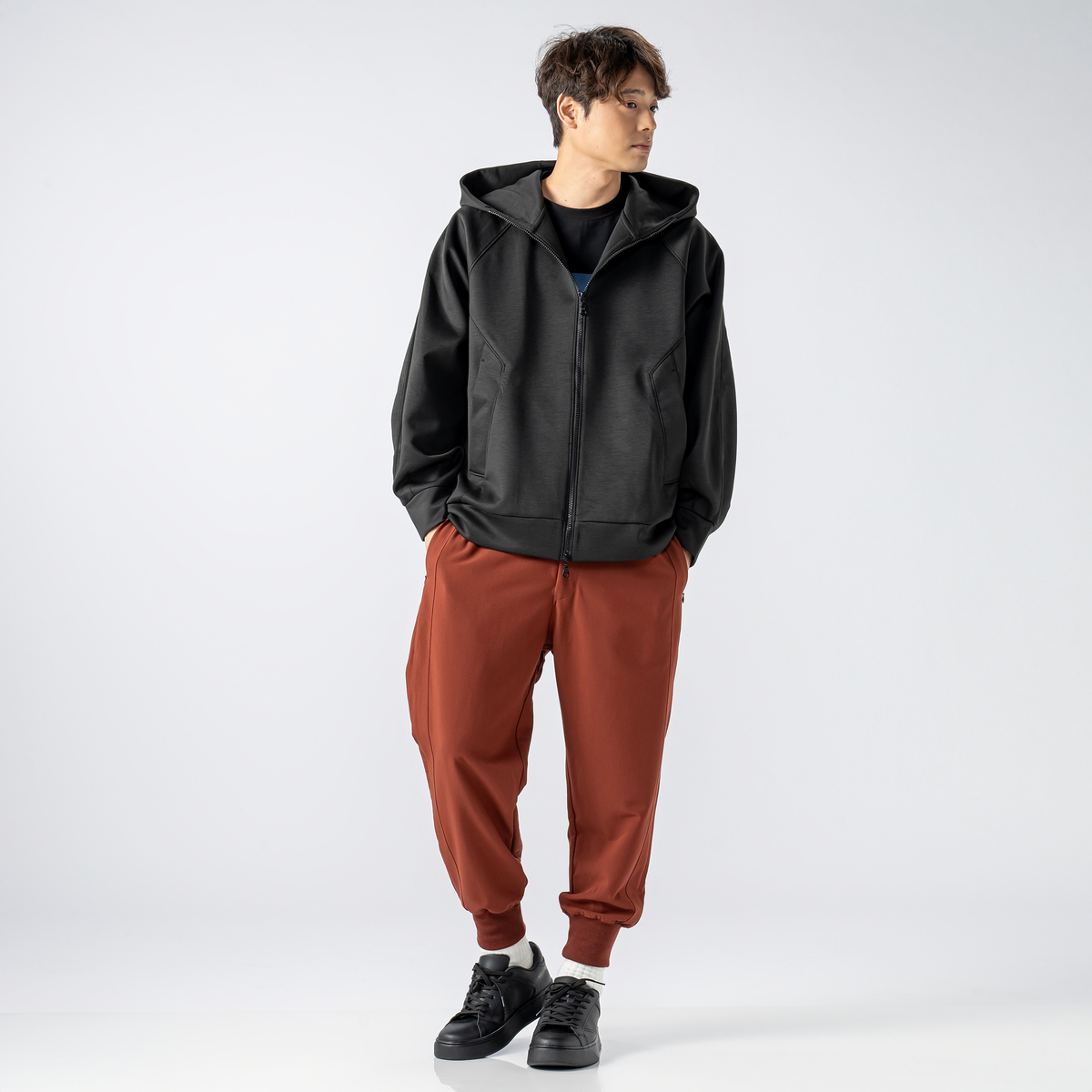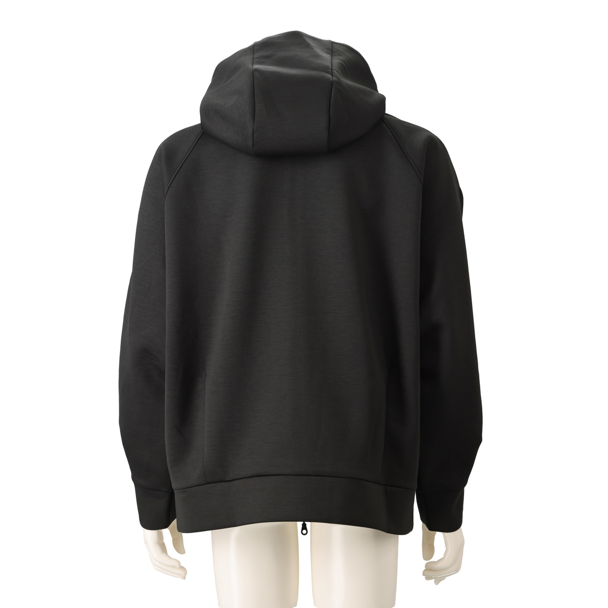 オリジナルダンボールニットで仕立てたパーカー。細かいディティールにこだわった切り替えデザインが、日常の装いをさりげなく格上げします