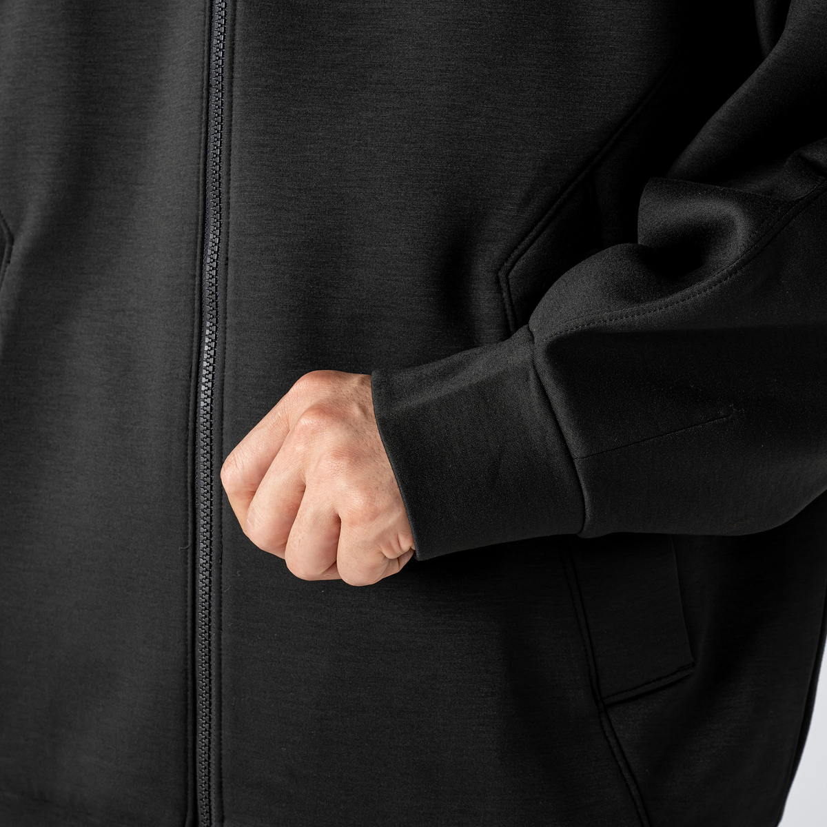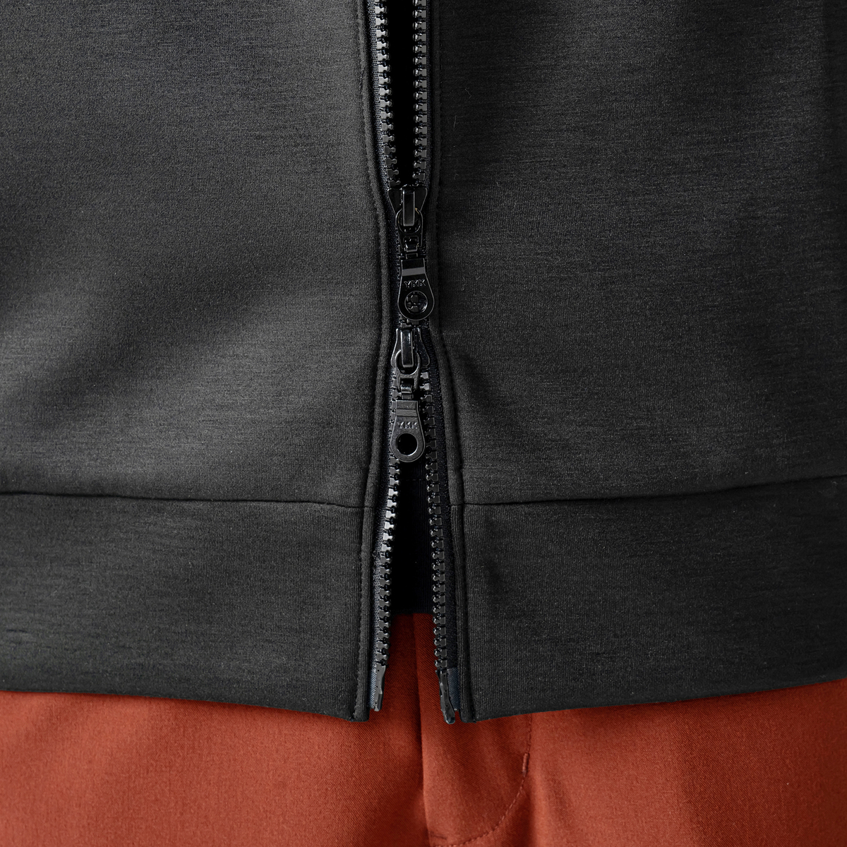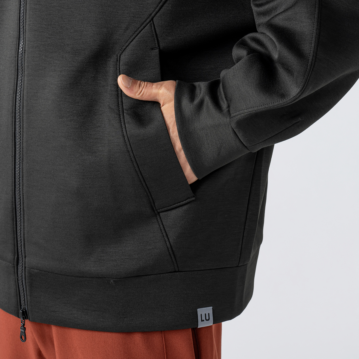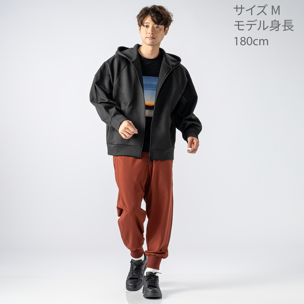 オリジナルダンボールニットで仕立てたパーカー。細かいディティールにこだわった切り替えデザインが、日常の装いをさりげなく格上げします