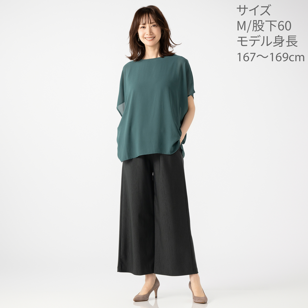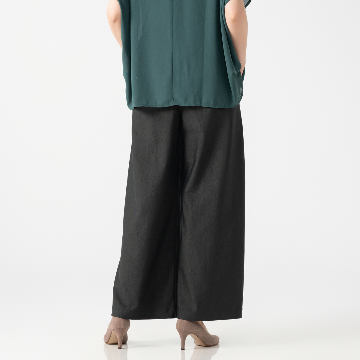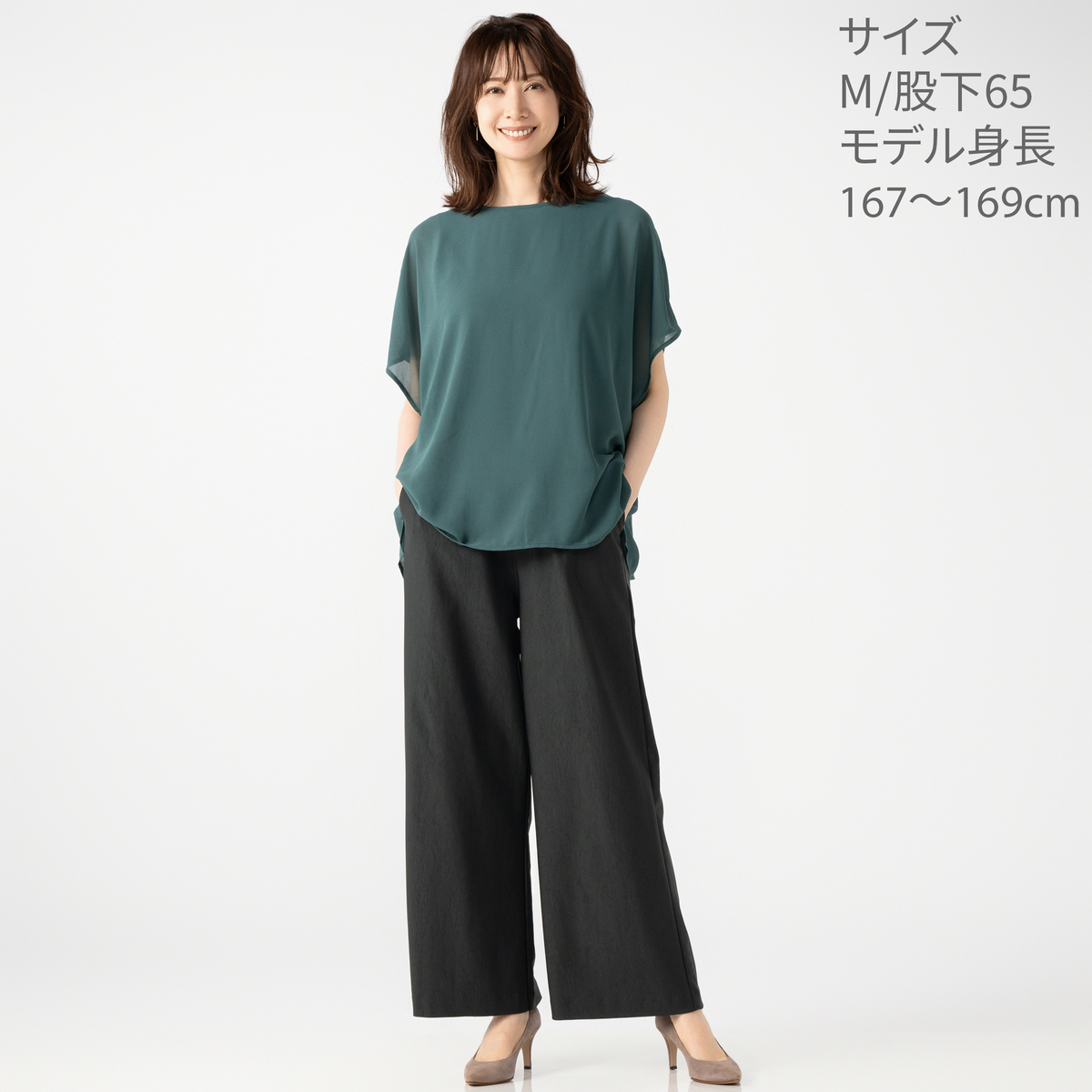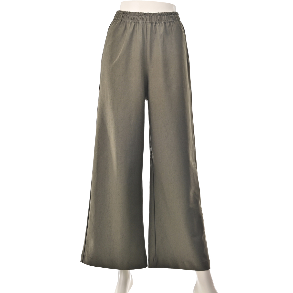 ウエストは総ゴム仕様でお腹周りをすっぽり包み、体型をカバーするワイドシルエット。生地の柔らかさと美しいドレープ感がフェミニンな印象を与えます
