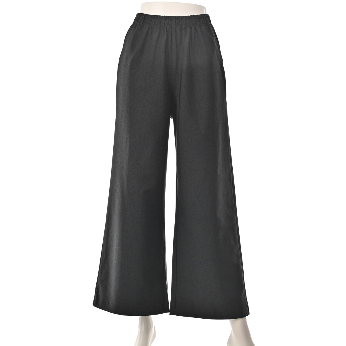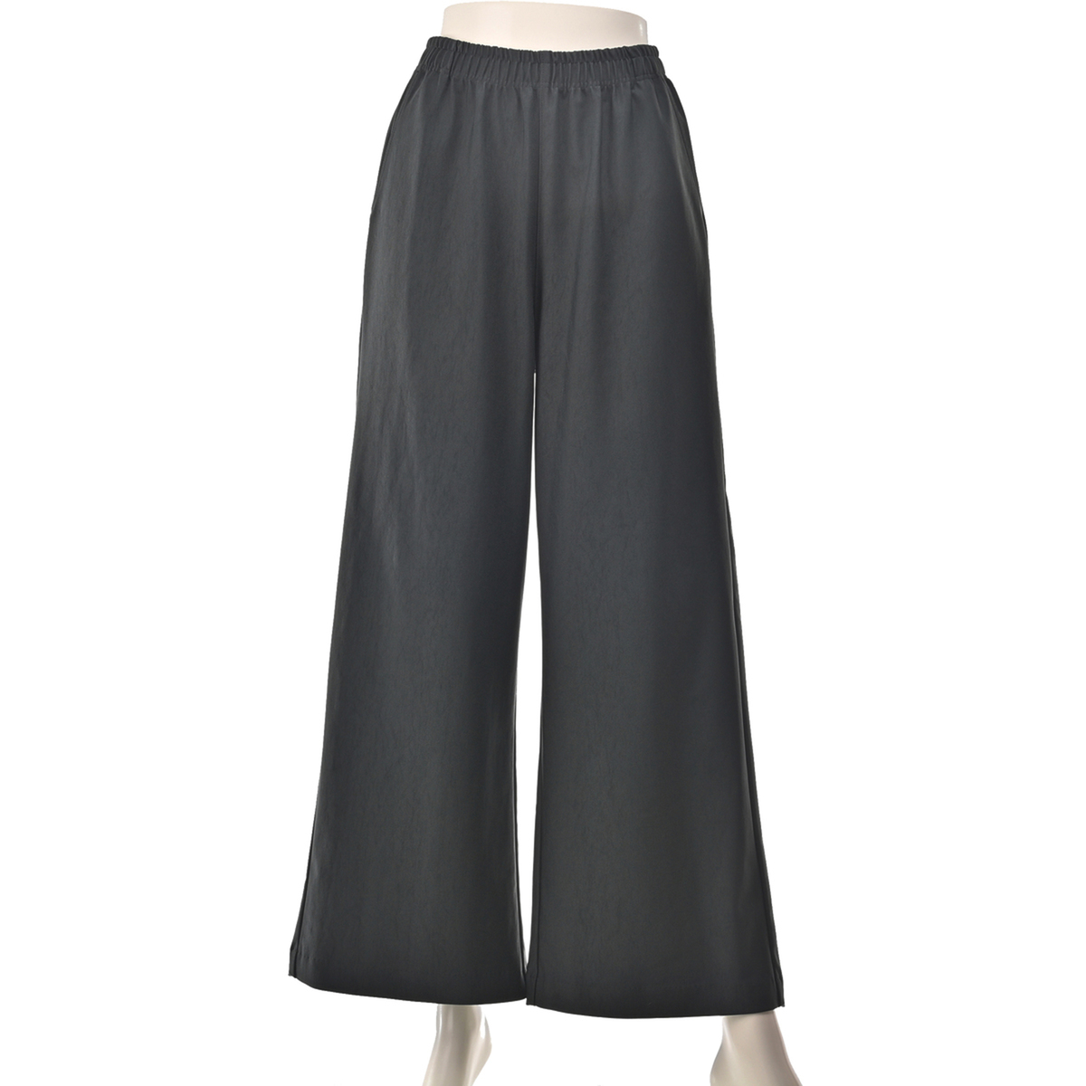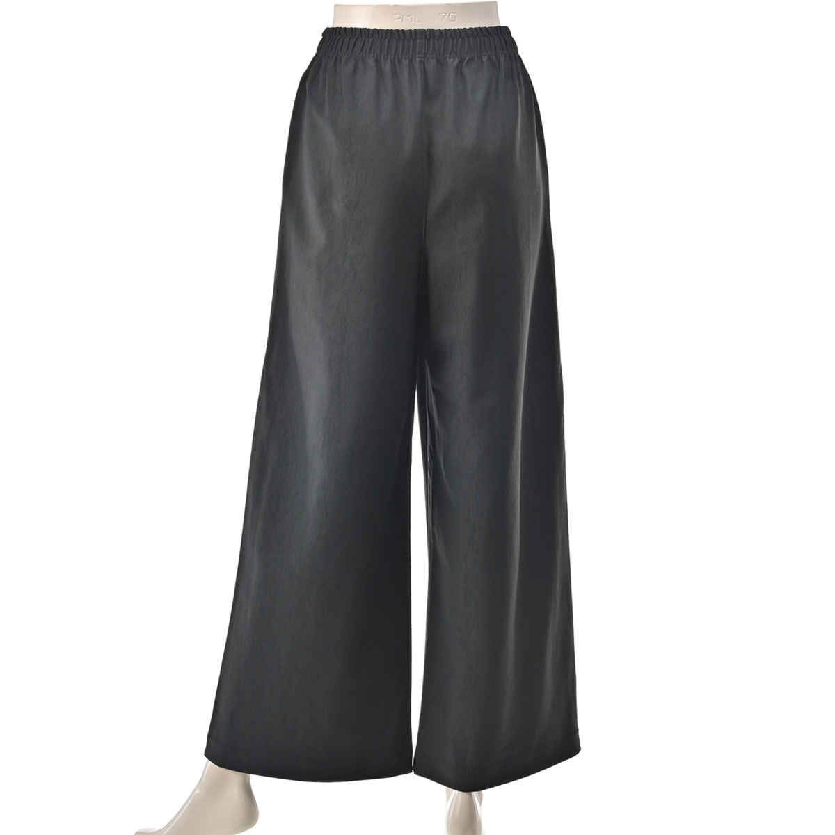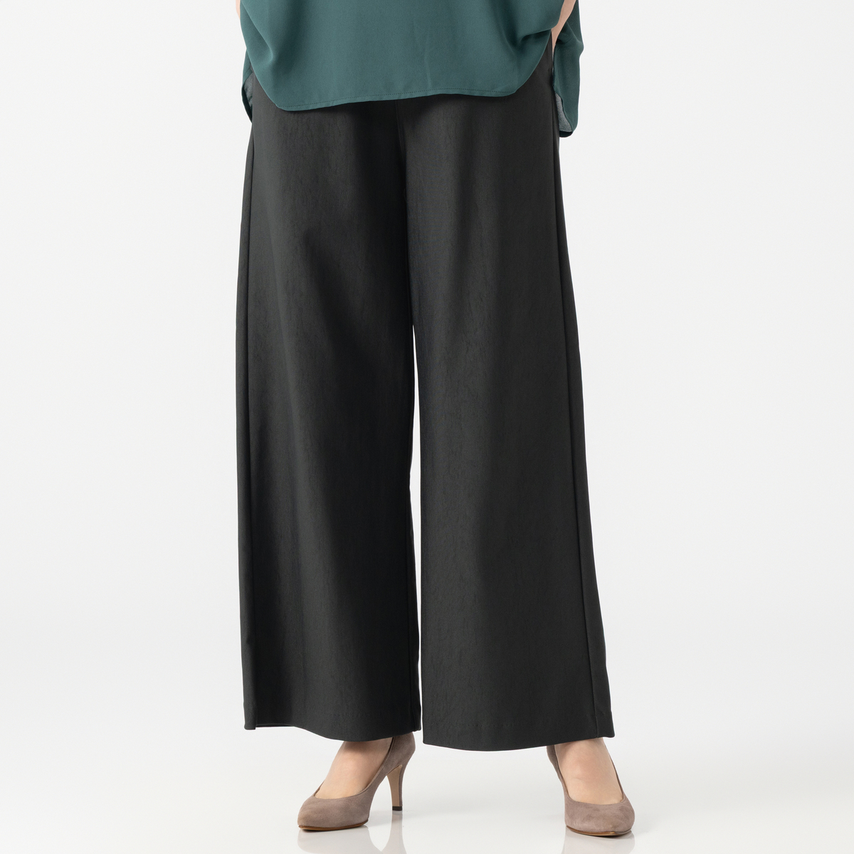 ウエストは総ゴム仕様でお腹周りをすっぽり包み、体型をカバーするワイドシルエット。生地の柔らかさと美しいドレープ感がフェミニンな印象を与えます