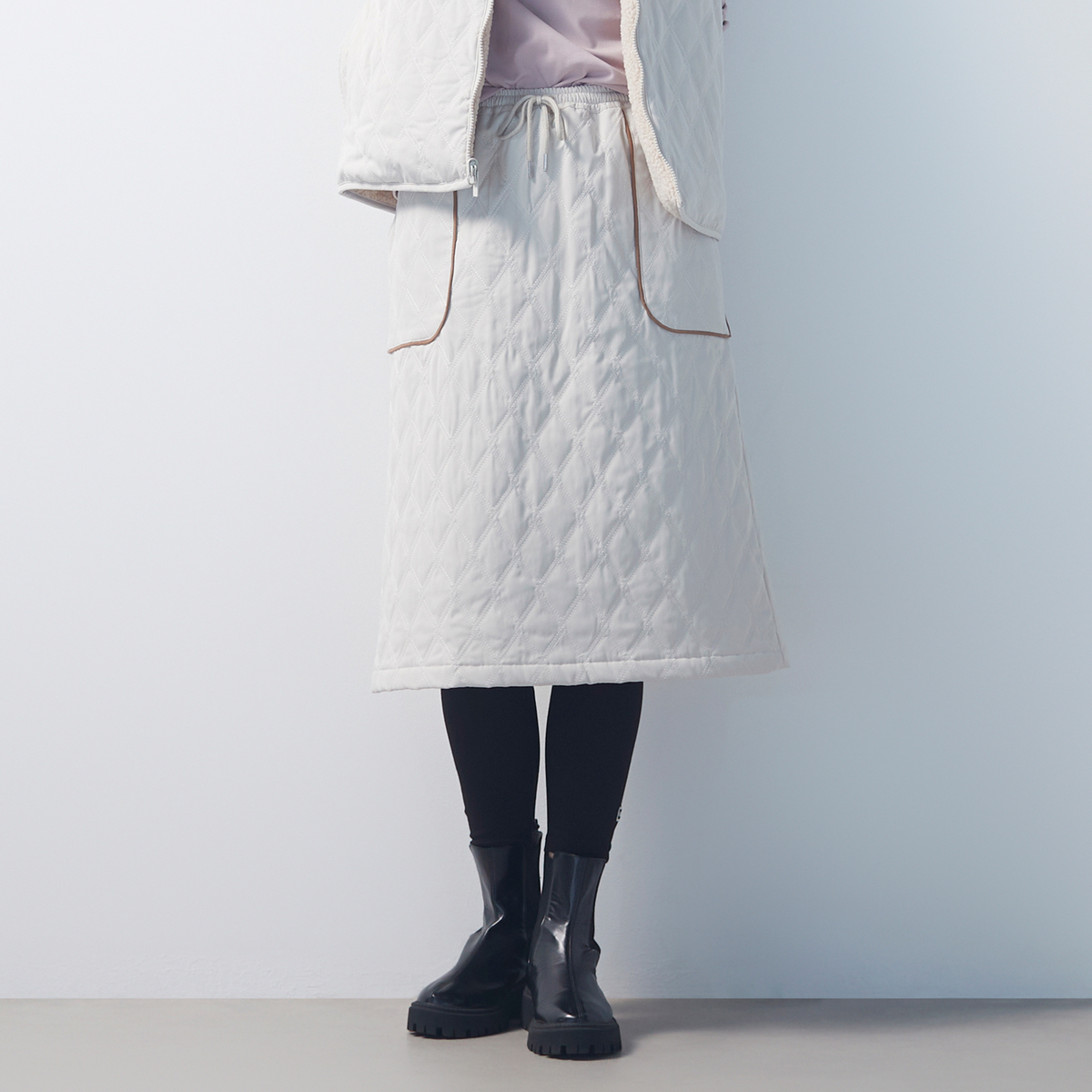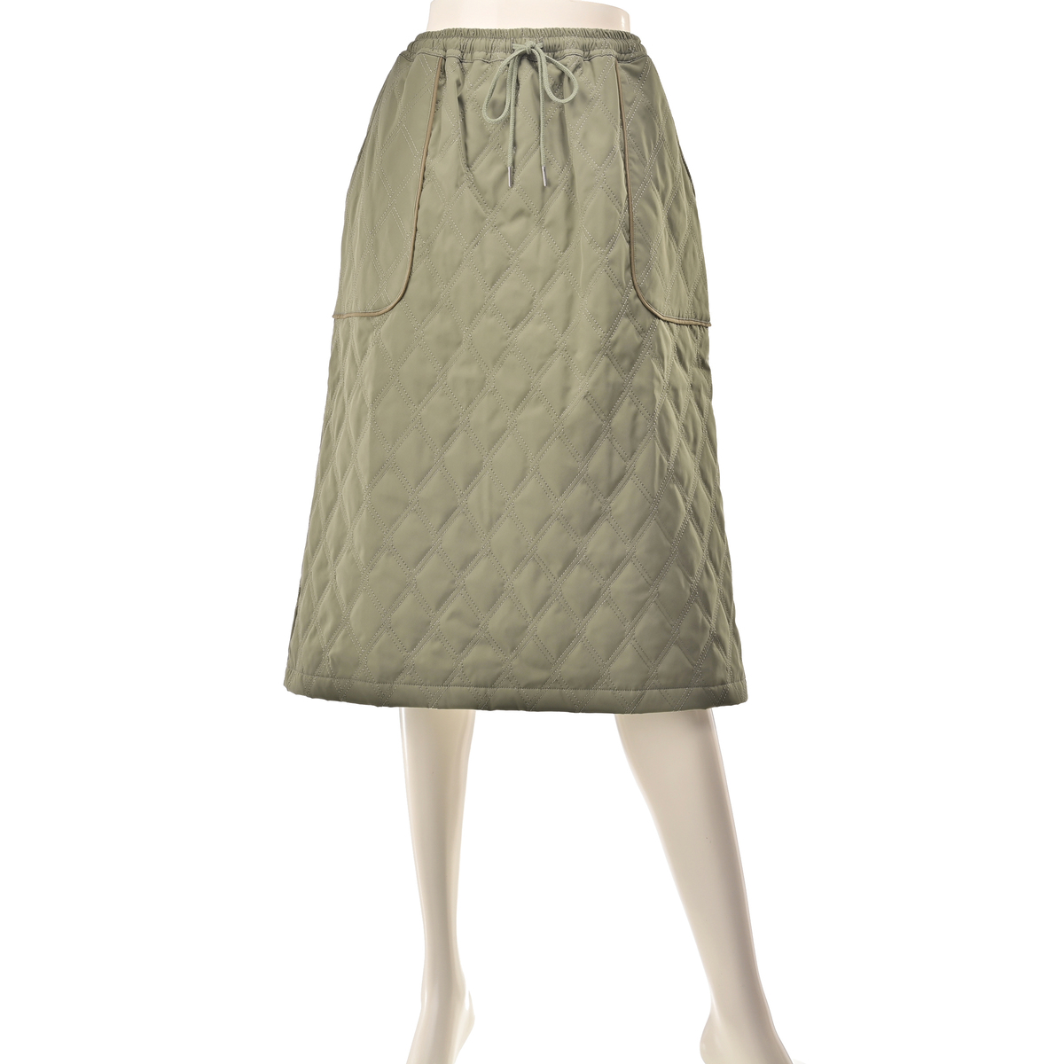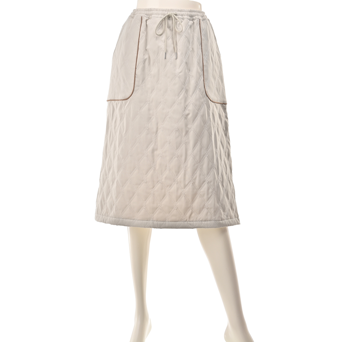 プルオンタイプのキルティングスカートです。ふくらはぎが、ぎりぎり隠れる丈感。スエード素材の配色パイピングポケットがさりげないアクセントとなり、日常のコーディネートに個性を添えます