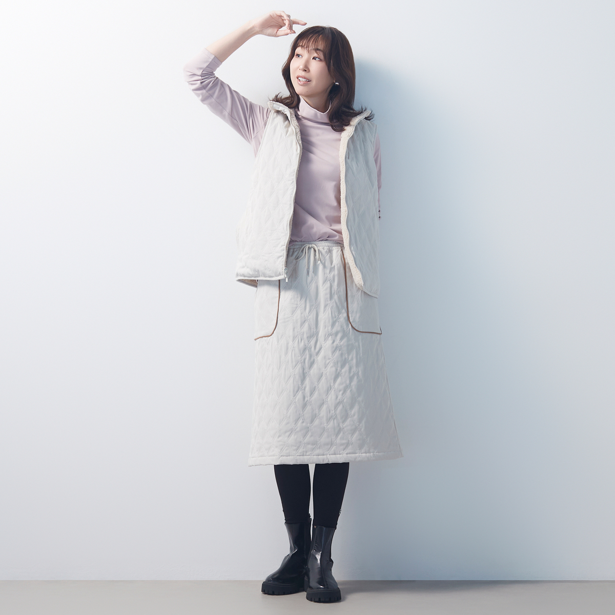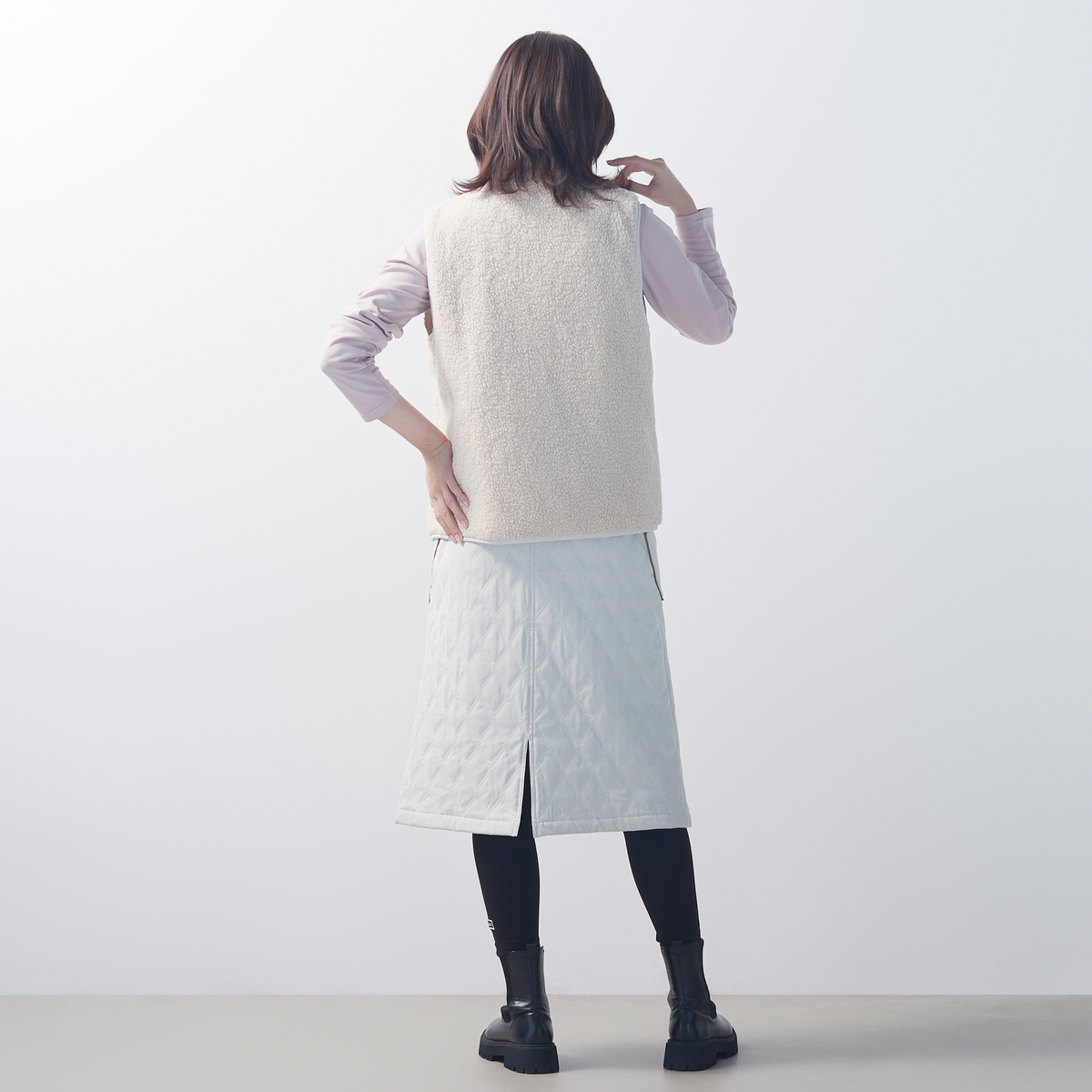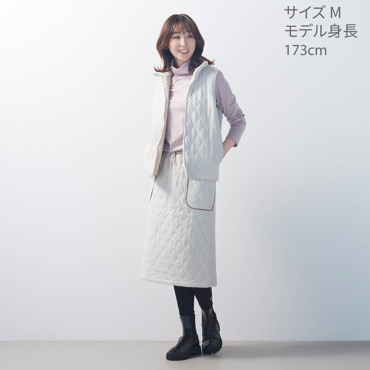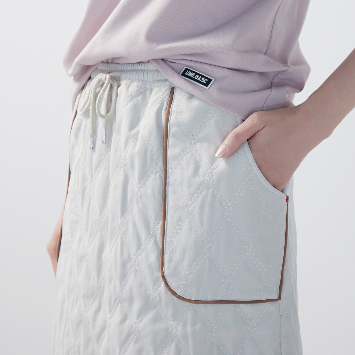 プルオンタイプのキルティングスカートです。ふくらはぎが、ぎりぎり隠れる丈感。スエード素材の配色パイピングポケットがさりげないアクセントとなり、日常のコーディネートに個性を添えます