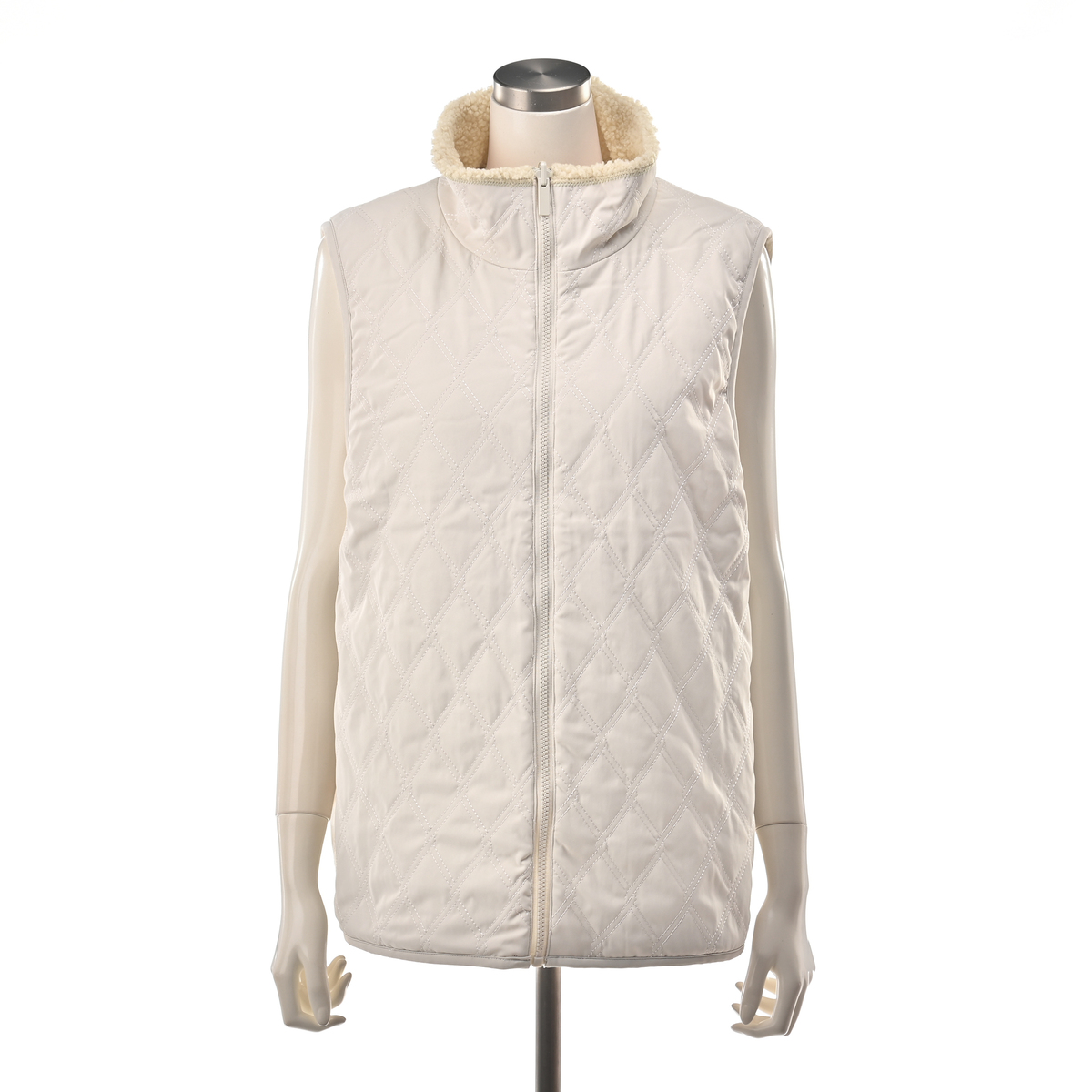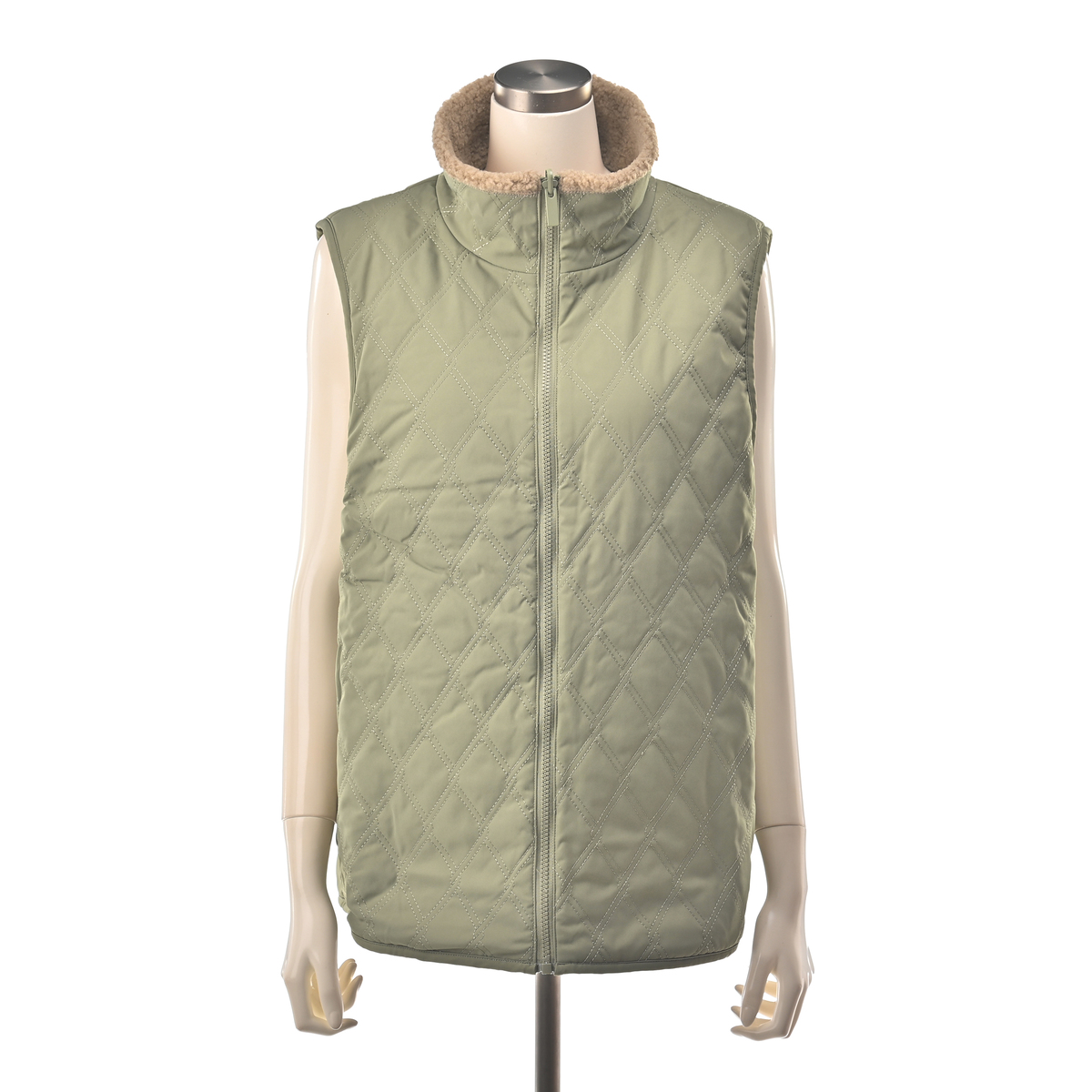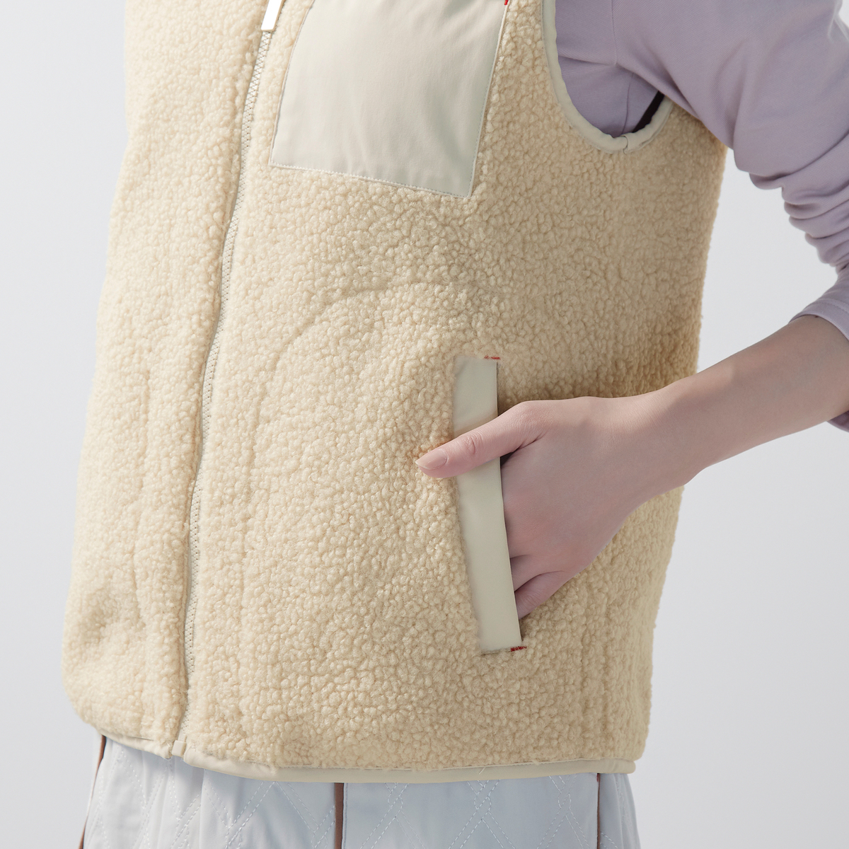 表はシープ調ボア、裏はキルティングのリバーシブル仕様で、1着で異なる表情を楽しめるベスト。ボア面にはピーチタフタのポケットをアクセントに加え、すっきりとしたキルティング面は様々なスタイリングに合わせやすいデザインです