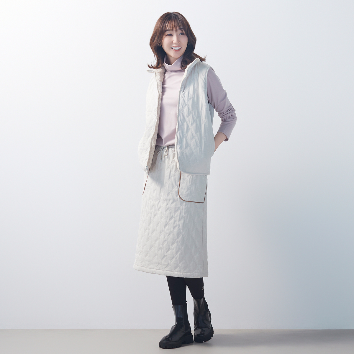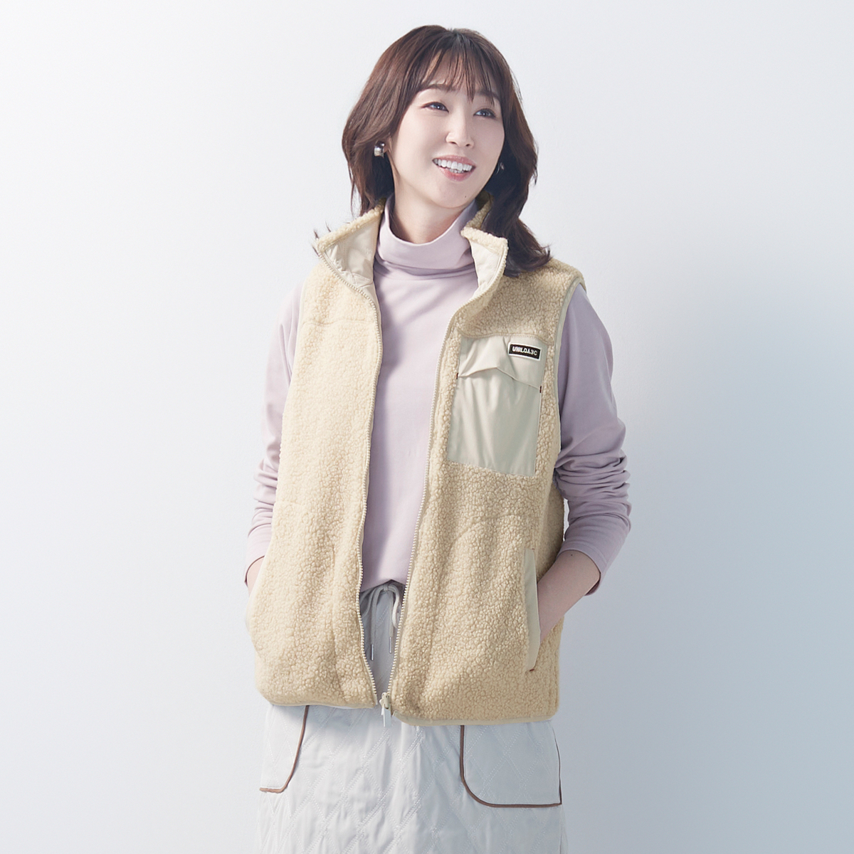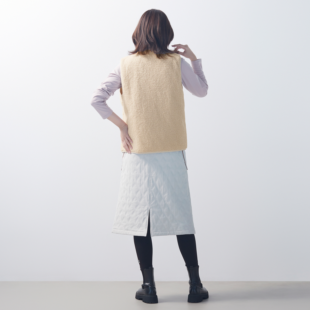 表はシープ調ボア、裏はキルティングのリバーシブル仕様で、1着で異なる表情を楽しめるベスト。ボア面にはピーチタフタのポケットをアクセントに加え、すっきりとしたキルティング面は様々なスタイリングに合わせやすいデザインです