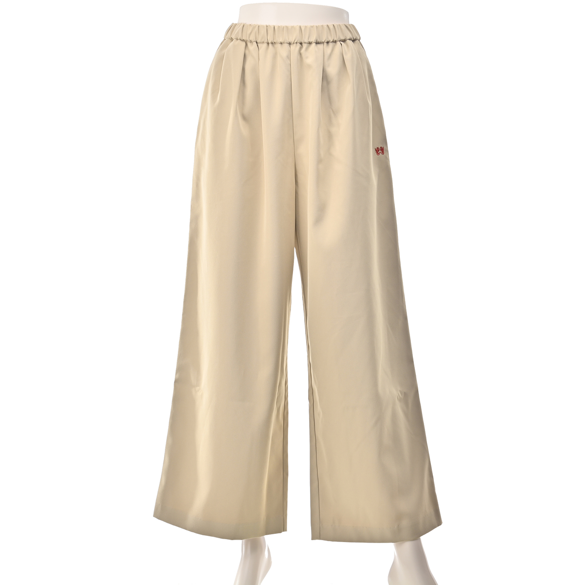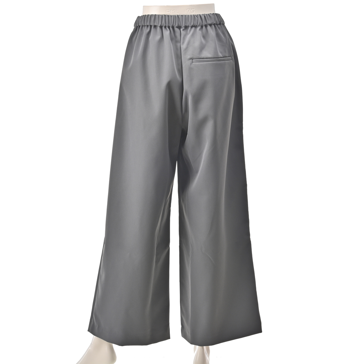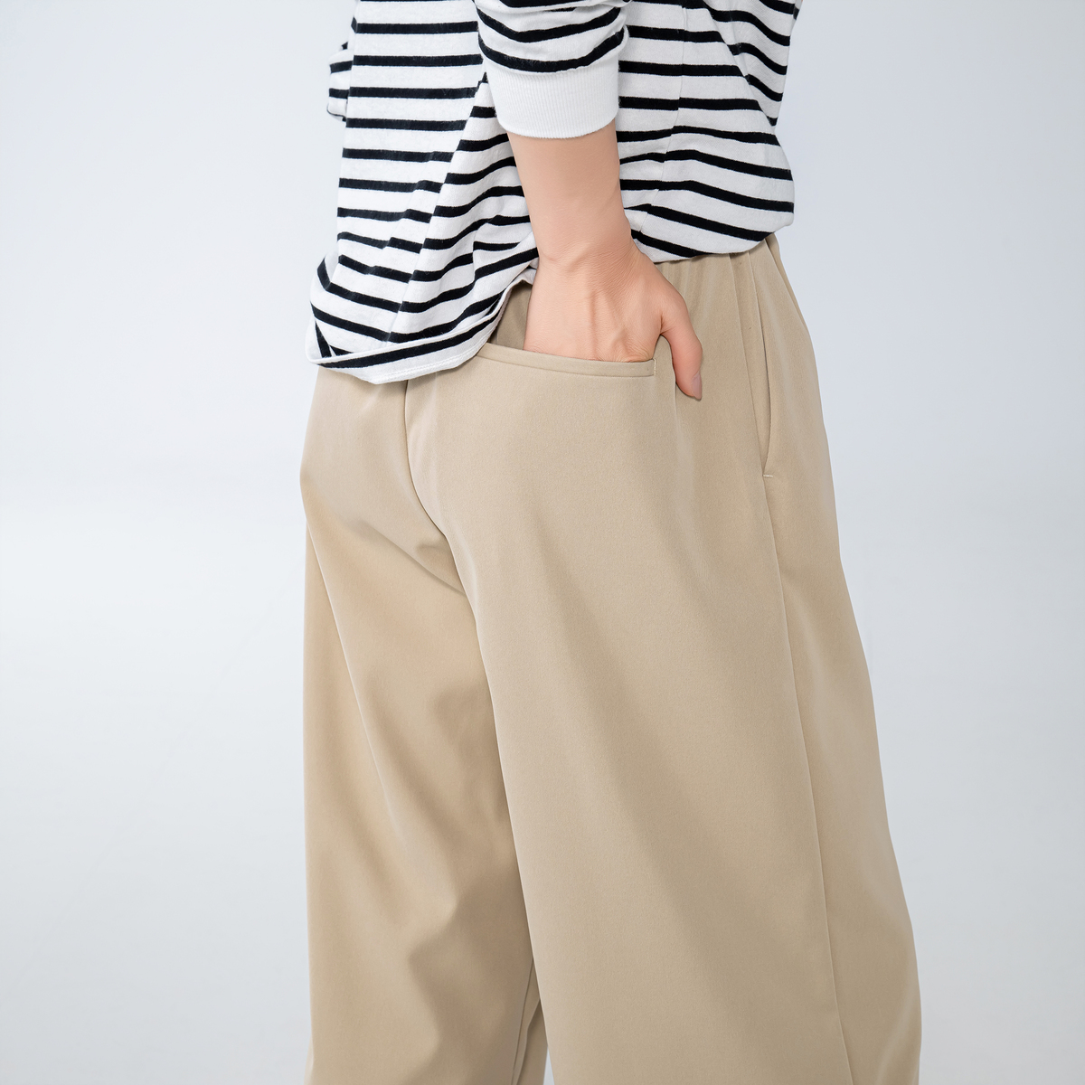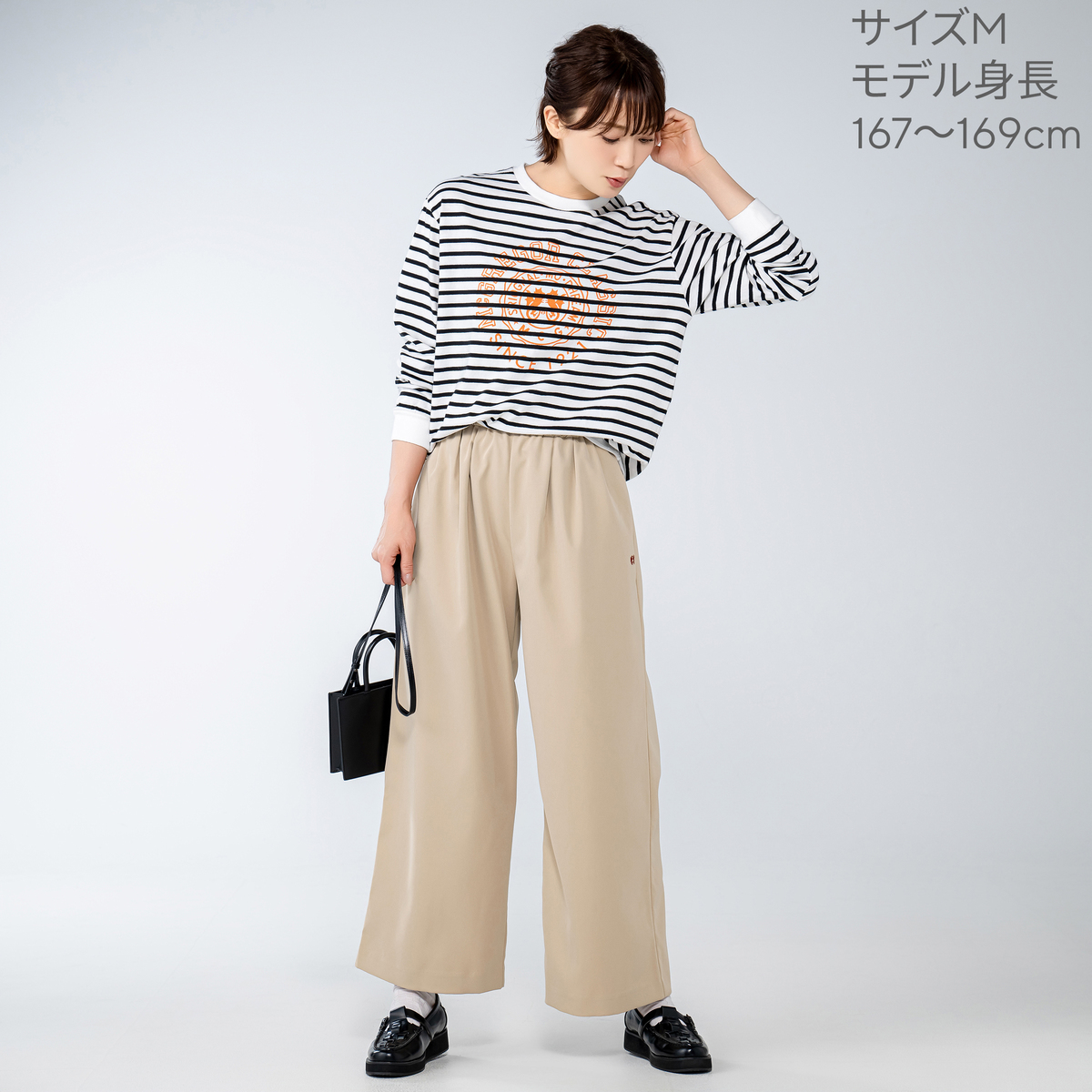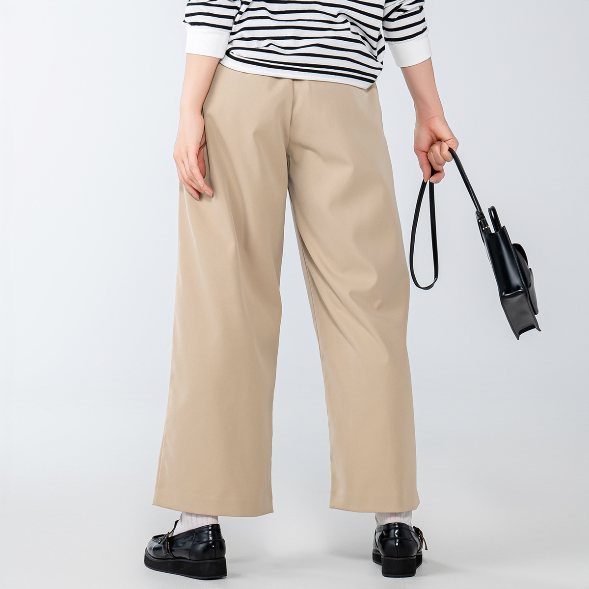 適度なハリとふっくらとした柔らかさを併せ持ったワイドチノパンツ。高密度に織り上げた上品な表面感の綿タッチのポリエステル素材を採用。ウエストゴムで締め付け感を感じにくく、脚のラインを拾いにくいゆったりデザインです
