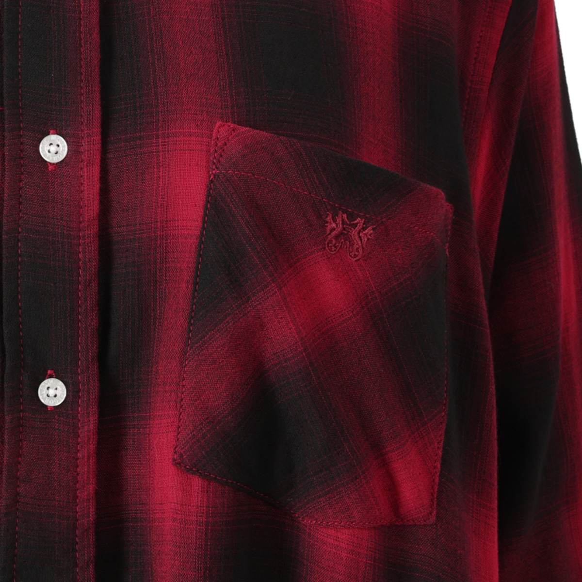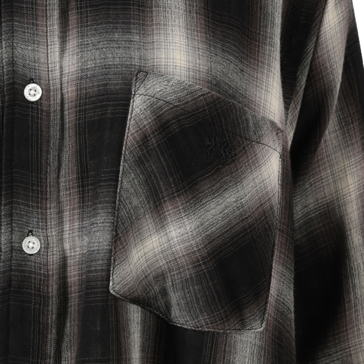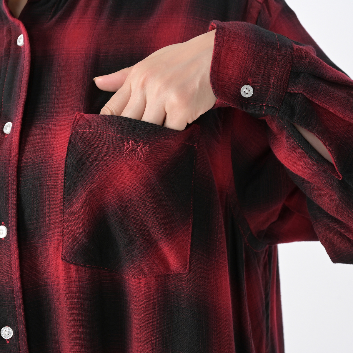 腕まくりや裾からちらりと見える裏地のチェック柄や、ポケット口のドラゴン刺繍がアクセントに。ゆったりとしたシルエットで、普段使いからちょっとした外出まで幅広く着用できます