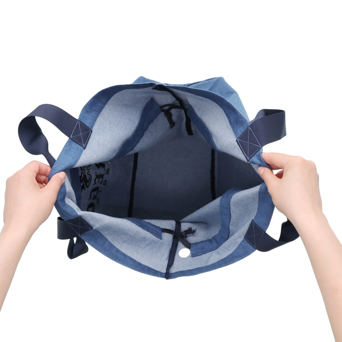 [サイズ(約)] 縦43×横52×マチ18(縦)36(横)cm ハンドル立ち上がり:23cm [重量(約)] 250g [素材] 本体:綿 100% 持ち手部分:ポリエステル 100% 刺繍糸:ポリエステル 100% ※裏地無 [仕様] 開閉:巾着型 底ビョウ:無 [ポケット] 内側:無 外側:無 [注意事項] ※耐荷重は5kg未満です ※ペットボトルや書籍など重い荷物を詰め込みすぎないようご注意ください。 ※5kg以上の荷物を入れると縫製部が破損する可能性があります ※重量を超える荷物は入れないでください ※お洗濯、及び、ドライクリーニングはお控えください ※摩擦により色移りすることがあります。特に雨や汗等で濡れた状態で使用すると色移りすることがありますのでご注意ください ※淡色のものとの組み合わせは極力お避けください。デニムの色が移る可能性があります ※この商品は長時間日光に当たり続けると色あせの恐れがあります。ご注意ください ※生地の特性上、過度の引っ張りを受けると縫い目が開いたり、破れたりすることがありますのでお取り扱いにはご注意ください ※刺しゅう部分の引っ掛かりにご注意ください 【中国製】