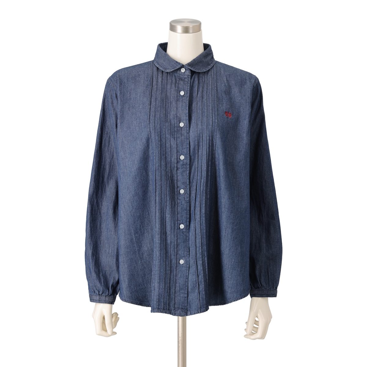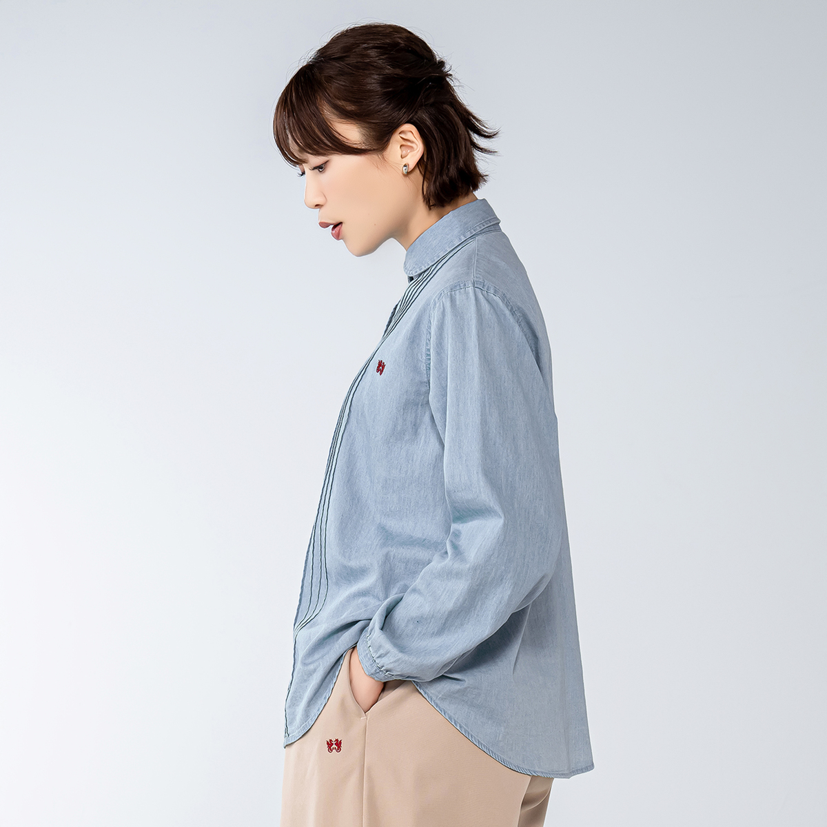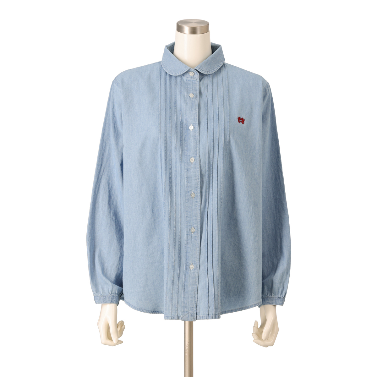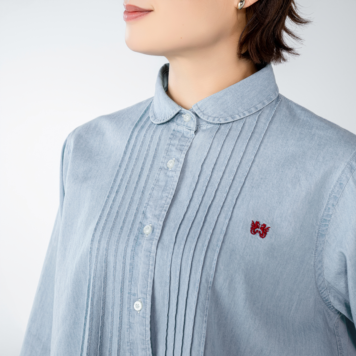 丸襟とピンタックで上品に仕上げたデニムシャツ。左胸にはドラゴンの刺繍をあしらい、アクセントになっています