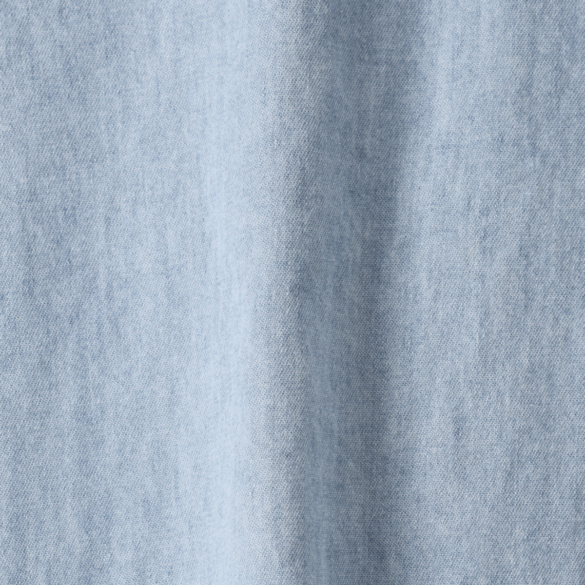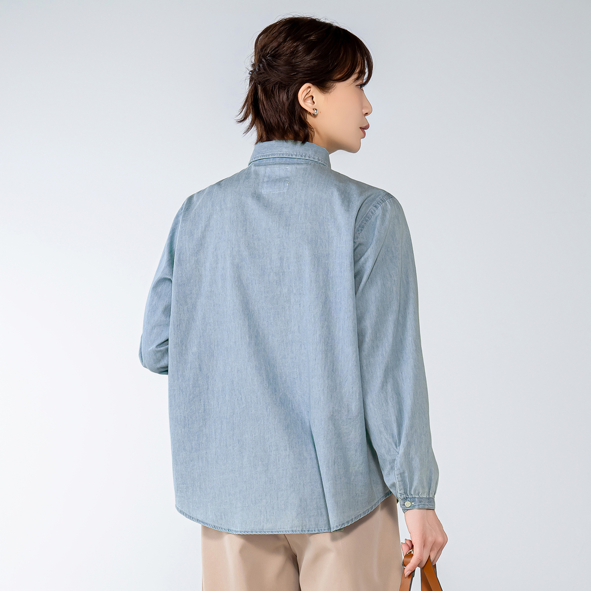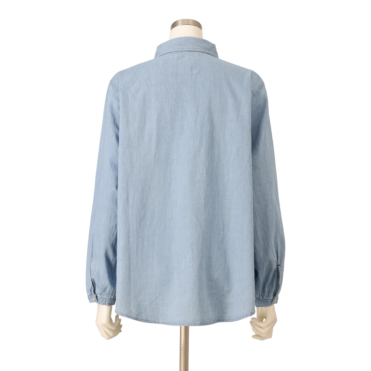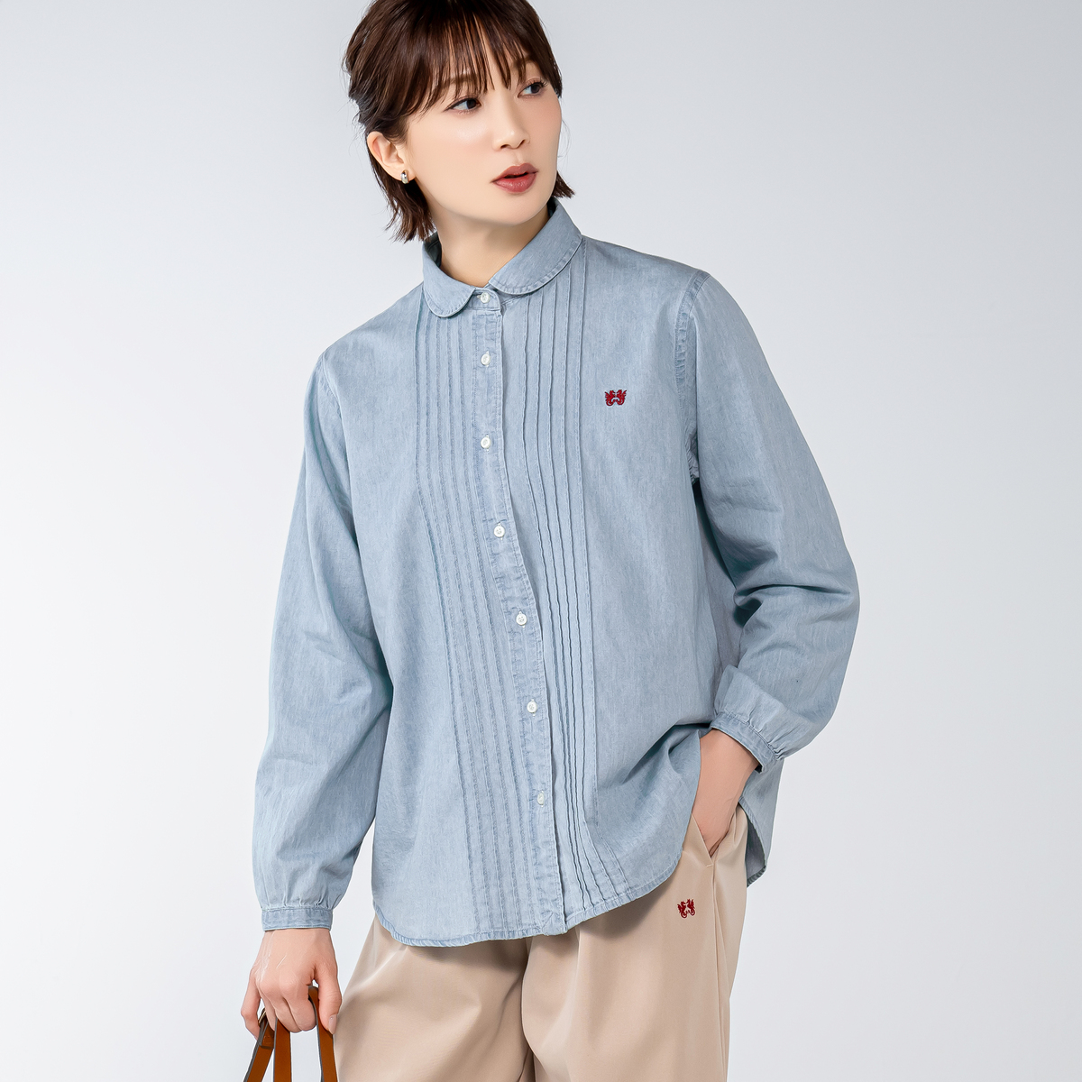 丸襟とピンタックで上品に仕上げたデニムシャツ。左胸にはドラゴンの刺繍をあしらい、アクセントになっています