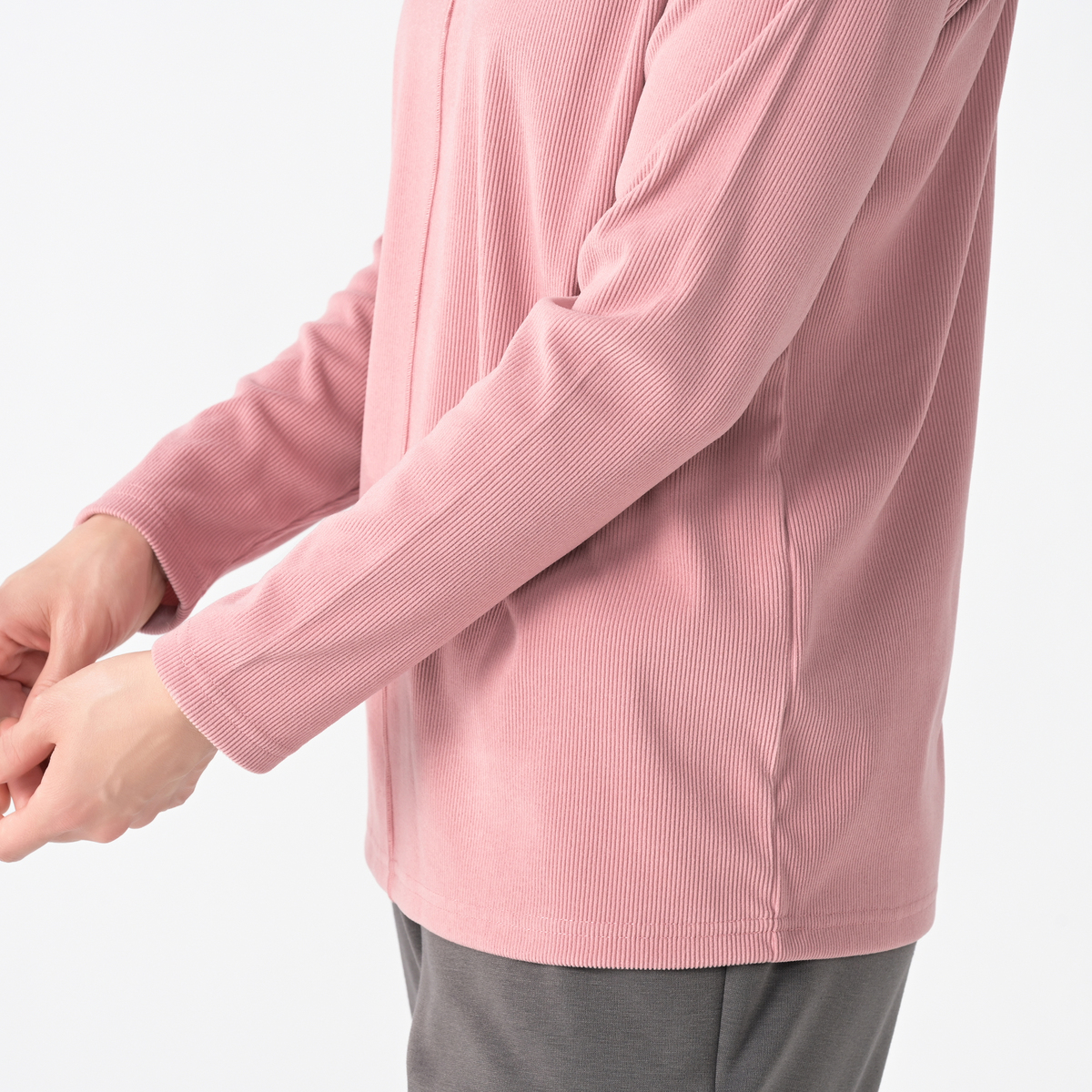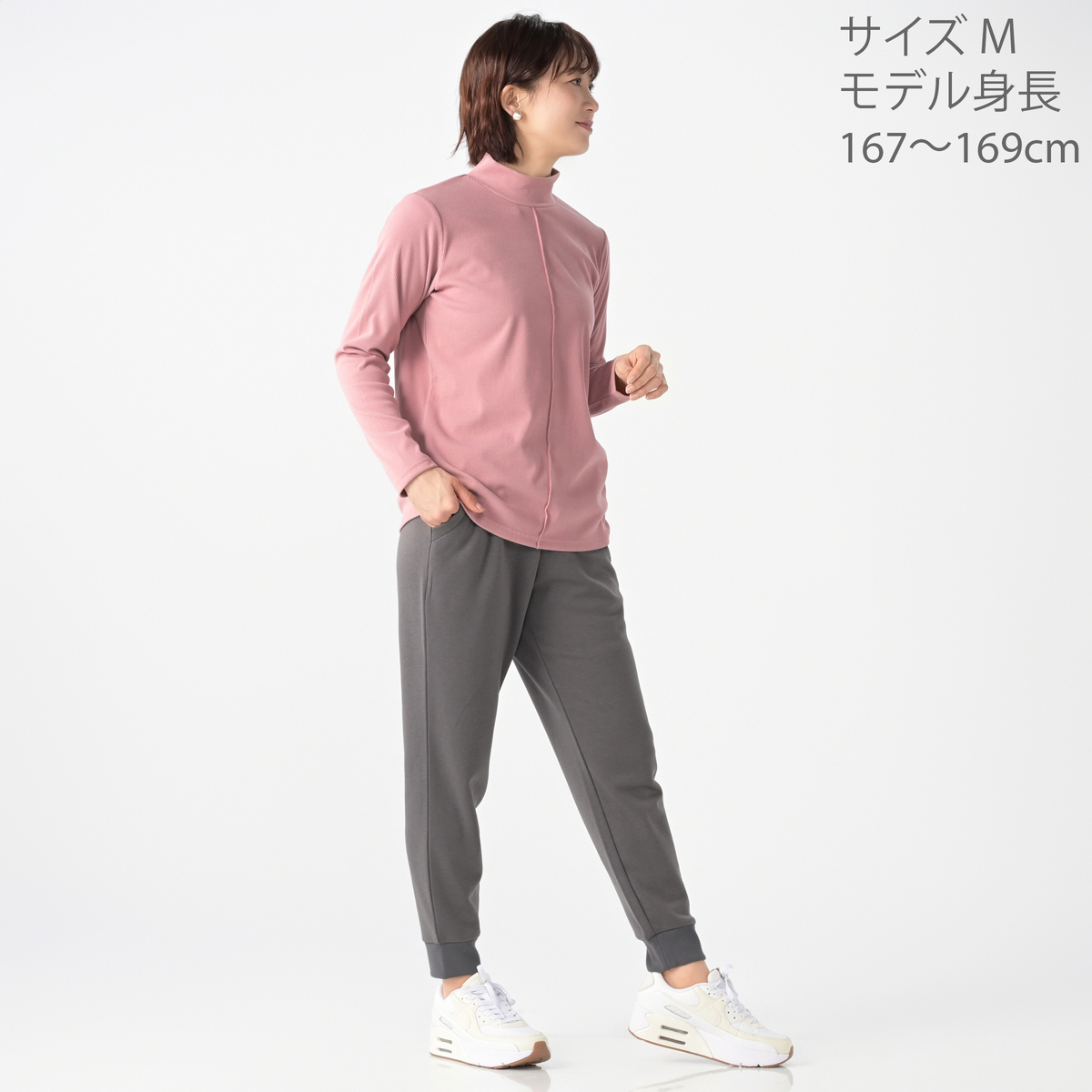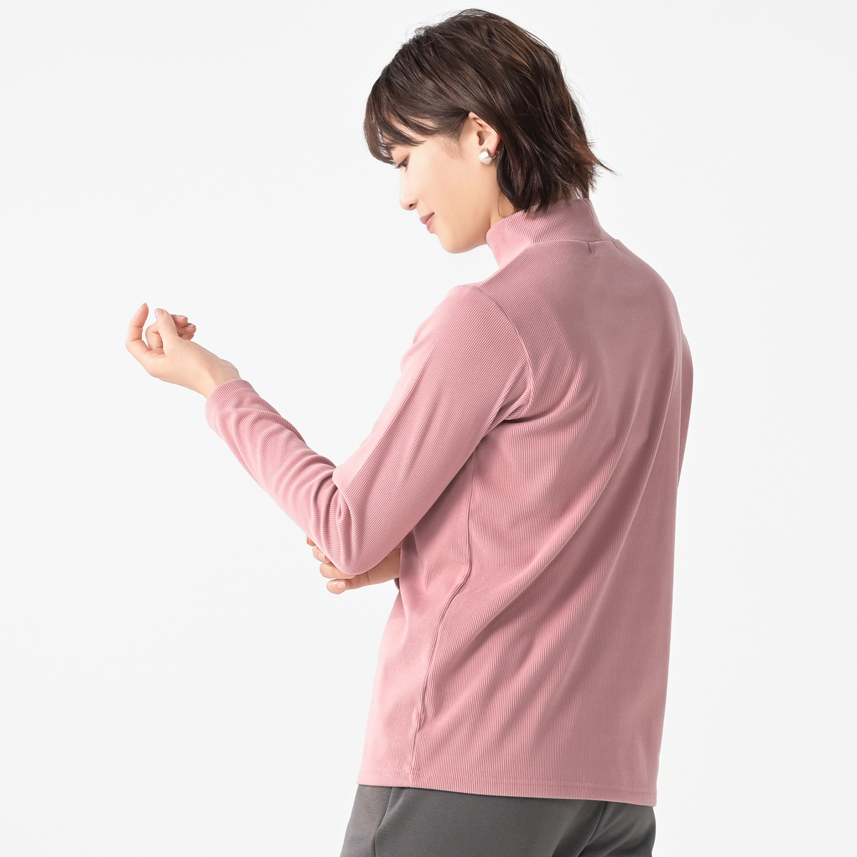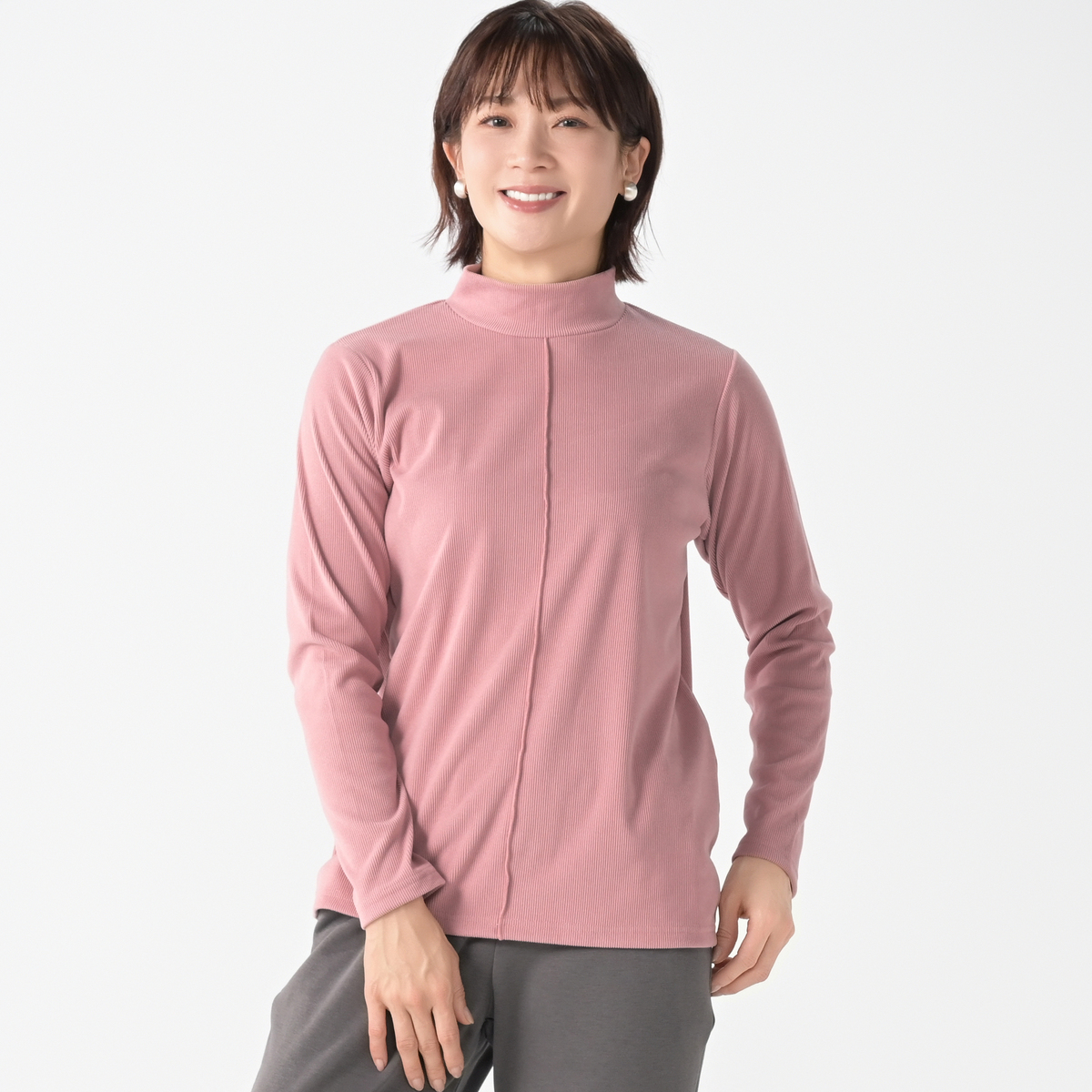 すっきり見えるハイネックプルオーバー。表側に微起毛をかけた素材で、柔らかな風合いと高見えする質感が魅力。細かいリブ編みで伸縮性があり動きやすく、裏側はなめらかで快適な着心地です