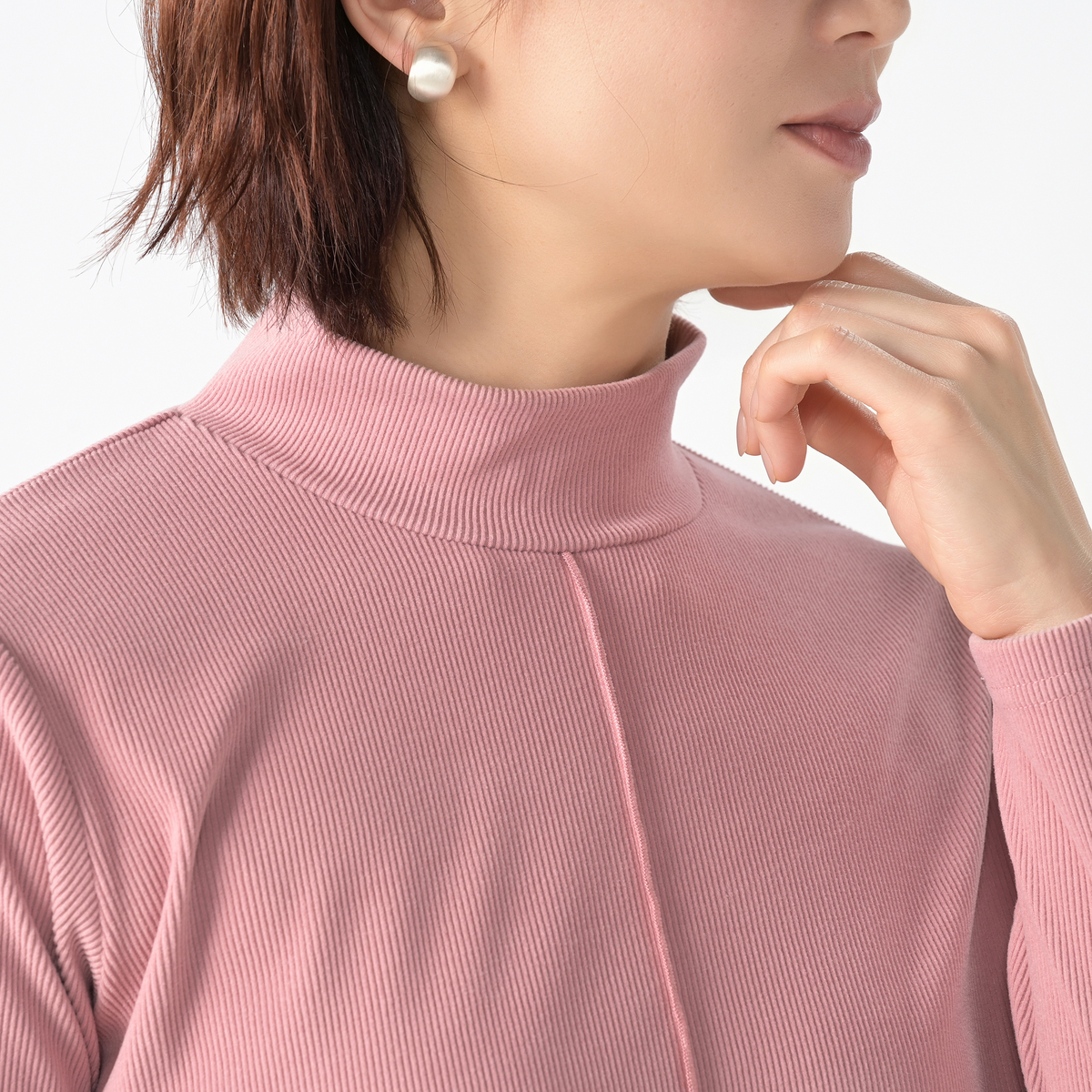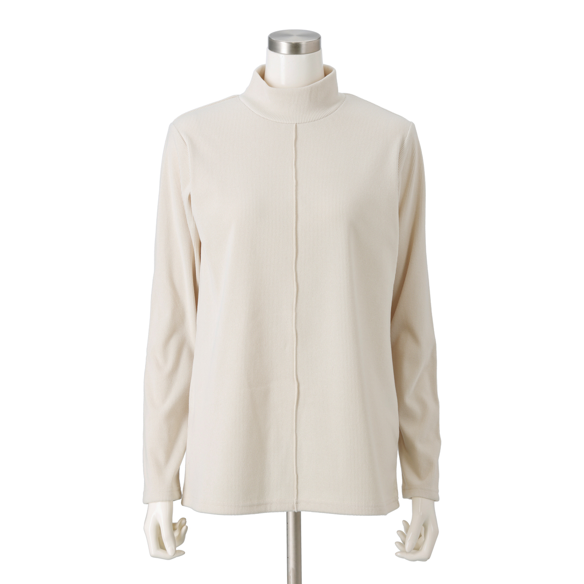前身頃のセンターシームがポイント。シンプルなデザインに、メロウ仕上げの縫い目で縦ラインを強調し、細見え効果をプラスしました。高すぎないハイネックが首元をほどよくホールドし、ロングシーズンに活躍します