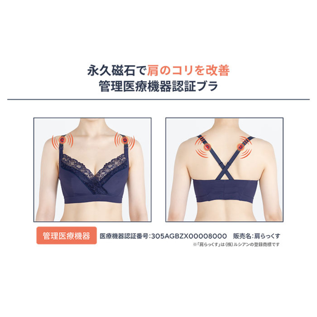 ピップエレキバンとコラボレーションした、指定管理医療機器の家庭用永久磁石磁気治療器として認証を受けたブラジャー。ピップ社製の永久磁石を、左右のストラップの前身側の肩に各1個、背中側の肩甲骨にあたる部分に各1個合計で4個内蔵。肩を動かす筋肉周辺に永久磁石が密着することで、磁気による肩コリへアプローチできるように設定した位置です