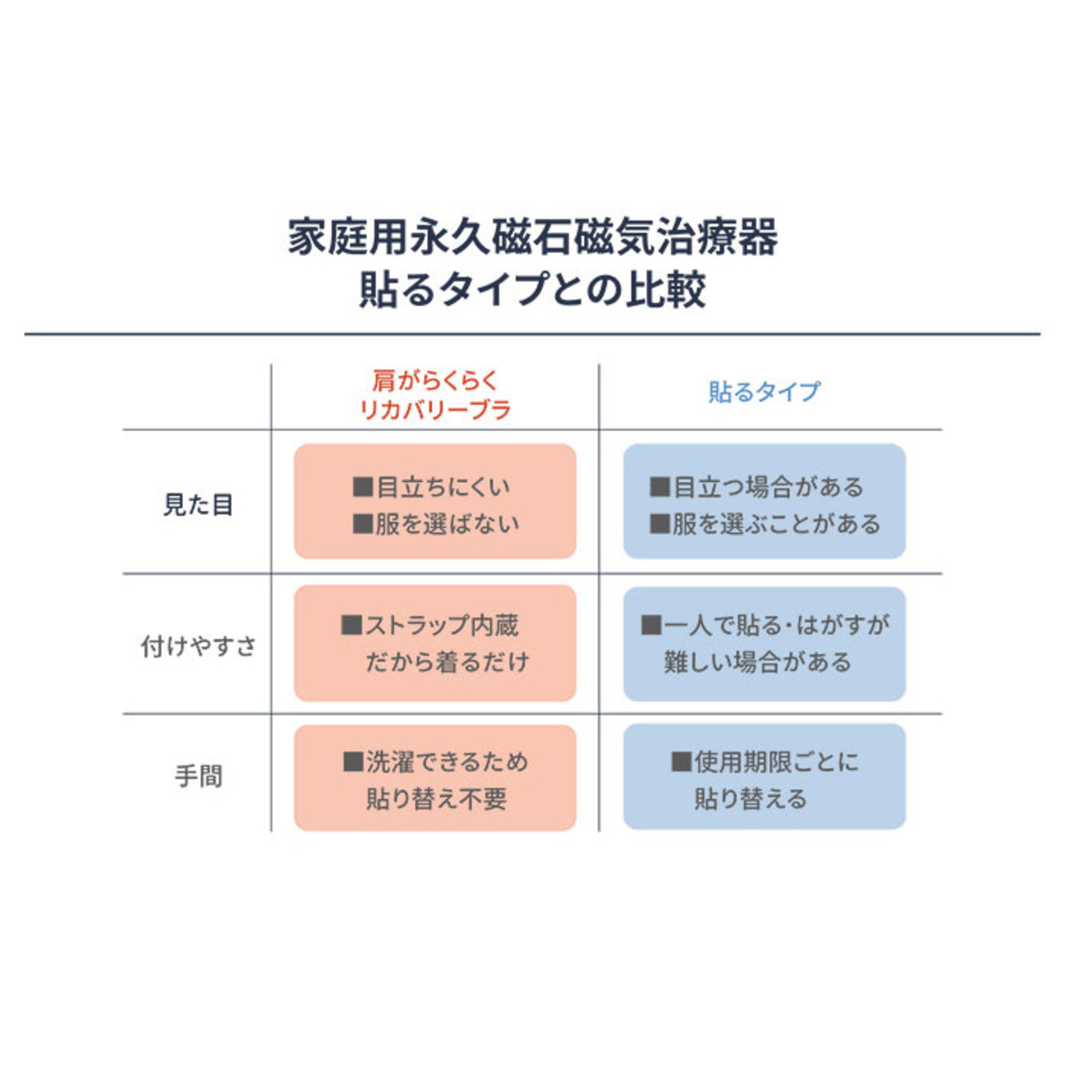 2.ストラップ内蔵のため永久磁石が目立ちにくい。人目を気にせず、服も選ばず肩コリのケアができる