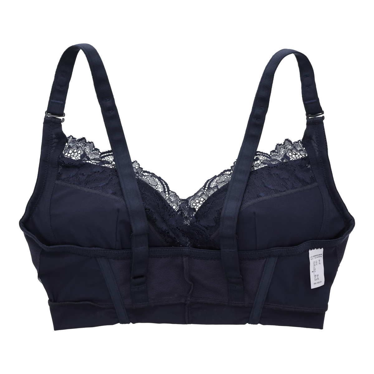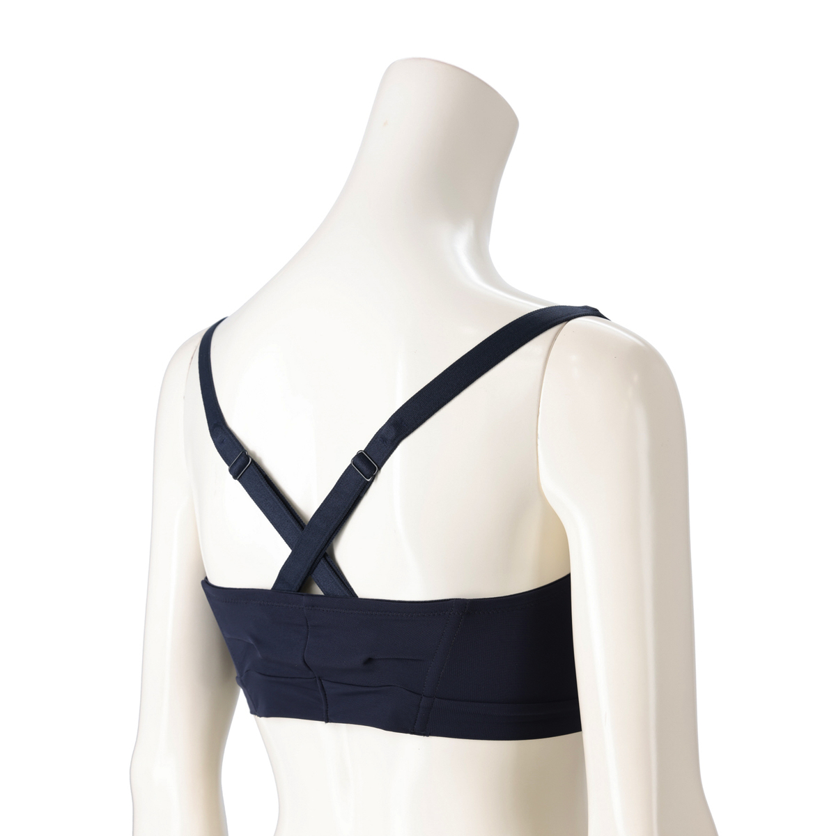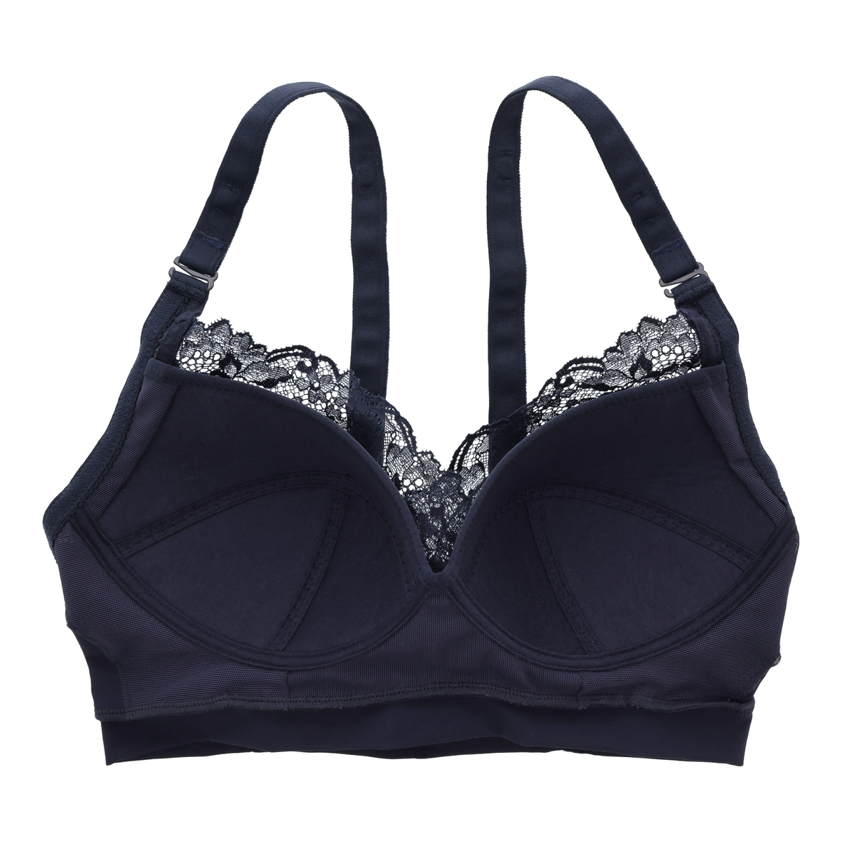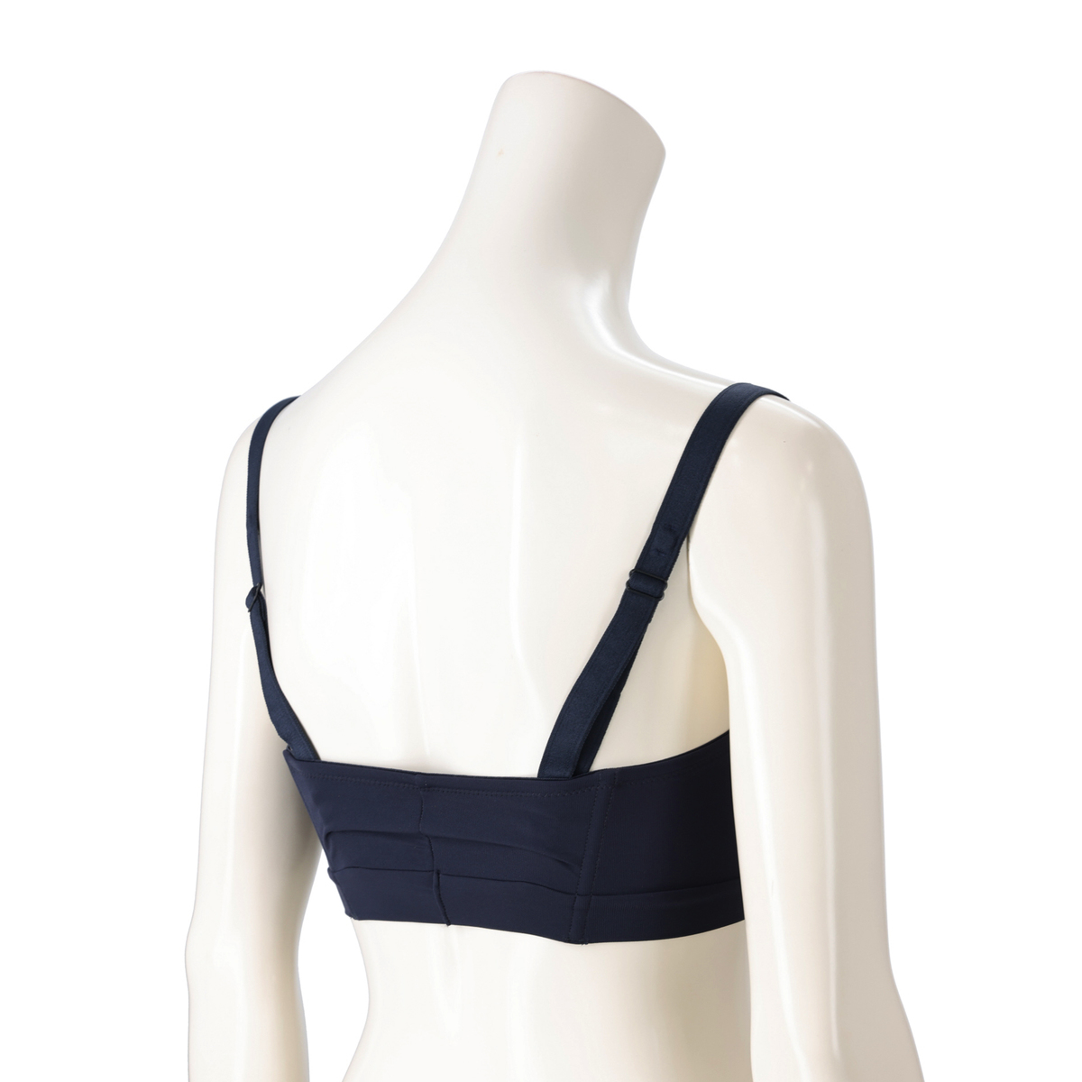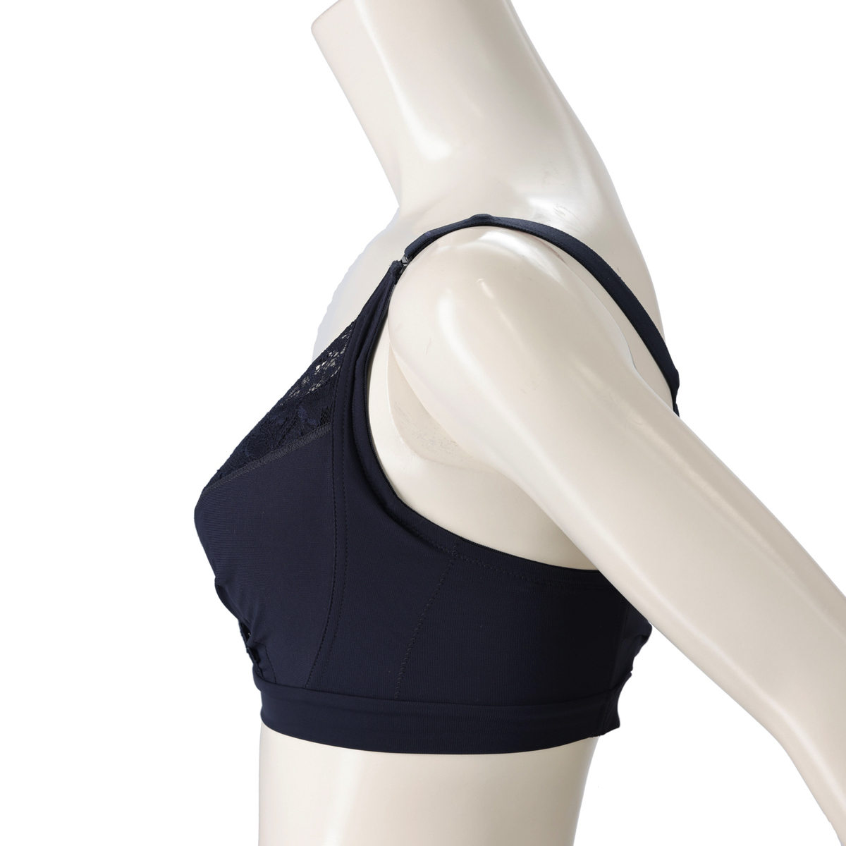 カップはバランスのとれた3/4カップで、サイドは脇高設計。前身側の半分は肌側にパワーネットを裏打ち。2重のパワーで横流れのお肉を自然なラインにサポートします。カップ周りの肌側はサイド以外も伸縮性のあるパワーネットのパネルで囲みました。アンダーはゴムやテープを使わずに身生地を二重にした伸縮性とパワーで優しくホールドさせています