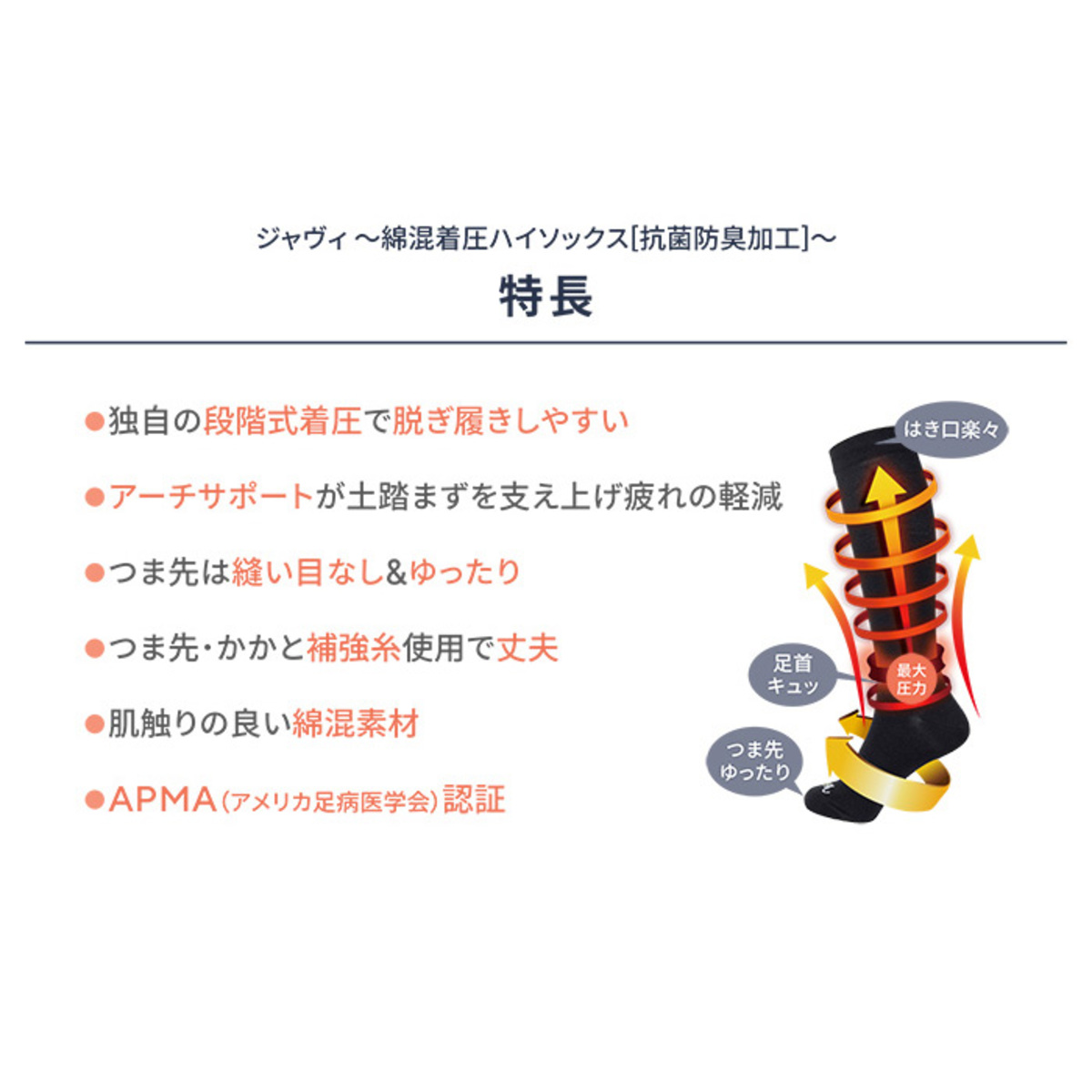 人気のフラットバレエシューズブランド"ジャヴィ"の着圧ソックス。足首を最大圧力とし、ふくらはぎにかけて段階式に圧を弱めた構造でふくらはぎをサポートします
