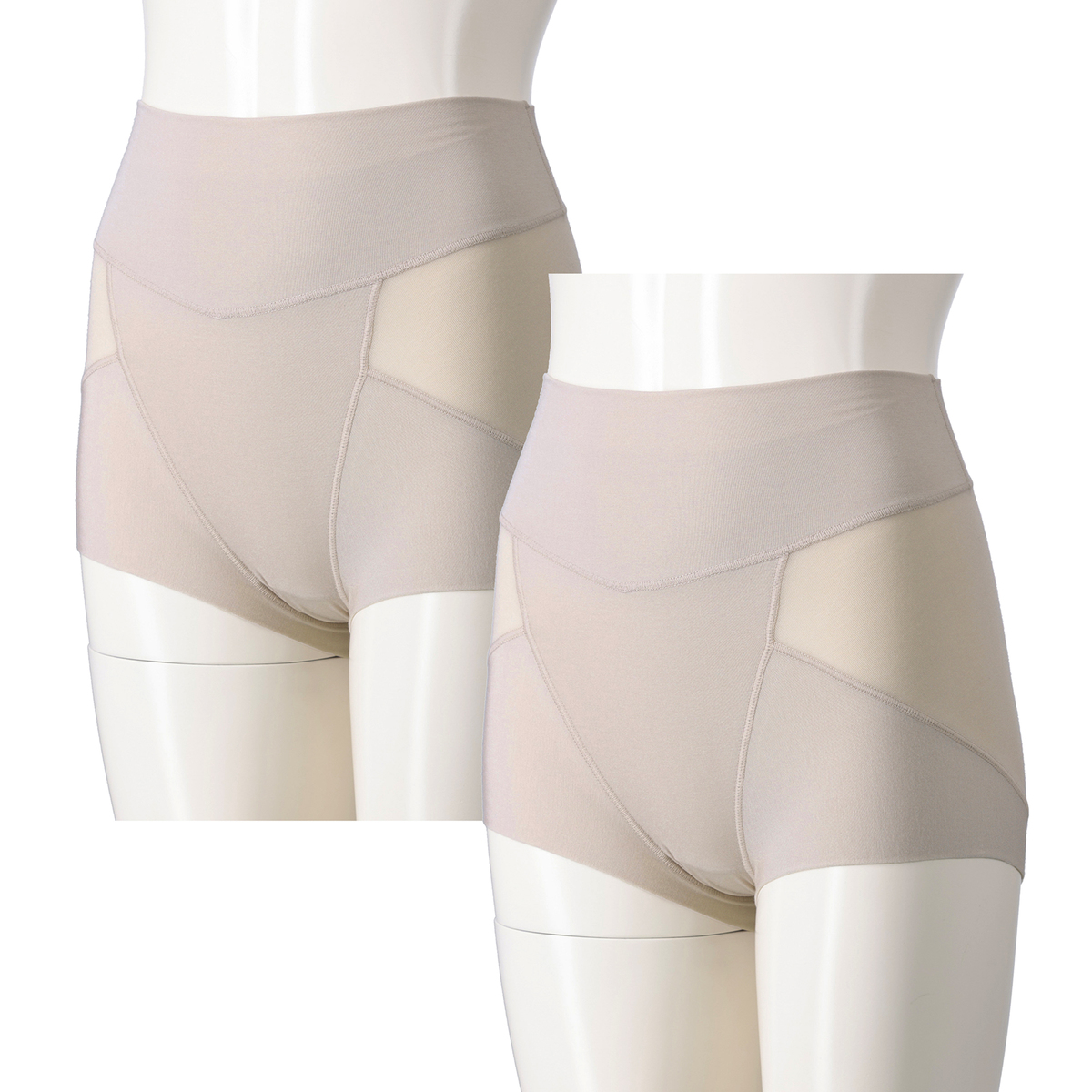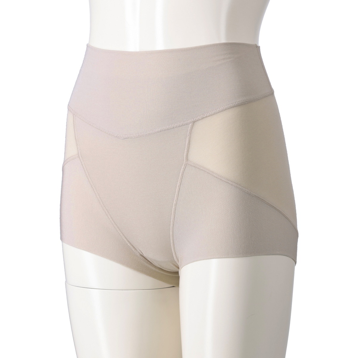 前身頃はソフトに伸縮する身生地の二重構造でお腹押さえをサポートし、ヒップと太ももの境目にあるパワーネット素材の「たれ尻サポートパネル」がお尻を下から支えます