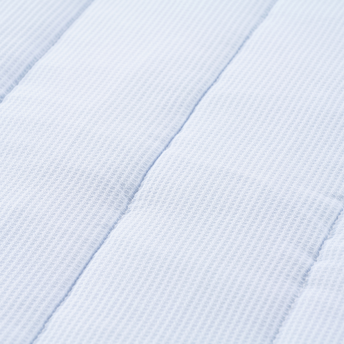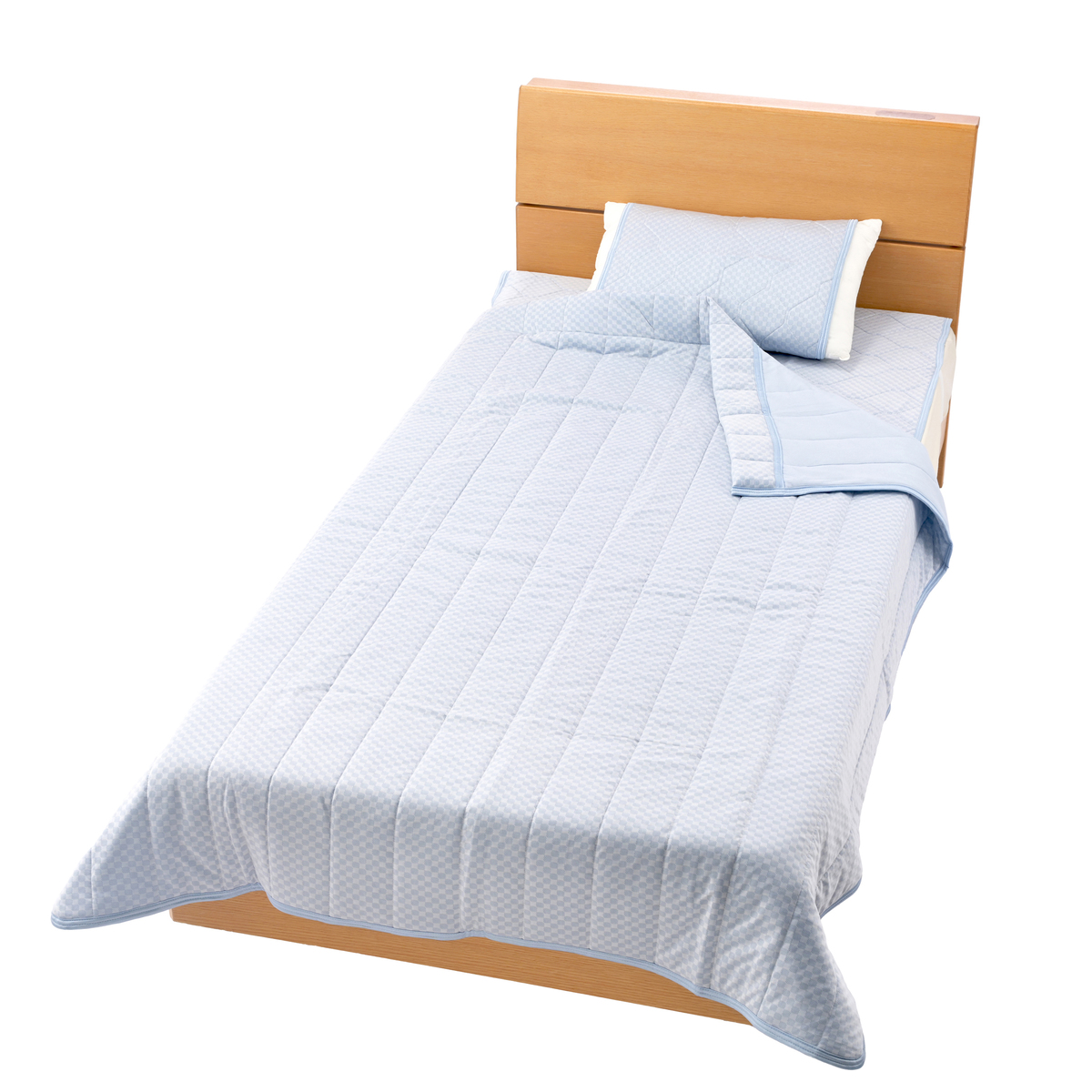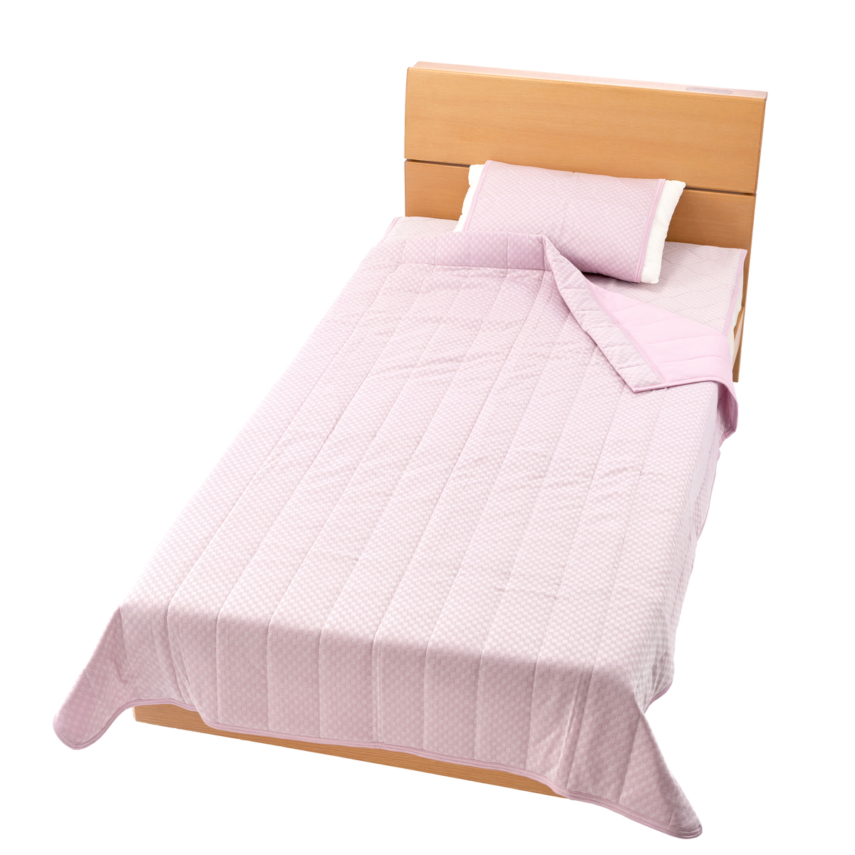 敷きパッド、ピローパッド、ケットの寝具3点セット。ご家庭の洗濯機(ネット使用)で洗えるので、いつでも清潔にお使いいただけます。ケットは両面使用できるリバーシブルタイプです