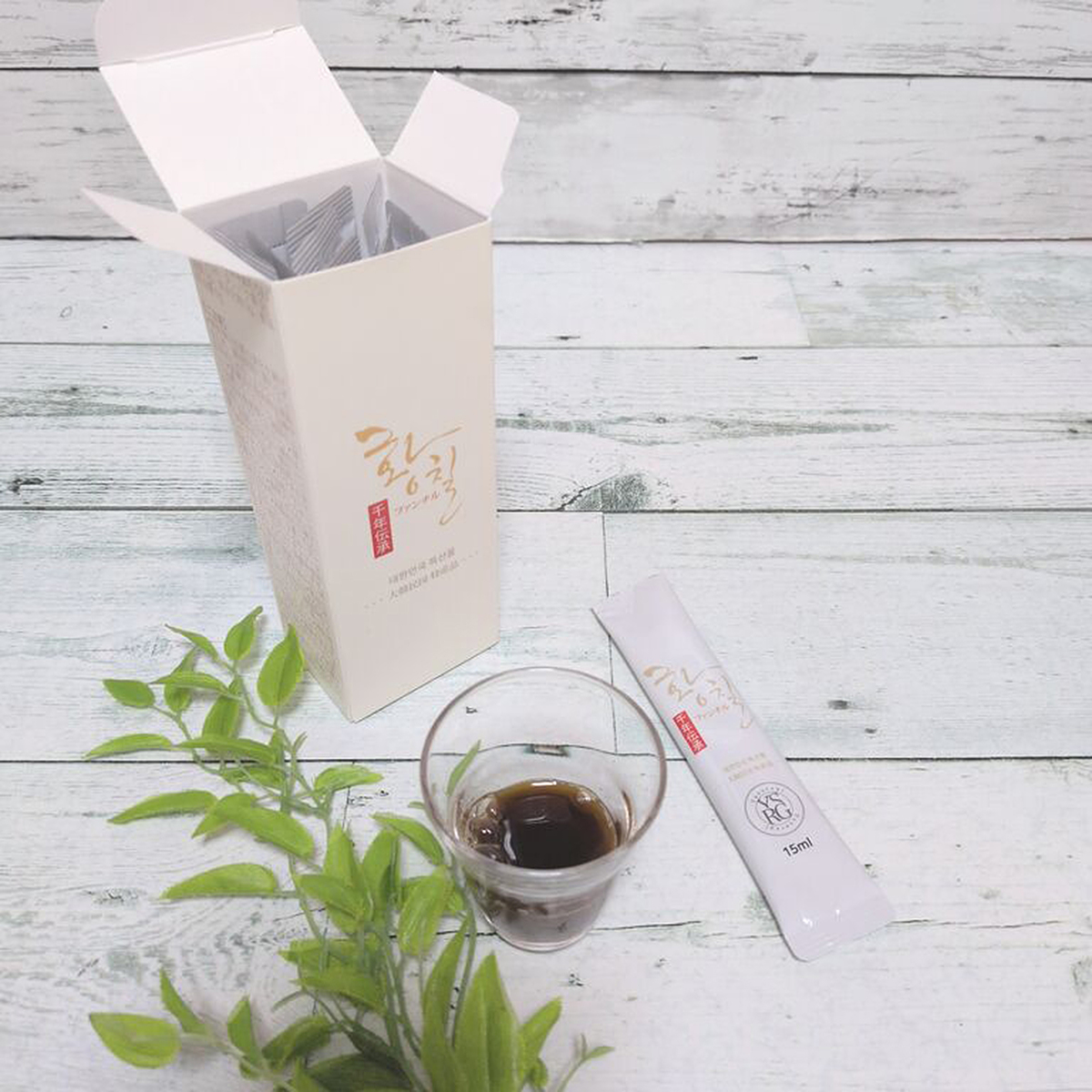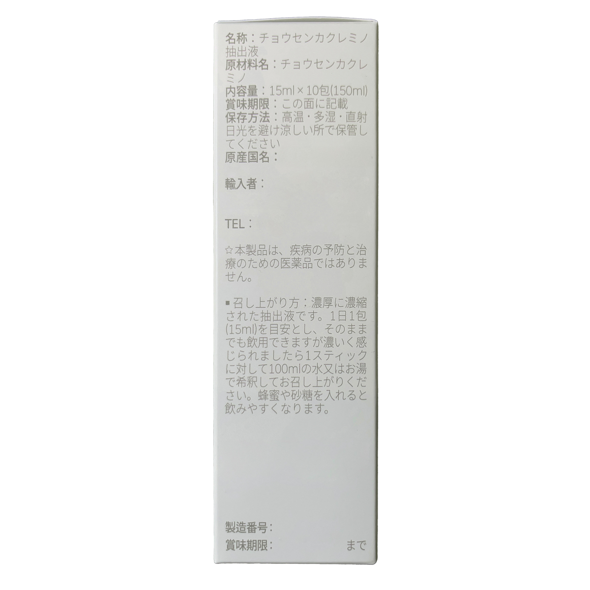 [アレルギー物質特定原材料8品目] なし [内容量] 15ml×10包 [目安量] 1日1包(15ml) [保存方法] 高温多湿、直射日光を避け涼しい所で保管してください [お召し上がり方] 濃厚に濃縮された抽出液です。1日1包(15ml)を目安とし、そのままでも飲用できますが濃く感じられましたら1スティックに対して100mlの水又はお湯で希釈してお召し上がりください。蜂蜜や砂糖を入れると飲みやすくなります [注意事項] ※開封後は品質の変化を避けるため、賞味期限に関わらずお早めにお召し上がりください ※医薬品の服用時は摂取に注意してください ※治療中の方はお医者様とご相談のうえおめしあがりください ※体質、体調に合わない場合はご使用を中止し医師にご相談ください ※パウチのまま電子レンジで加熱しないで下さい ※食物アレルギーのある方は召し上がらないでください ※お子様の手に届かない所において下さい ※商品の性質上、沈殿物が出来る可能性がありますが、植物固有の成分ですのでよく振って御飲み下さい ※開封時には手を切らないように御注意ください ※液体ですので開封時に飛び出さないようお気を付けください ※体質、体調、飲みすぎによりお腹がゆるくなることがあります ※本製品は疾病の予防と治療のための医薬品ではありません [原産国] 韓国 [原材料] チョウセンカクレミノ