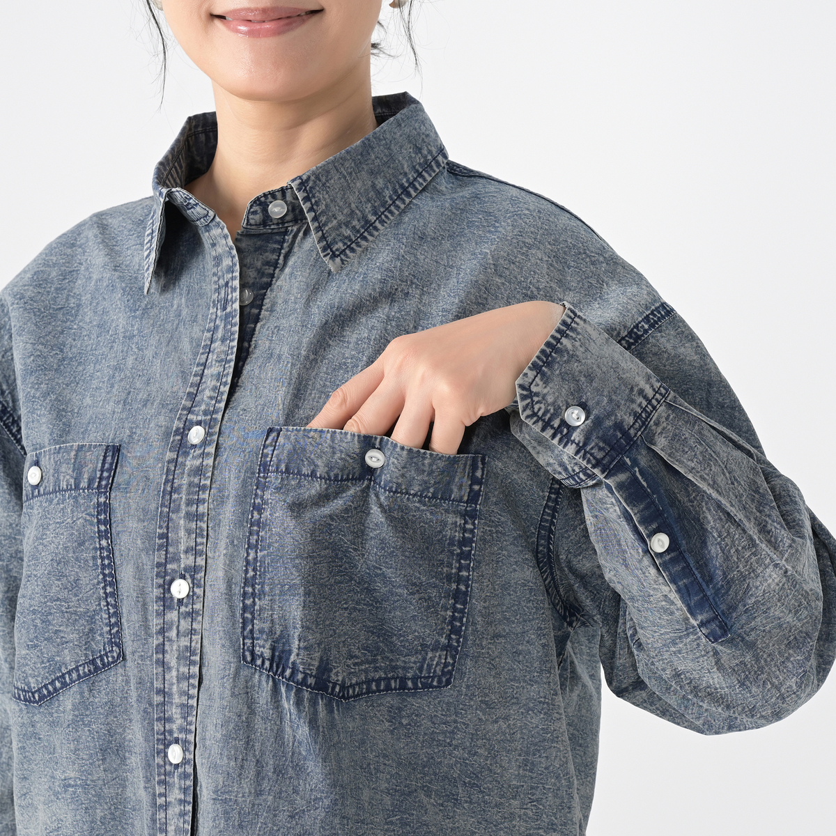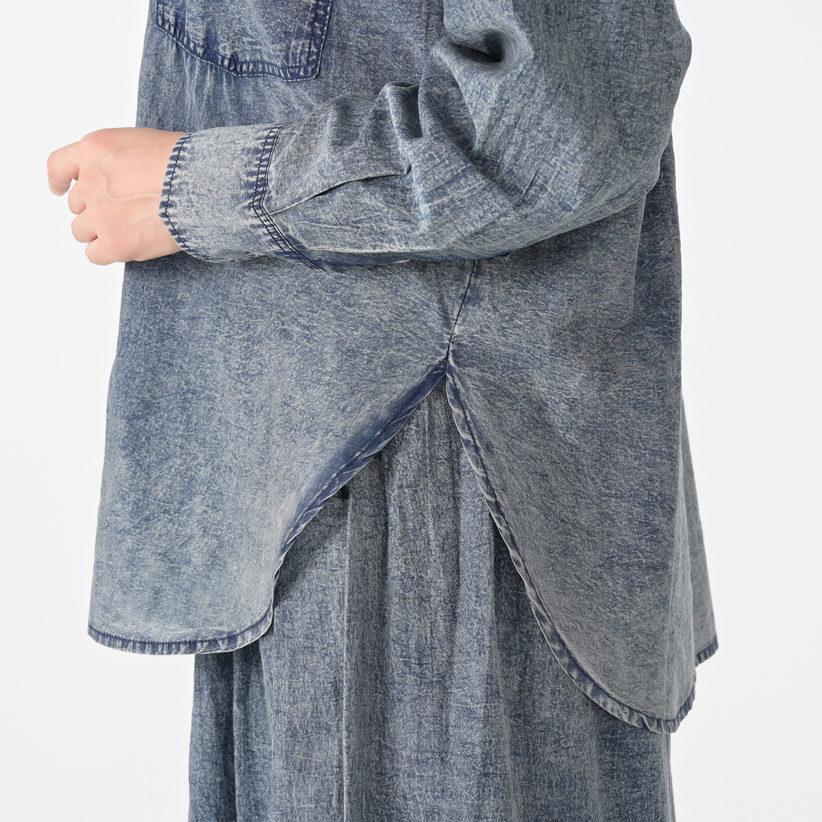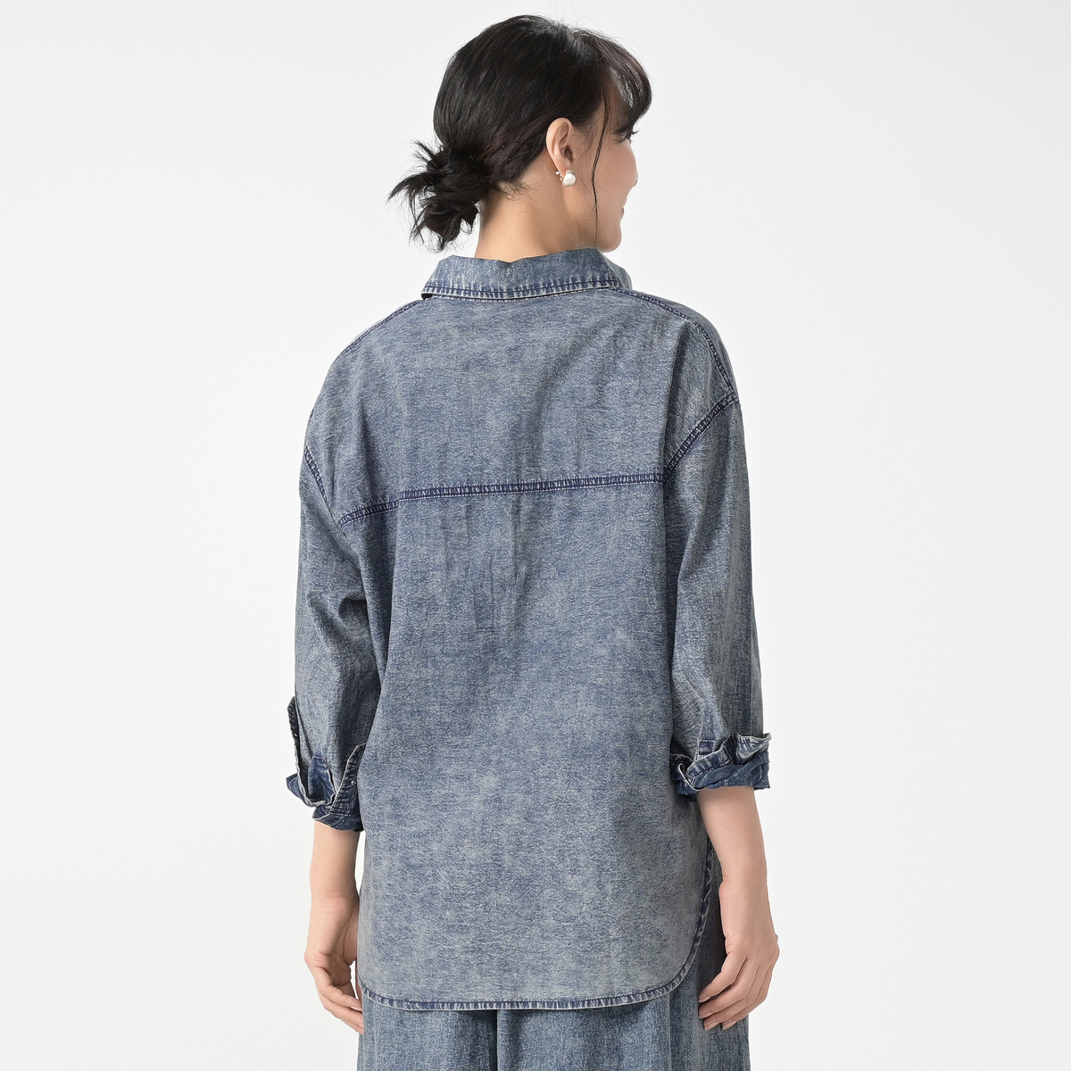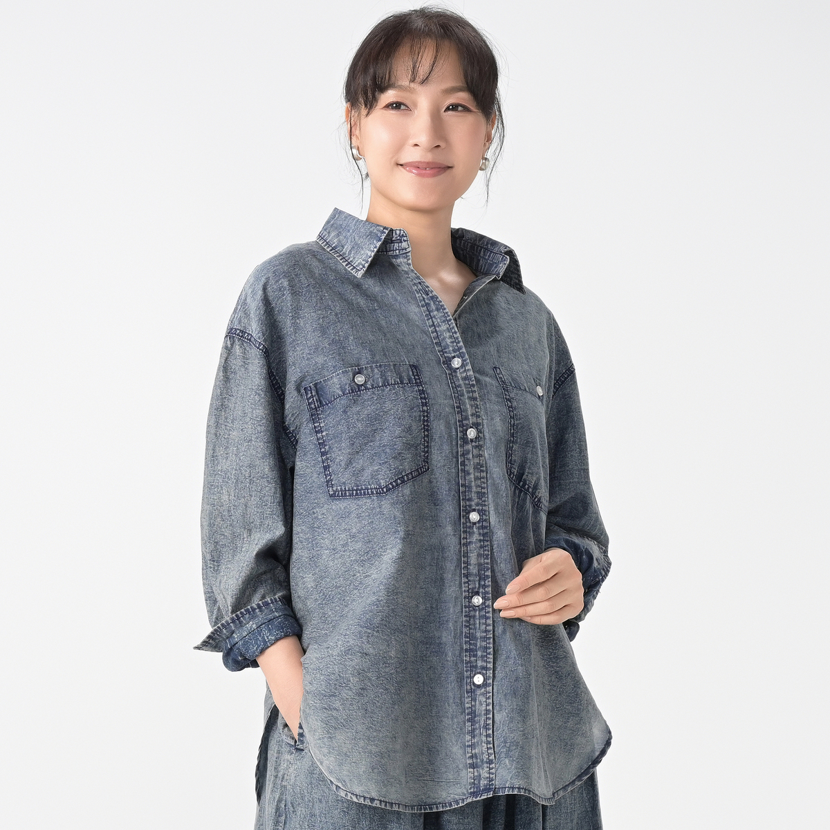 レギュラーカラーのゆったりとしたシルエットで、ボタンを閉じてシャツとしても、開けて羽織りとしても活躍。深めのラウンドの裾が動きやすさをプラスし、軽快な印象を与えます