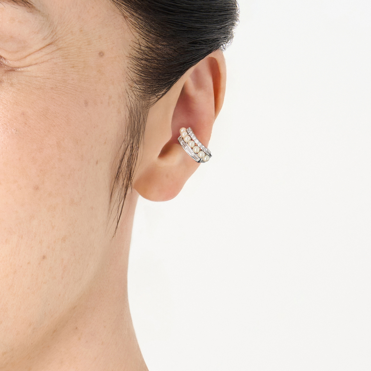 樹脂パールとキュービックジルコニアをあしらった洗練されたデザイン。大人にふさわしい上品さと落ち着いた雰囲気が漂います