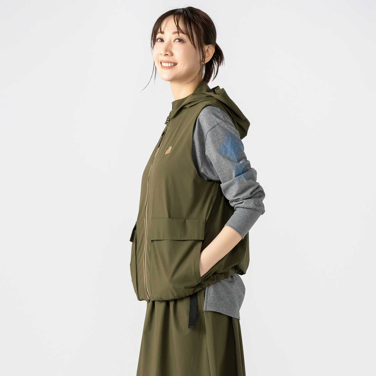 ベストのようなスリーブレスデザインのパーカー。幅広のひさしを付けたフード付きで、腰ポケットは上からも脇からも物を入れることができる隠し4ポケット仕様です