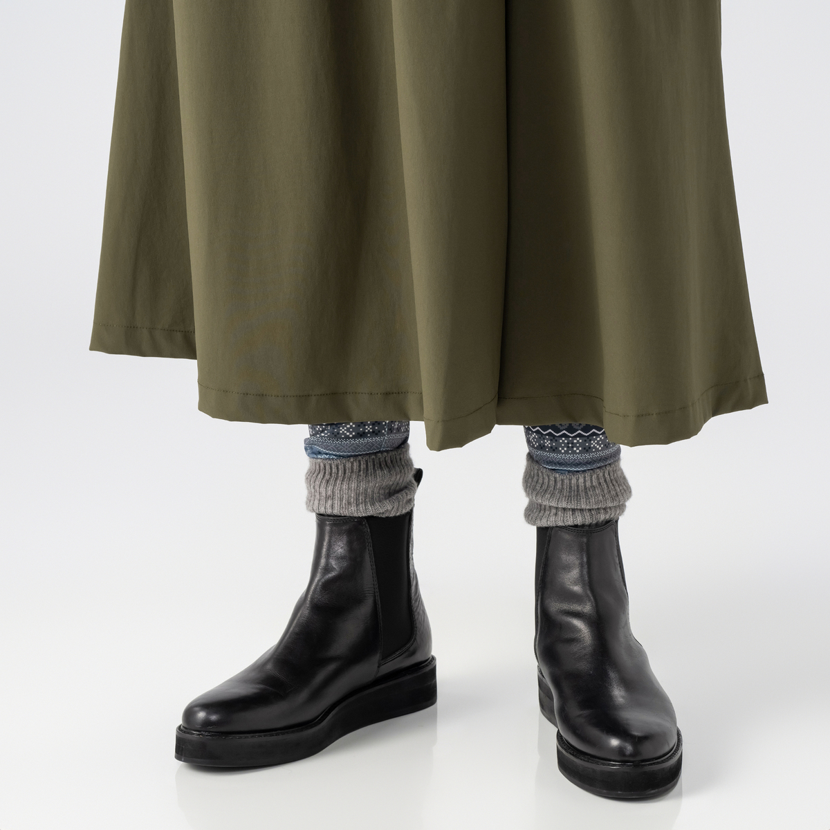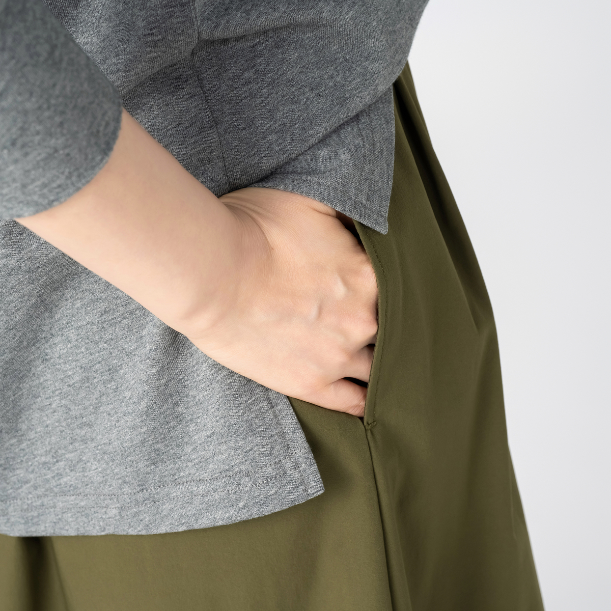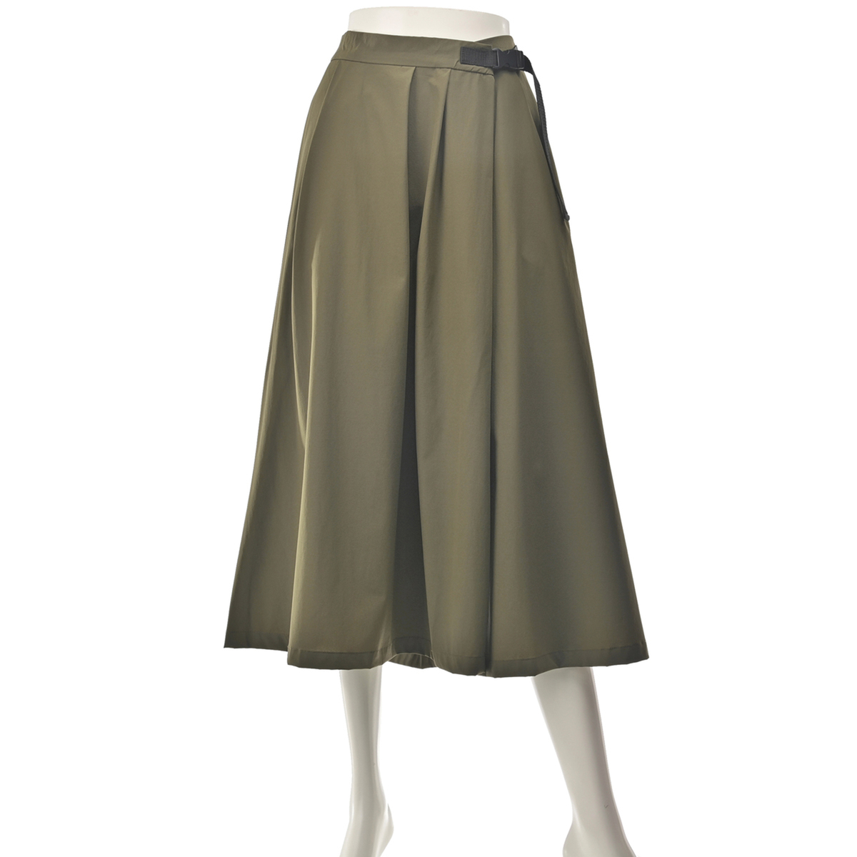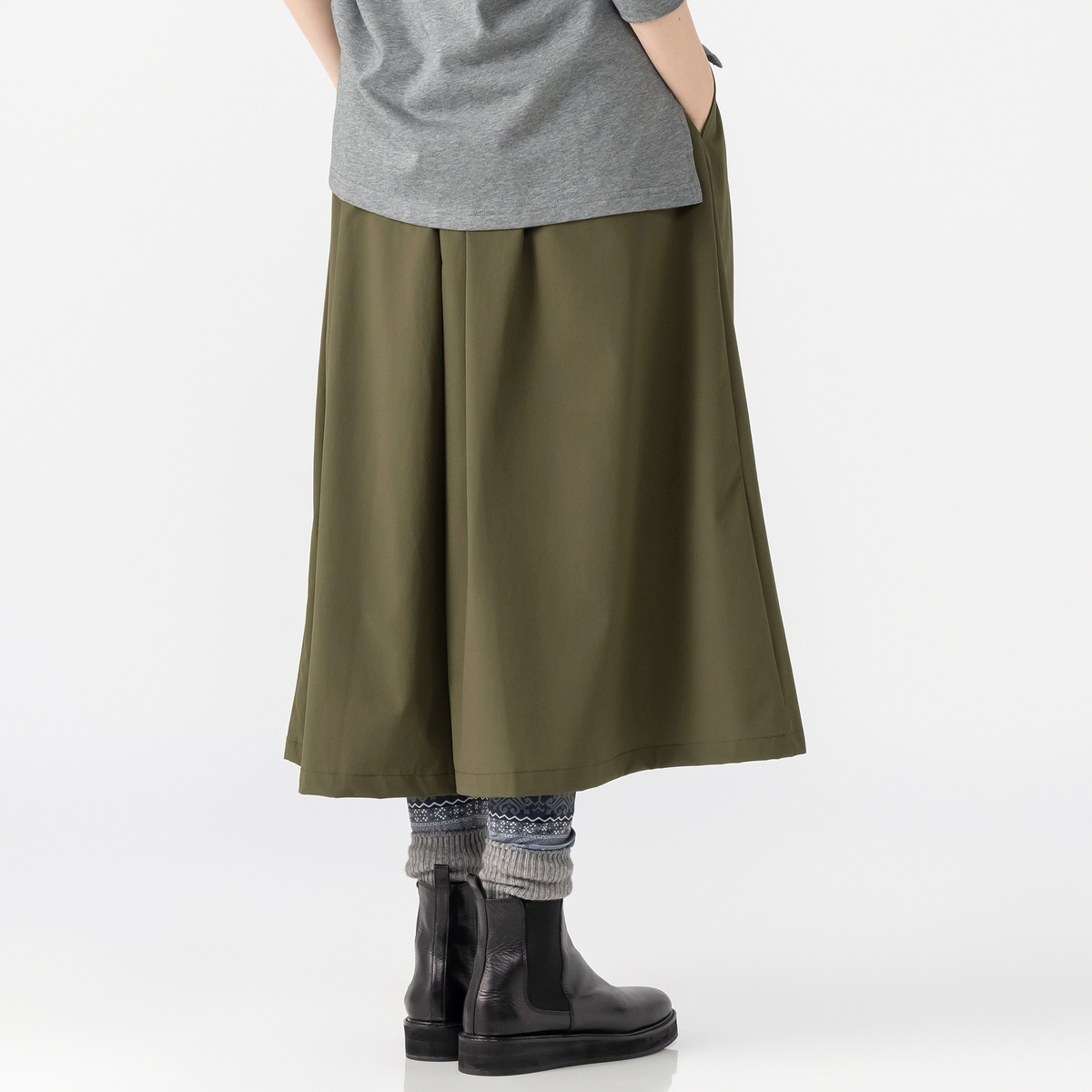 フロントの大きく畳んだタックでラップスカートのように見えるキュロットパンツ。斜めに流れるランダムに取ったタックや前後の脇側にもタックを入れ、ふんわりとした分量感でスカート派の方にも穿きやすいアイテムです