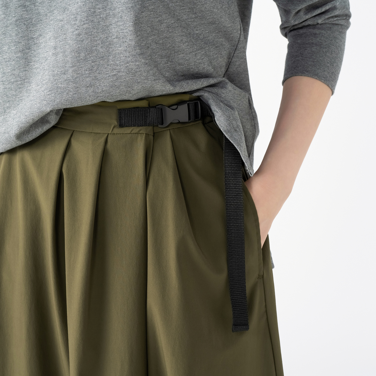 高密度でキックバックの良い柔らかなナイロン混ストレッチは、撥水性があり、UV、防汚、防シワ、防花粉性があるマルチエフェクト素材です。前ベルトは内掛けボタンとポリエステルテープベルトでしっかり固定し、後ろはゴム仕様。左右にはスラッシュポケット付きです