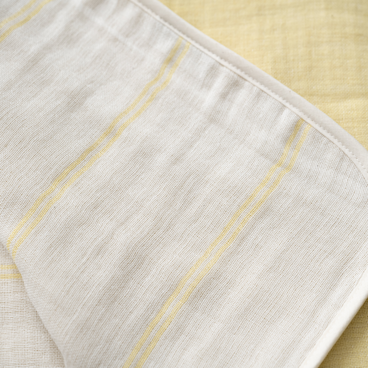 表はシンプルな無地、裏はボーダー柄のデザインで、気分やインテリアに合わせて使い分けできます。ガーゼの産地、三河(愛知県蒲郡市)で生産しました