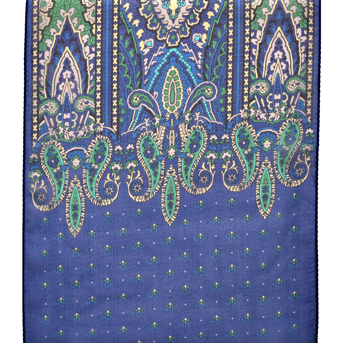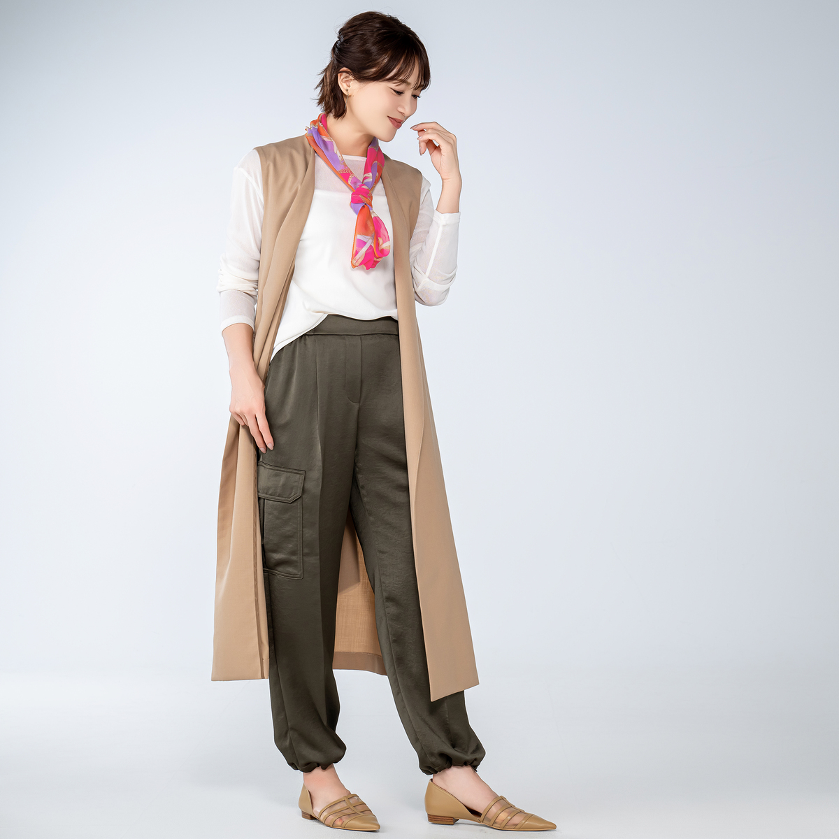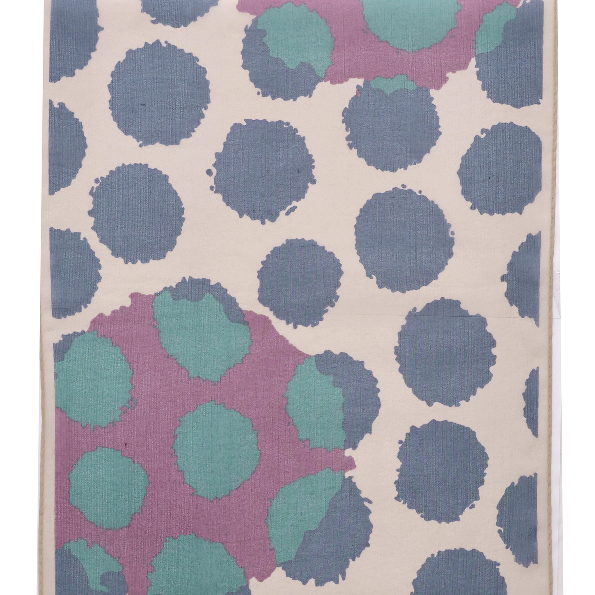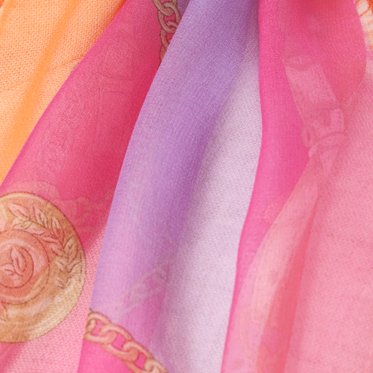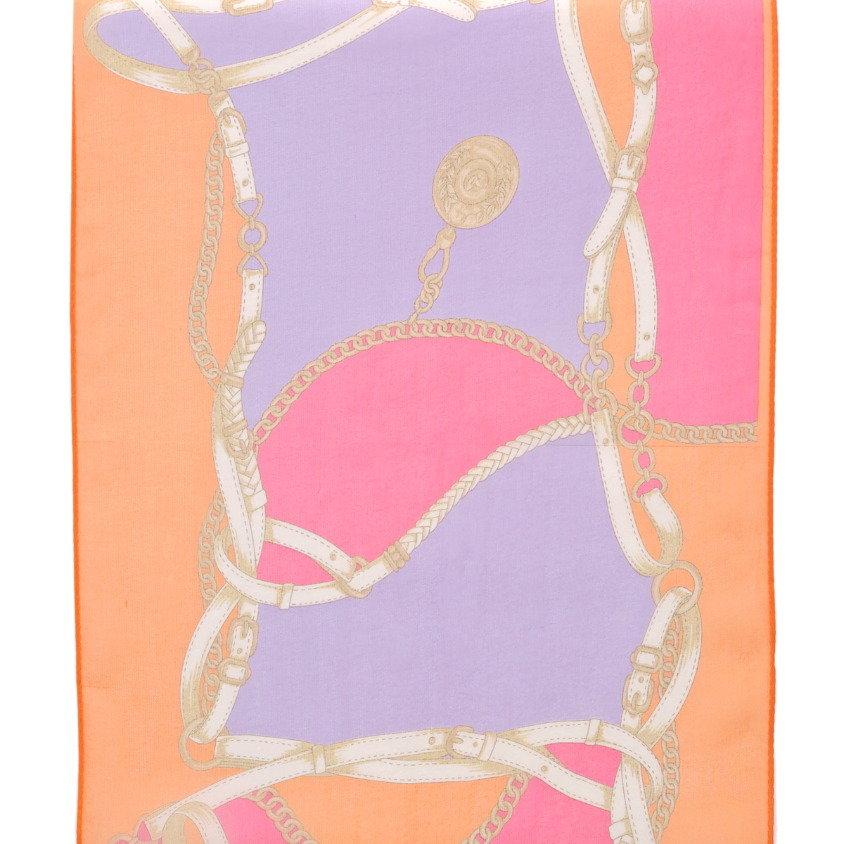 手捺染は、多数の版を色の数分重ねてプリントします。全体がループ形状なので、はだけ落ちたり崩れたりせず、リボン風、二重巻き、アスコットタイ風、ハンドバッグに巻く等、多彩なアレンジが楽しめます