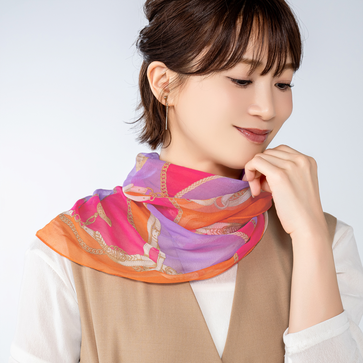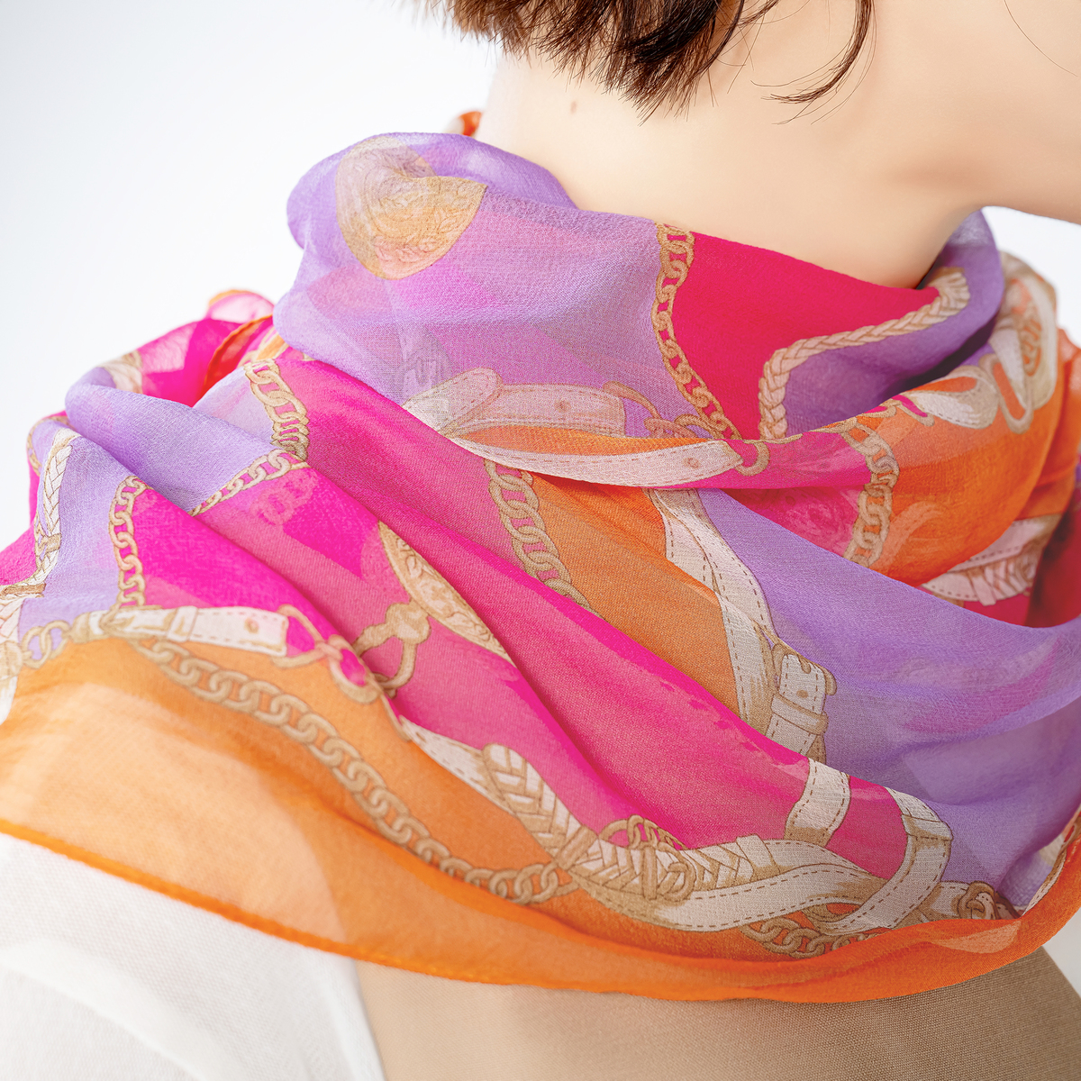 ループ状に加工した、スヌードのように使用できるシルクストールです。柔らかで透け感のある国産シフォン生地を使用。横浜の職人により、手捺染のシルクプリントで仕上げました。スカーフリングがアレンジのサポートをしてくれます